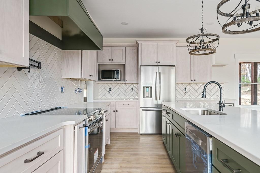 The feel of a full custom home with thoughtful, quality construction and finishes throughout. This modern farmhouse blends Hardie siding with brick for a timeless exterior and welcomes you into an open concept layout designed for both everyday living and gathering. LVP flooring runs through the entire home, and the kitchen stands out with an oversized 11-ft island, quartz and granite countertops, a pot filler, coffee bar, and beverage cooler. The bathrooms are fully tiled, including a primary suite that features a tiled walk-in shower, soaking tub, and a dedicated makeup station with a backlit mirror. The spacious back porch with tongue-and-groove details offers room to relax and enjoy the setting. Every space has been planned with care, delivering the comfort, function, and elevated finishes expected in a true custom-style home.