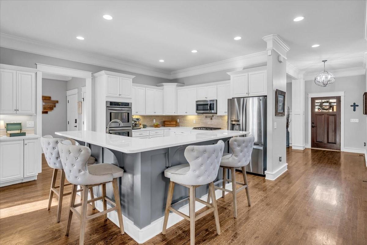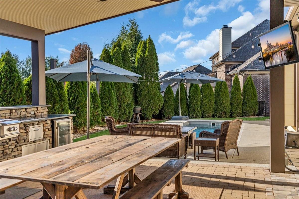Luxury meets family retreat in this beautifully crafted home thoughtfully designed for gathering, hosting, relaxing and enjoying every chapter of life. From the moment you step inside, you’re greeted with warm hardwood floors and carefully curated details, exquisite trim and custom molding. The primary suite, privately tucked away, is one of two bedrooms conveniently located on the main level. A second en-suite bedroom is perfect for an office, multigenerational living or nursery. In the heart of the home, the exceptional gourmet kitchen is designed everyday living and entertaining featuring two expansive walk-in pantries, custom cabinetry, granite countertops and oversized island that seats six, farmhouse sink, gas range with a pot filler and a thoughtfully plumbed cabinet for an ice machine. Stunning cedar beamed ceilings in the family room and primary bedroom add warmth and architectural charm, while the ventless gas fireplace adds inviting ambiance. Upstairs, three additional bedrooms, two en-suite, have abundant storage in addition to large closets. A spacious bonus room with a wet bar creates the perfect retreat for recreation or a private theater. The covered built-in outdoor kitchen boasts a Blackstone, Komodo Joe, gas burners, and two refrigerators is an entertainer’s dream. Whether playing volleyball or taking laps in the 4.5 ft deep pool, sitting by the fire table or clipping herbs from the garden nook, this outdoor space is designed to make lasting memories. The three-car garage features a pristine epoxy floor and custom built-in cabinetry. Stay organized with a charming mudroom drop zone, large laundry room with a sink, and two additional downstairs closets. Alice Circle Cherry Grove subdivision is within walking distance to Spring Station Middle School and Summit High School, with sidewalks leading all the way to June Lake. Located in a highly sought after neighborhood, but situated on a circle that enjoys little to no traffic and great neighbors.