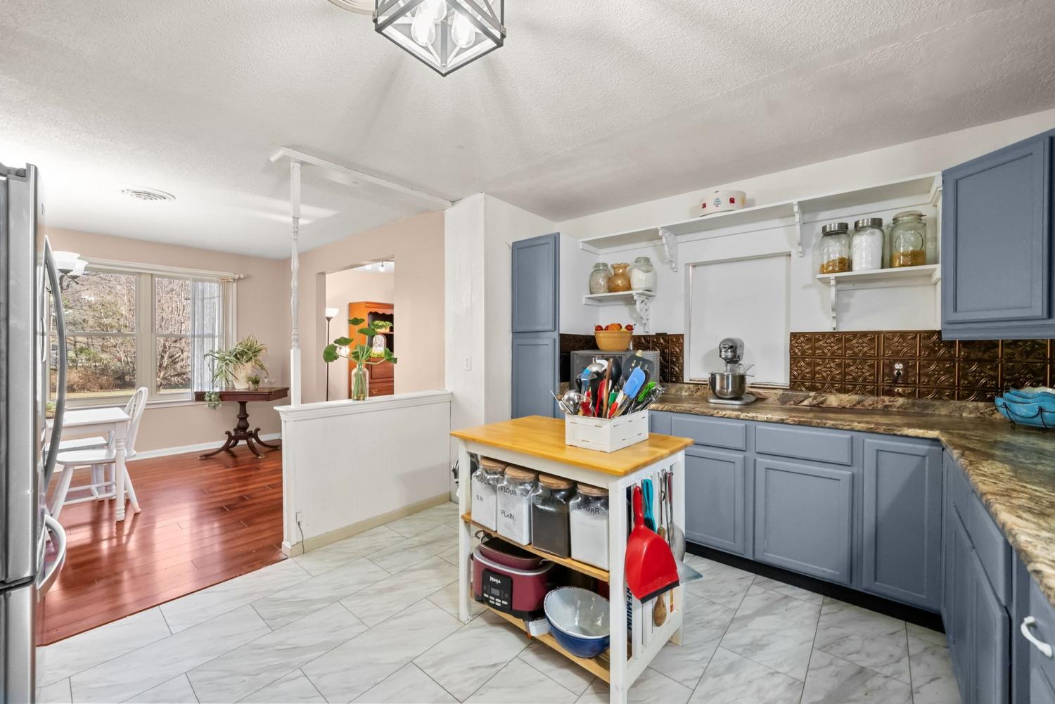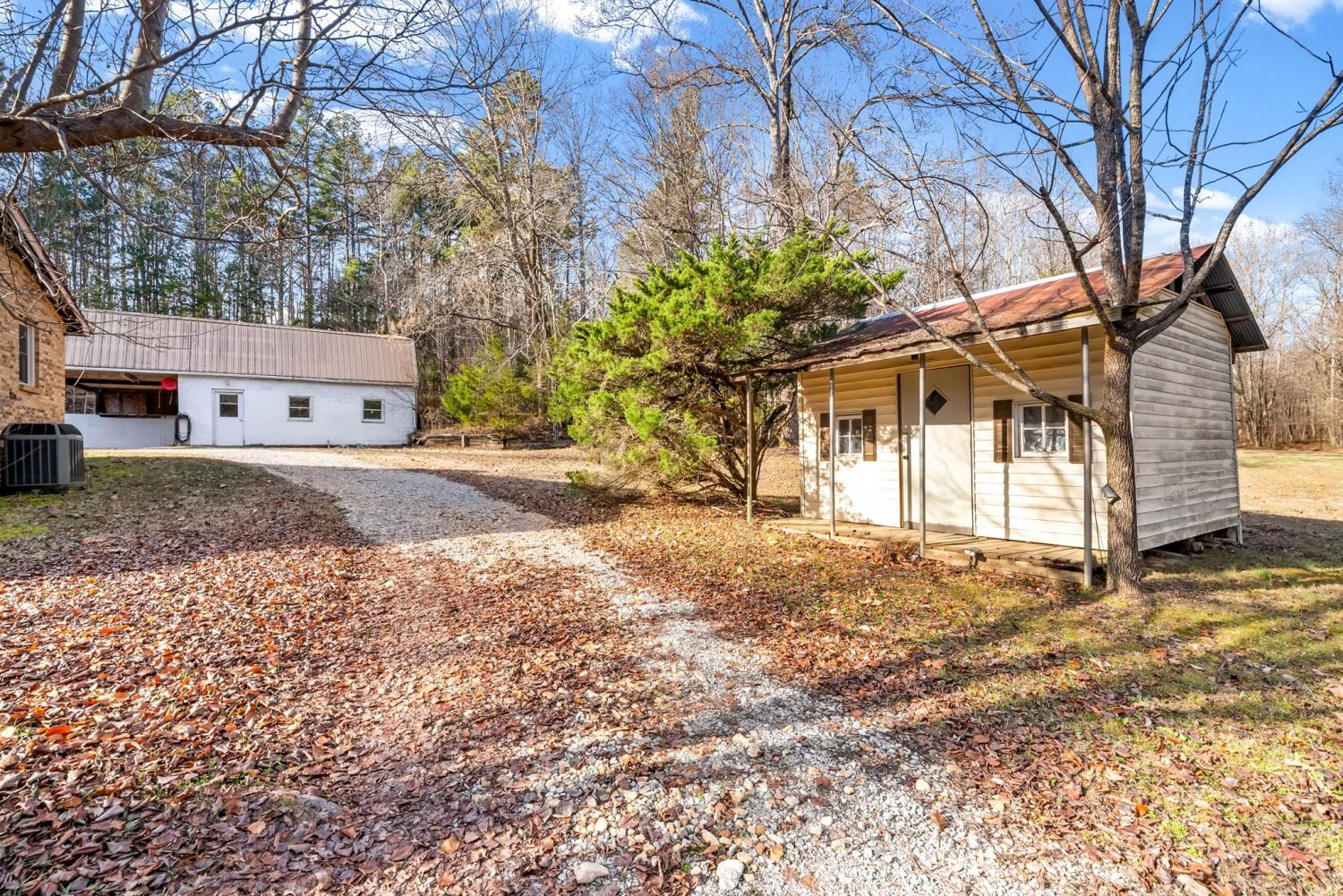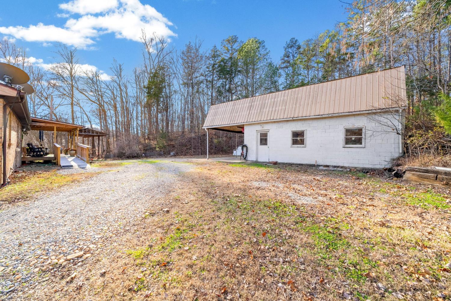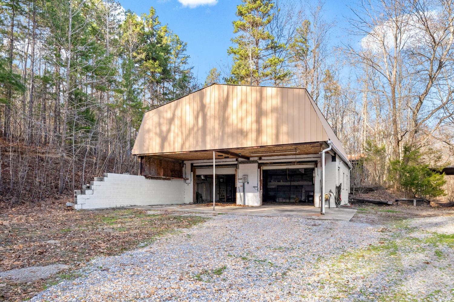 Your peaceful country charmer is waiting here on this 5.04 acre tract. Wet weather creek to the front of the property, circle drive around the home, covered back deck to sit back and relax with handicap ramp access from driveway, carport at lower level, double detached garage/workshop, RV carport, second utility carport, she shed and storage buildings are waiting. Maintained home with partitioned and unfinished basement with walk out door and room to expand, along with a flue access for the wood burner. Addition was made several years ago to create the large gathering room, leaving the new located dining room. *1 Bedroom was used on the main level to bring the laundry room/office/pantry to the main level...which could be reversed if you need the third bedroom*. Lovely acreage with wooded tree line to the side and wooded all to the back being ideal for the hunter/trail walker. Access metal bridge over the creek created with steel beams, so no worries there. Survey in place. Low property tax and country living awaits.