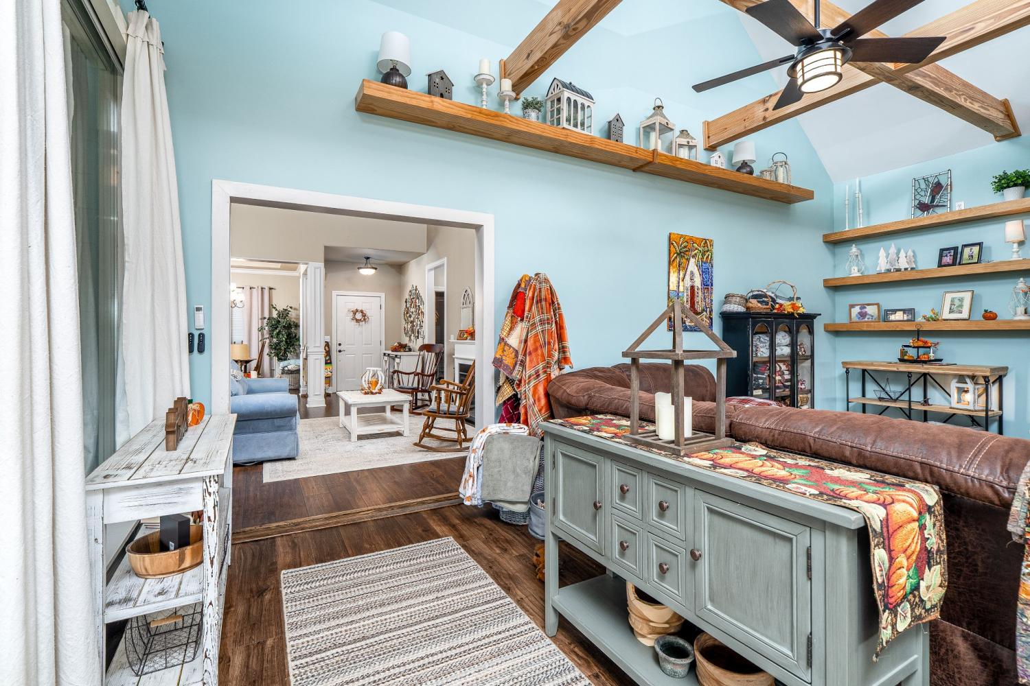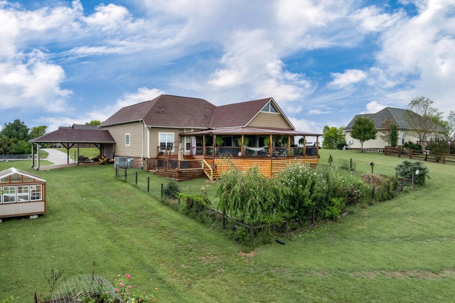 Set in one of the area’s most coveted communities — Sweetwater Estates, this NO HOA 3-bedroom, 2-bath retreat sits on 1.05 acres and is the only home on the street with unobstructed hillside views—perfect for taking in breathtaking Tennessee sunsets from your own backyard. (SEE VIDEO LINK IN FEATURES). The heart of the home is the custom-built den with vaulted ceilings, exposed pine beams, and a granite-hearth fireplace. Two sets of large glass doors open wide to the outdoors, while floor-to-ceiling windows flood the space with natural light. Remote-controlled blackout curtains let you shift from bright and open to cozy and private. Beyond the den, step out onto the massive covered back deck—spanning almost the entire back half of the home. With a durable metal roof, wired Edison bulb lights, and enough space to serve as it's own outdoor living and entertainment area, it's the perfect spot for dinner parties, quiet mornings with coffee, or relaxing evenings in the jacuzzi while the sun sets behind the hills. The home also features high-end waterproof laminate flooring throughout, a 4-year-old HVAC, and all appliances—including washer and dryer—convey. Outside you'll find: - An absolute Chicken DREAM setup: - 20x10 coop, - 10x30 run, and 30x30 fenced area. The seller will even leave a few chickens for fresh eggs :) - 10x16 greenhouse for year-round gardening. - 12x20 barn for storage, projects, or hobbies. - expansive carport beside attached 2 car garage All of this, with no neighbors behind or to the right gives you the privacy you've been deserving. This home isn’t just a property to see—it’s one to experience. Truly a one-of-a-kind Tennessee treasure just waiting on you to walk through. :)