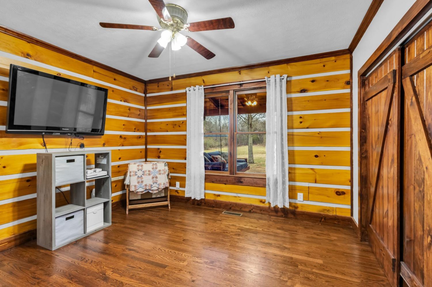 Welcome home to peaceful country living in this beautifully maintained log home. Nestled on 5 spacious acres, the property features expansive covered front and back porches stretching the length of the home—perfect for relaxing and enjoying the serene surroundings. Inside, the open-concept design showcases vaulted ceilings, stunning wood floors, and timeless rustic charm. The kitchen offers custom detailed cabinetry, granite countertops, an eat-in dining area, and additional seating at the island—ideal for everyday living and entertaining. The main suite features a large walk-in closet and a private bath with gorgeous tile flooring, double vanities, and a walk-in shower. Two additional bedrooms and a full bath provide comfortable space for family or guests.