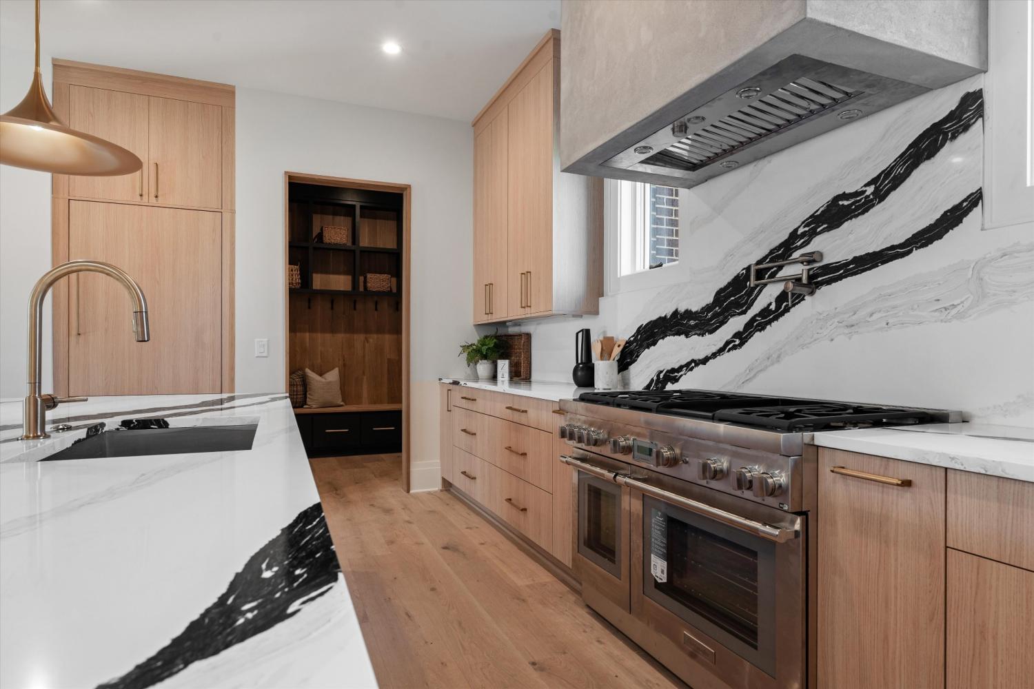 Set privately on a terraced site with a private, level backyard, 822 Sutton Hill is a composed modern residence that feels quietly removed—yet sits just moments from the energy of 12 South. Built by JBT Builders, the home balances architectural precision with warmth, layering clean lines, natural materials, and carefully framed light throughout. Wide-plank white oak floors, tailored millwork, and generous ceiling heights define the main level, where living spaces flow effortlessly to the outdoors. The kitchen is both sculptural and highly functional, finished with slab marble surfaces, custom cabinetry, professional-grade appliances, and a substantial island designed for daily living and relaxed entertaining. A discreet scullery and walk-in pantry add depth and utility without interrupting the home’s clean visual rhythm. Bedrooms are intentionally calm and well proportioned, complemented by baths that feel restorative rather than performative—stone underfoot, custom vanities, thoughtful lighting, and glass-enclosed showers designed for everyday rituals. The primary suite offers views to the backyard, a serene bathing environment, and a fully fitted dressing room that feels complete and considered. Outdoors, a covered living terrace with fireplace, built-in grilling station, and resort-style pool create a private setting rarely found this close to town. A three-car garage includes a dedicated show-car bay alongside space designed to accommodate lifts. Across the street, Browns Creek Park offers 13 acres of trails, water, and wildlife, while the restaurants, shops, and cafés of 12 South remain just a short walk away—an uncommon balance of walkability and seclusion.