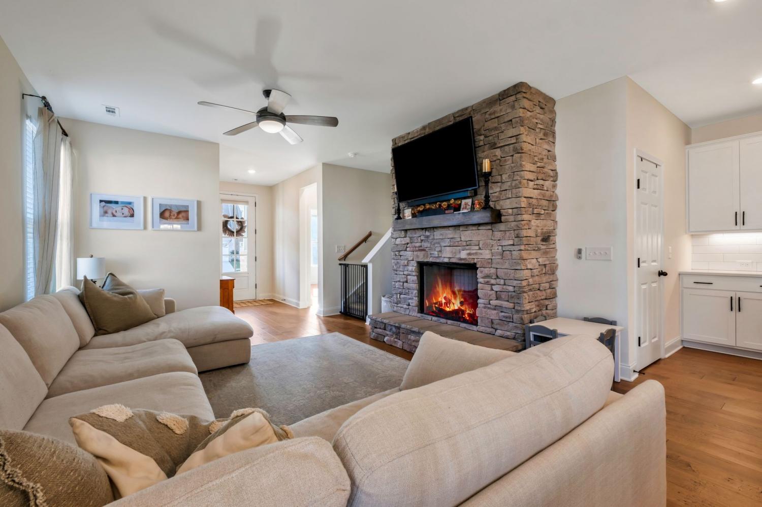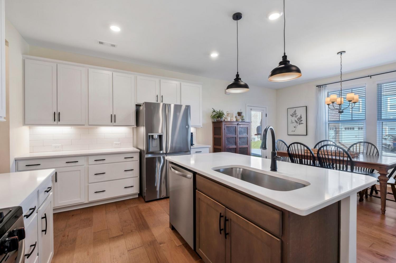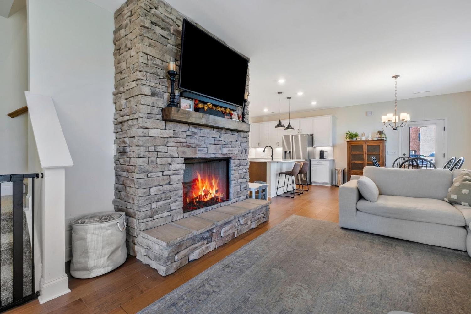 Discover modern living in The Preserve at Belle Pointe with this beautifully designed Hunter floorplan, built in 2023 and loaded with stylish upgrades. This 4BR/2.5BA home features a sought-after layout with the primary suite conveniently located on the main level, while upstairs offers three additional bedrooms, a full bath, and a spacious bonus room—perfect for a playroom, media room, or home office. The bright, open kitchen is a showstopper with quartz countertops, stainless steel appliances, farmhouse sink, a gas range, tile backsplash, dark cabinetry, and recessed & pendant lighting that elevates the space. The living room is warm and inviting with a stacked stone gas fireplace, creating the perfect setting for relaxing or entertaining. Enjoy outdoor living on the covered patio, and appreciate the convenience of a 2-car garage, low HOA fees, and a wealth of community amenities including a clubhouse, fitness center, park, playground, pool, and underground utilities. A stunning, move-in ready home in a vibrant community—this one truly has it all!