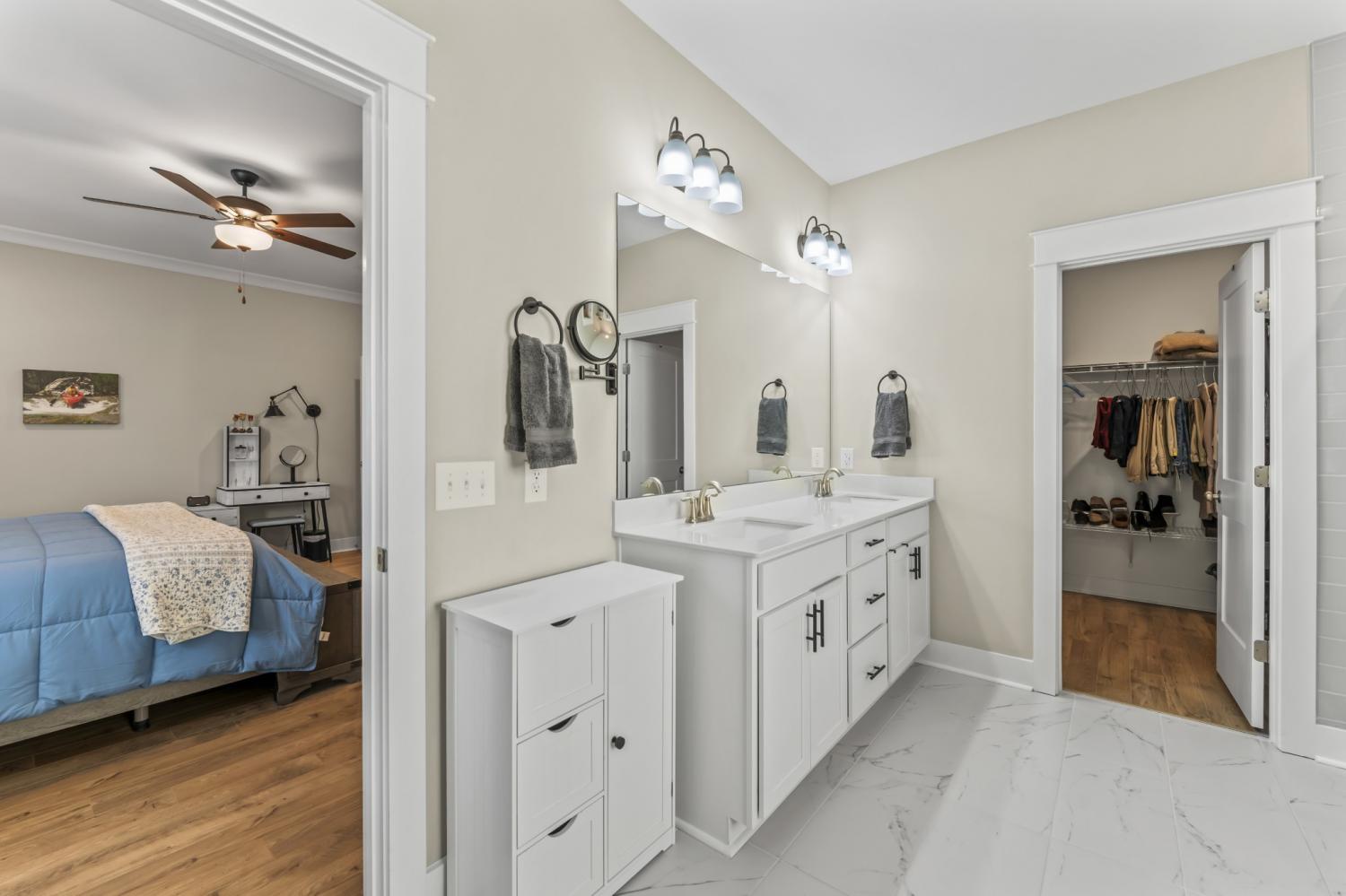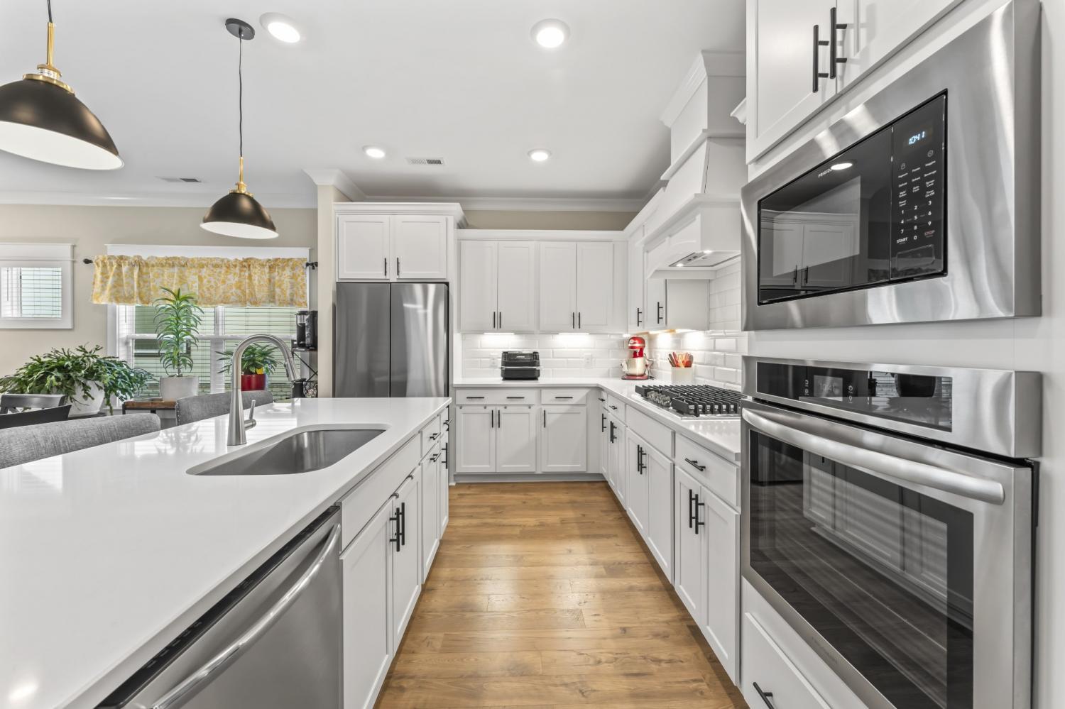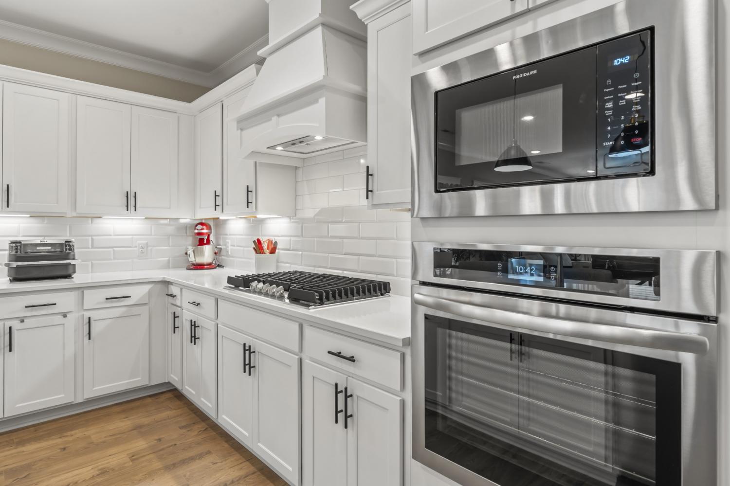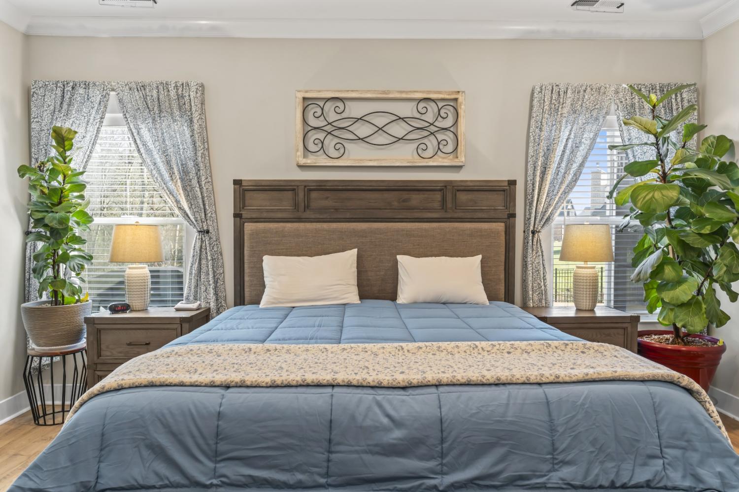 Welcome to this beautifully crafted home in the desirable Shelton Square, built by the reputable Paran Homes & offering 2,516 sf of thoughtfully designed living space. Featuring 4 bedrooms & 3 full baths, this home perfectly balances elegance, comfort, & functionality. The main level boasts an open-concept floor plan with tall ceilings & laminate flooring that resembles warm oak, creating an inviting atmosphere ideal for both everyday living & entertaining. The chef’s kitchen is a true centerpiece, complete with granite countertops, white subway tile, SS appliances, gas range, under-cabinet lighting, & a large walk-in pantry. Just off the kitchen, the laundry room is conveniently located on the main level. The two bedrooms & two full baths located downstairs, include one currently used as a home gym, & the other is the spacious primary suite featuring double vanities, a separate soaking tub, & walk-in tiled shower. Upstairs, you’ll find two additional bedrooms—both with ample closets—an inviting bonus room, & a full bath with linen closet, offering privacy & flexibility for guests or family members. Extra storage can be found in the walk-out attic or large under-stairs closet. Enjoy cozy evenings by the gas fireplace or relax outdoors on the expanded covered & screened patio overlooking a rare & serene 'forever wooded' area that ensures lasting privacy. An elegant wrought iron fence fully encloses the backyard. Additional highlights include Hardy board siding, tankless WH, irrigation system, whole-home water softening system, ADT security system, floodlights on the front & back, & high-speed internet. The two-car garage features insulated doors & smart programmable openers. As part of Shelton Square, residents enjoy access to a community pool, playground, basketball court, clubhouse with fitness center, & scenic walking trails—all maintained by the HOA. This exceptional home blends quality construction, modern amenities, & a vibrant community lifestyle. Welcome!