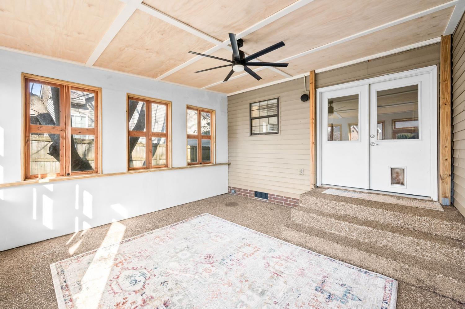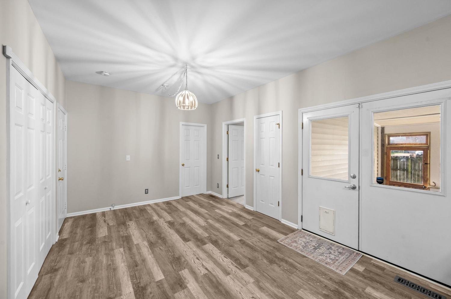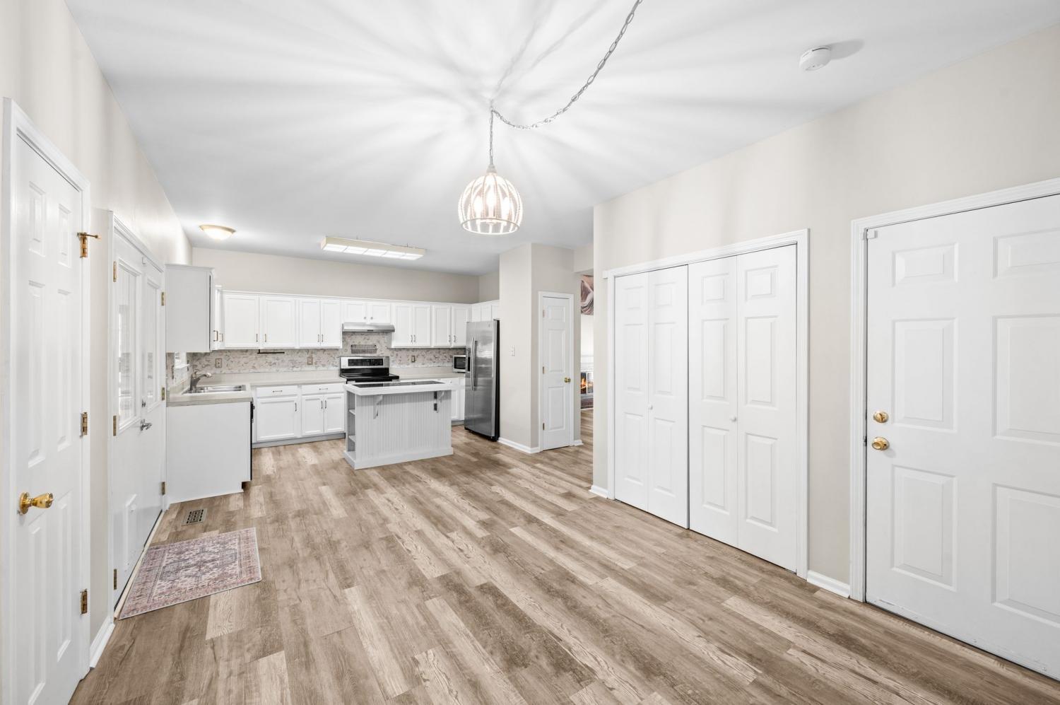 WHITE Kitchen with Island and STAINLESS appliances, LVP flooring on the main level. Primary Suite on the MAIN, DARLING cedar plank door & Insulated PATIO room for year around pleasure, VAULTED ceiling in the living room with WOOD burning fireplace. Expansion area or storage area is a wonderful feature. Washer/Dryer to remain. Located on a corner lot, full PRIVACY fencing in backyard with Mini Metal storage shed. Bring your Dog!!Very convenience to shopping, restaurants and trails and Parks!