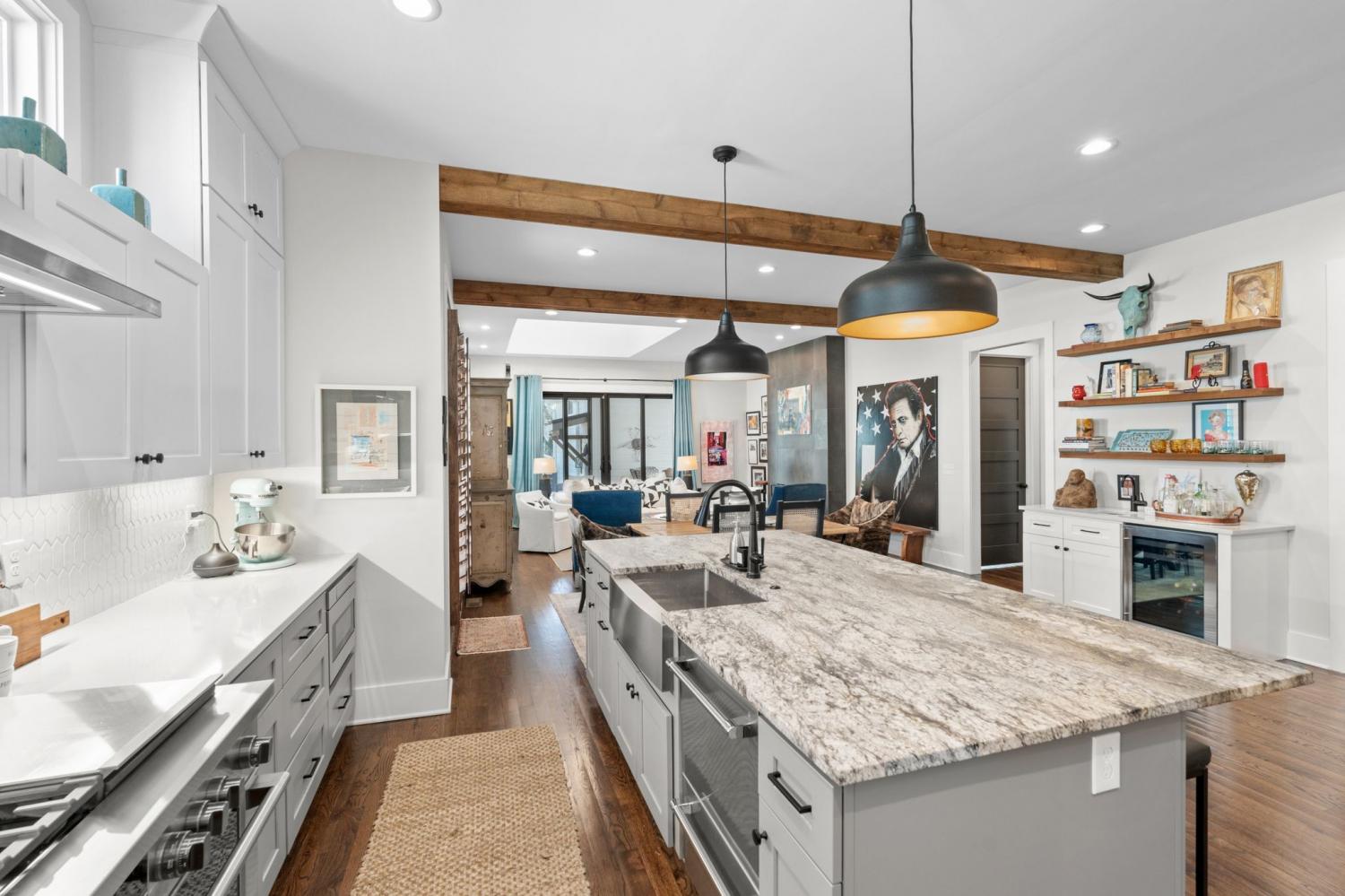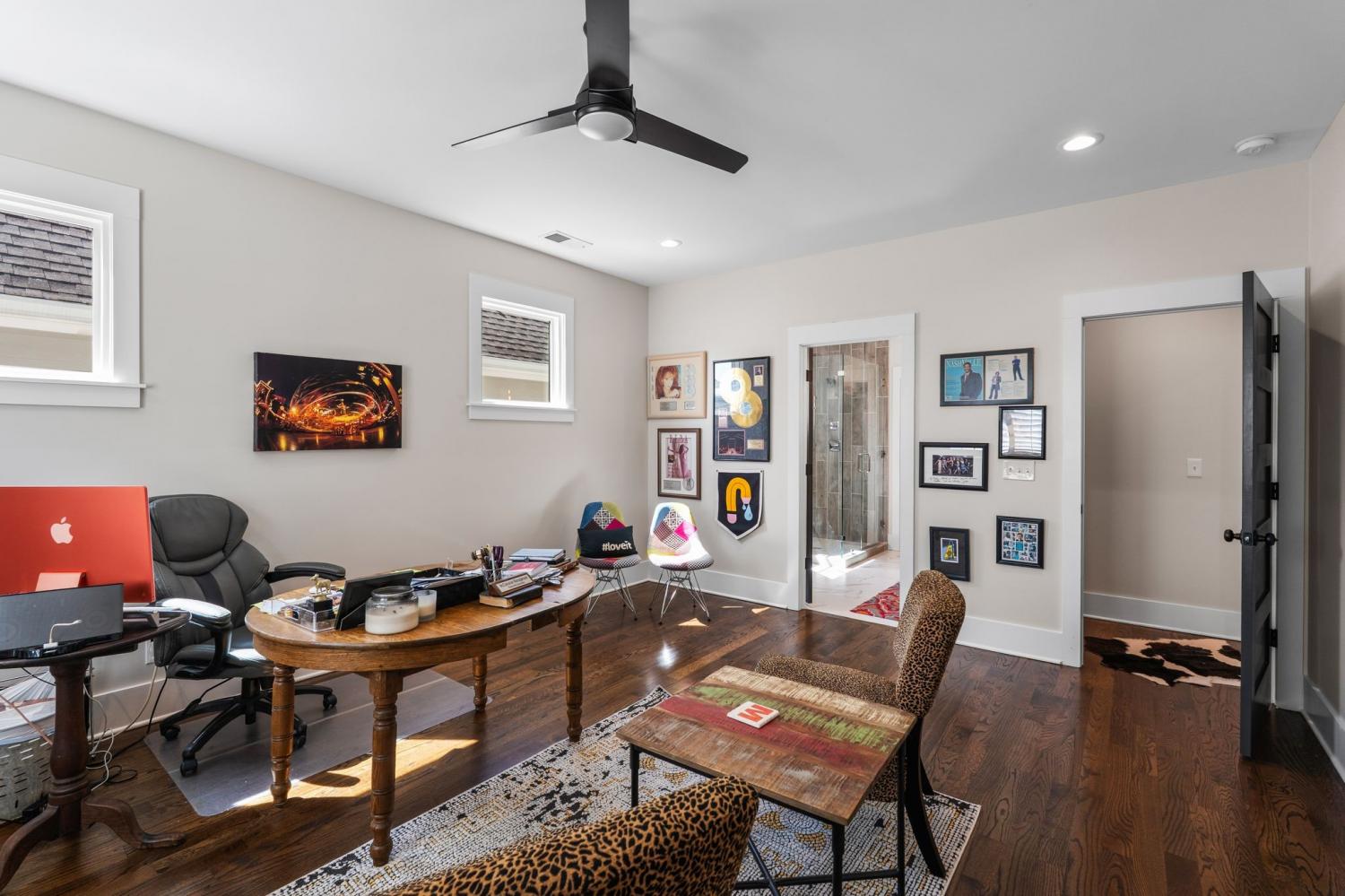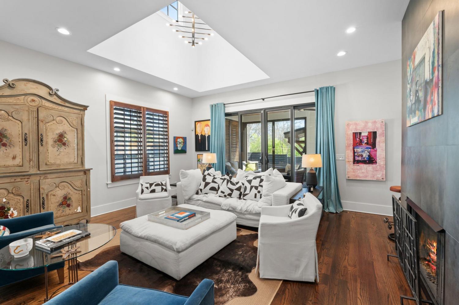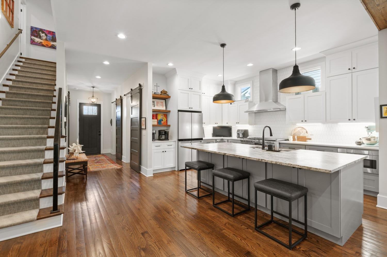 Spacious, contemporary 5 bedroom, 4 bath residence, perfect for single family or multi-generational living with two primary suites. 4018 ft. with 4 defined outdoor living spaces, including screened porch, rooftop deck, small side porch and hot tub on private deck. Fenced yard. Beautiful sanded and stained hardwood throughout, tiled baths. One primary up and one down. Both with walk in closets and laundry. Office space on first floor is currently used as media room. Kitchen is fully equipped with Fisher and Paykel gas stove with two ovens. Downstairs guest room could also be used as separate den. Hugh walk in pantry, a chefs dream, bar with wine fridge and sink, Downstairs primary includes a Toto bidet. 517 sq ft of unfinished area over garage with separate entrance and also entrance from upstairs roof top deck. WITHIN WALKING DISTANCE OF 6 HIGH IN RESTAURANTS , GREENWAY, FARMERS MARKET, TENN GROWN MARKET. Security camera in kitchen will be turned off when house is shown.