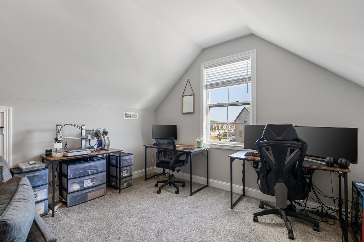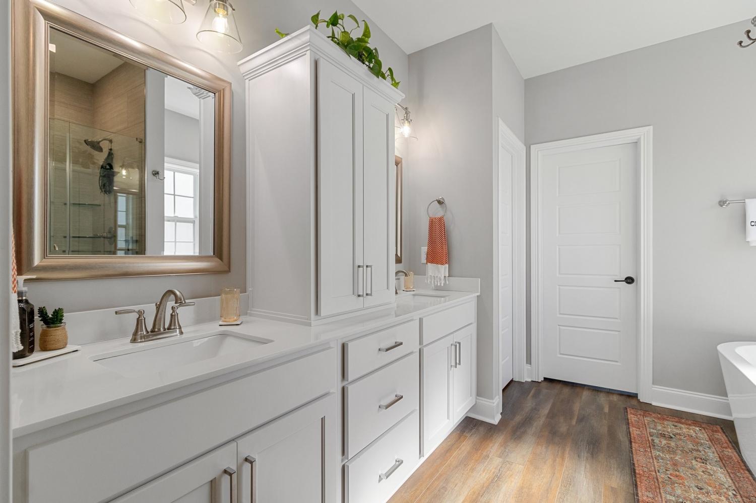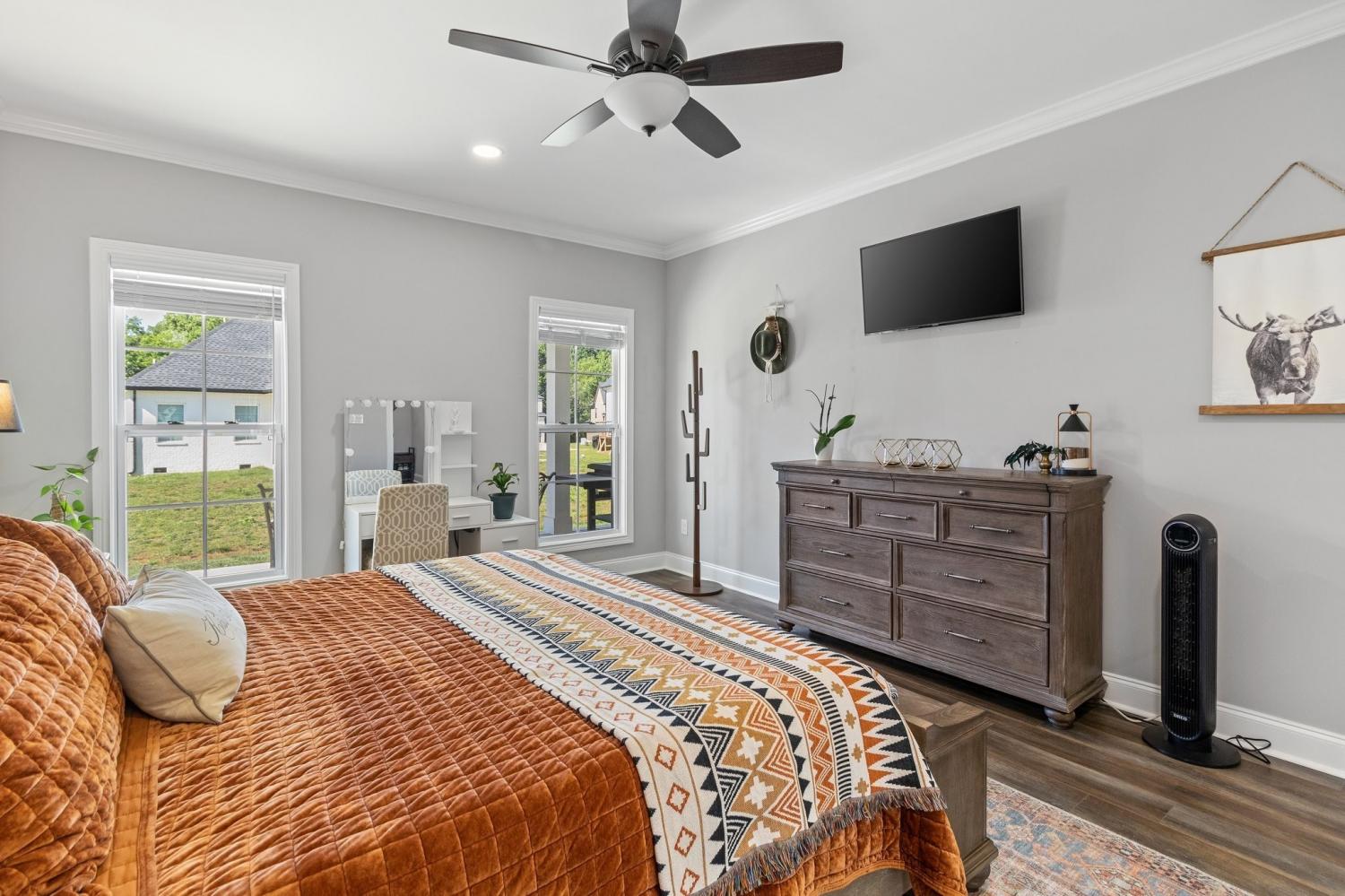 Here it is... Your stunning 4-bedroom, 3.5-bath home located in the desirable Easthaven subdivision. Built in 2022, this 2,903 sq ft residence showcases a thoughtfully designed floor plan with high-end finishes throughout. The home features dual master suites—one on the main level and another upstairs—offering privacy and flexibility for multigenerational living or guest accommodations. The open-concept main living area is anchored by a spacious great room with vaulted ceilings and a theater-style balcony, flowing seamlessly into a chef’s kitchen featuring a huge island, granite countertops, ample cabinetry, and a breakfast nook that opens to the formal dining area. Modern amenities include a Kohler whole-house generator system, gas tankless water heater, hardwired security camera system, built-in garage vacuum system, and an oversized 2-car garage that you can park a boat in, offering plenty of storage or workspace. The luxurious primary suite boasts a tiled shower and a free-standing soaking tub for ultimate relaxation. Outdoor living is equally impressive with a covered front porch and a large covered back patio, perfect for entertaining or quiet evenings. The extended side driveway provides ample parking for all of your family and friends. Located just minutes from Nashville and downtown Clarksville, and within close proximity to top-rated schools, this home also offers access to community amenities including a pool and clubhouse. Immaculately maintained and move-in ready, this home combines elegance, comfort, and convenience in one of Clarksville’s premier neighborhoods. Schedule your private showing today. Backyard fence just approved by HOA. Seller credit towards a fence and closing cost is negotiable.