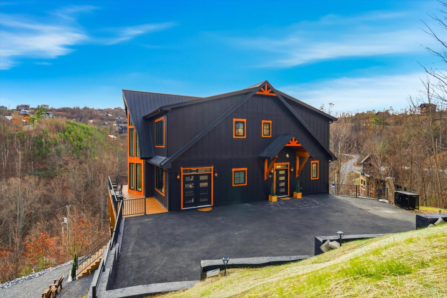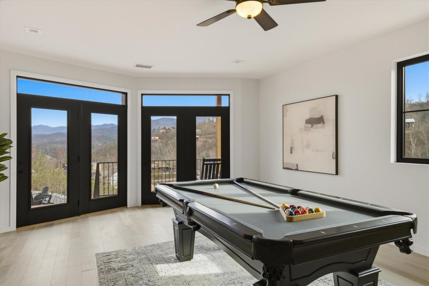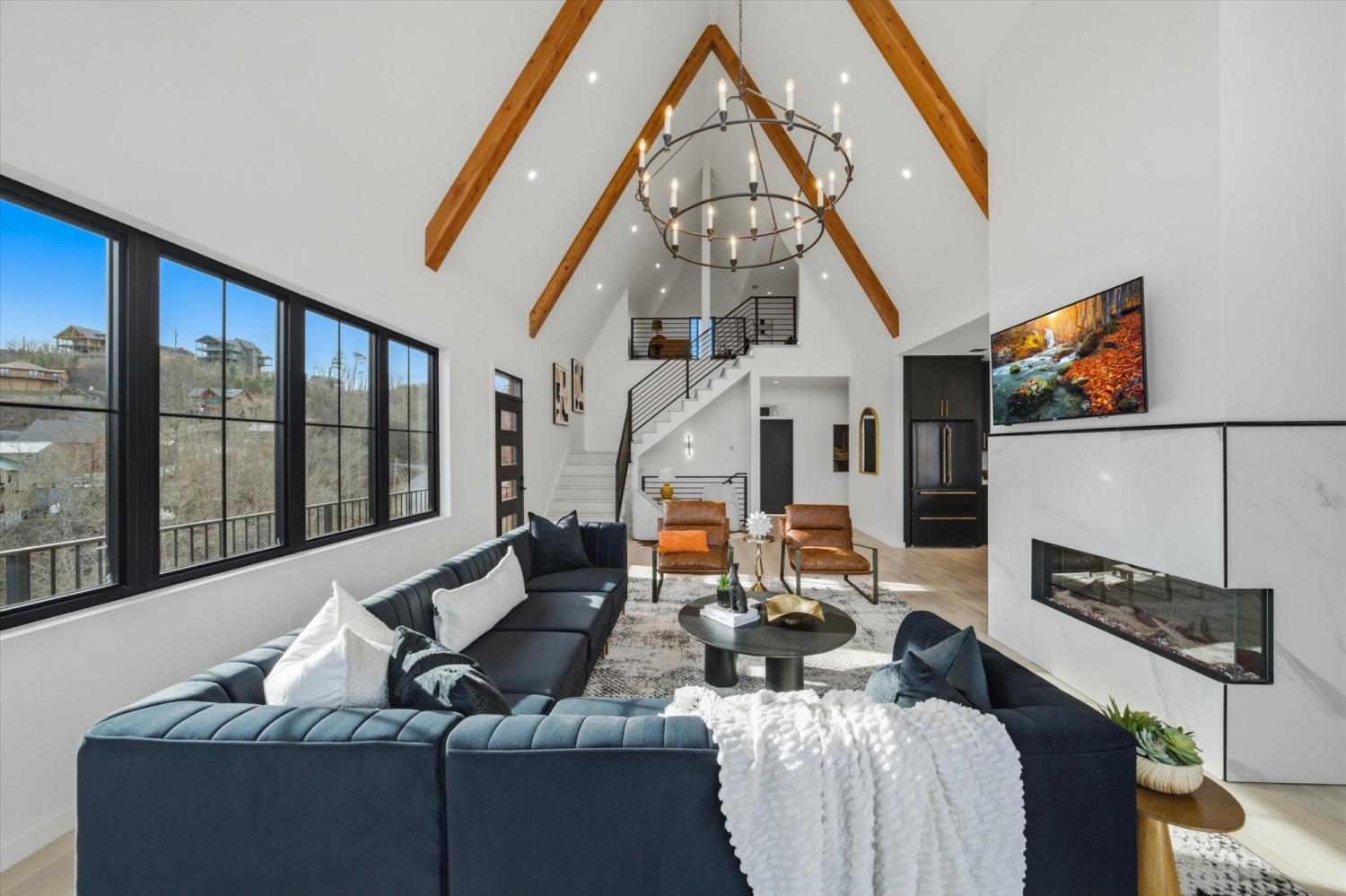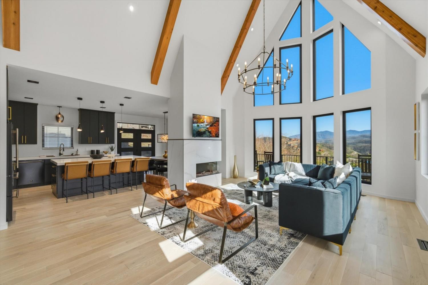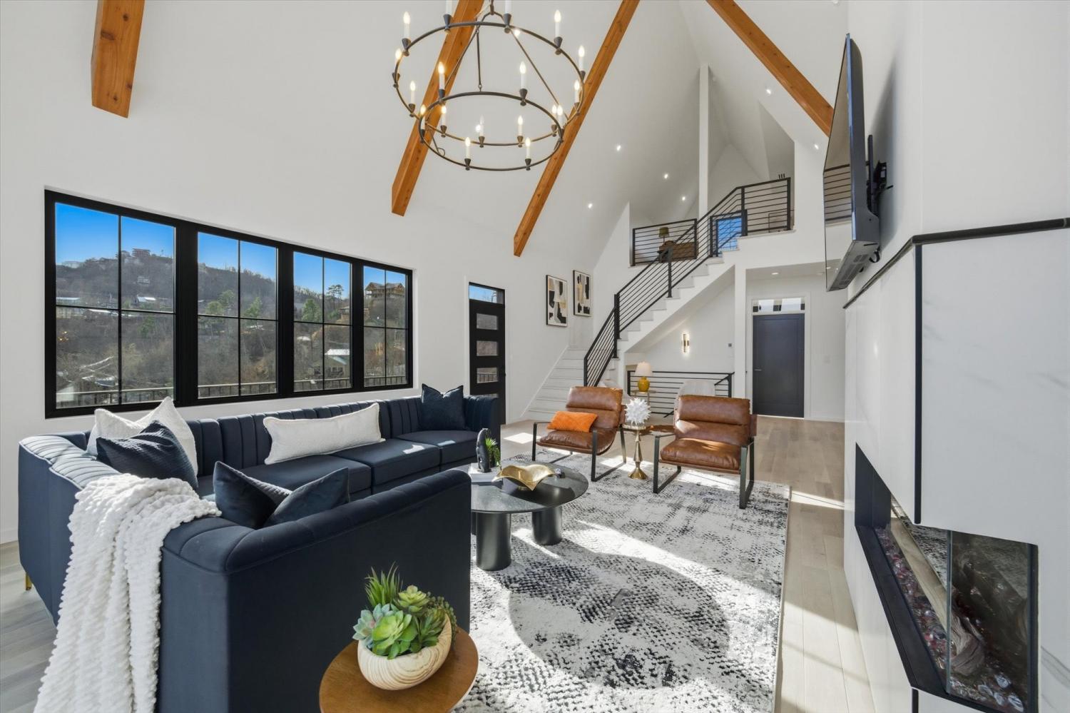 NEW 2026 Construction! Welcome to 550 Greenbriar Lane, a custom-built luxury modern mountain home in the highly sought-after Chalet Village of Gatlinburg, TN. This stunning 3-level, 3,757 sq ft residence offers year-round, unobstructed mountain views and exceptional versatility as a primary residence, second home, or short-term rental investment. The thoughtfully designed layout includes 4 bedrooms and 3.5 baths, an impressive 30-ft main-level cathedral ceiling with rustic beams, and 9-ft ceilings on all levels. High-end finishes include solid hardwood floors, marble and tile accents, quartz countertops, and custom cabinetry throughout. Designed for entertaining and relaxation, the home features an 8-seat private theater, a spacious entertainment room with arcade station, pool table, and mini kitchen/bar area. Outdoor living shines with expansive composite decking, a large hot tub, a rustic fire pit with weatherproof seating, and panoramic mountain views. A no-step entry from the parking area enhances accessibility. Sold *fully furnished, this home is truly *move-in ready or *STR-ready. Ideally located just minutes from downtown Gatlinburg, Pigeon Forge, Ober Mountain, and the entrance to Great Smoky Mountains National Park, offering the perfect blend of luxury, location, and mountain living. Chalet Village HOA Amenities include access to *three clubhouses with outdoor pools and two tennis courts (info sourced from www.ChaletVillage.com). *One-year builder’s warranty included. *The Certificate of Occupancy states a 12-person load capacity.