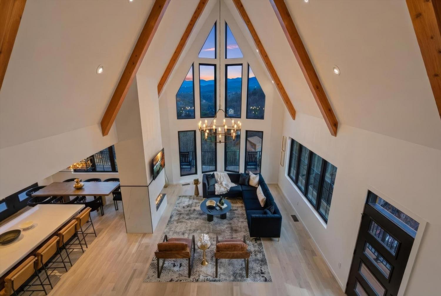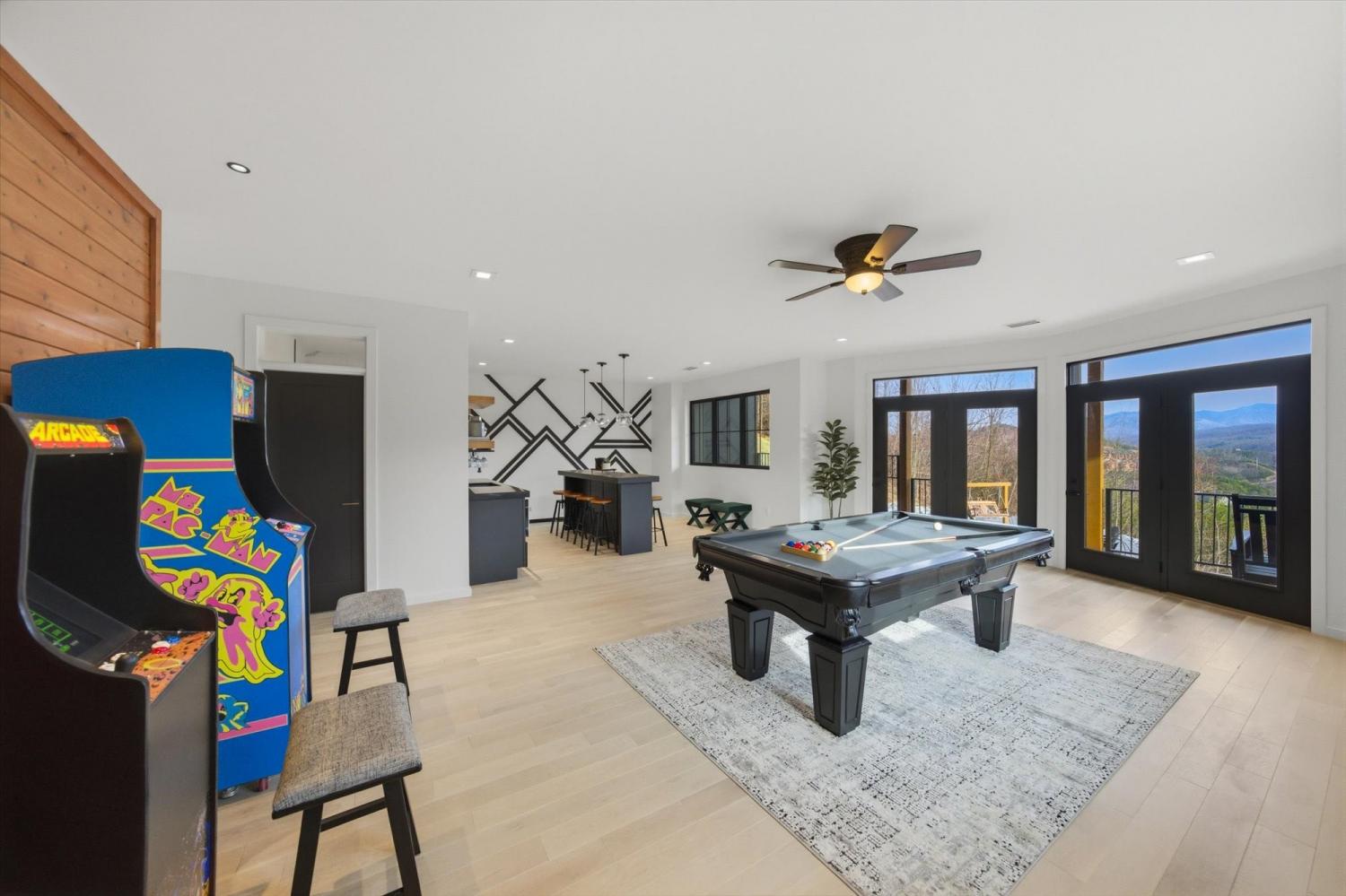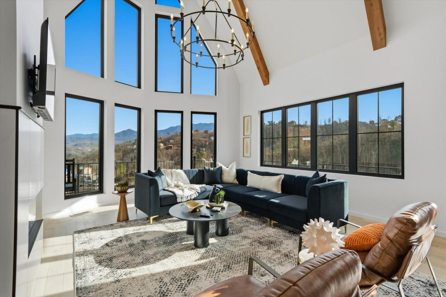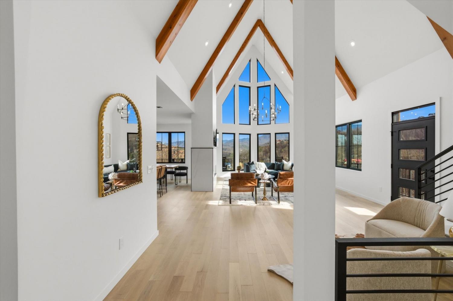 NEW 2026 Construction! Welcome to 550 Greenbriar Lane, a custom-built luxury modern mountain home in the highly sought-after Chalet Village of Gatlinburg, TN. This stunning 3-level, 3,757 sq ft residence offers year-round, unobstructed mountain views and exceptional versatility as a primary residence, second home, or short-term rental investment. The thoughtfully designed layout includes 4 bedrooms and 3.5 baths, an impressive 30-ft main-level cathedral ceiling with rustic beams, and 9-ft ceilings on all levels. High-end finishes include solid hardwood floors, marble and tile accents, quartz countertops, and custom cabinetry throughout. Designed for entertaining and relaxation, the home features an 8-seat private theater, a spacious entertainment room with arcade station, pool table, and mini kitchen/bar area. Outdoor living shines with expansive composite decking, a large hot tub, a rustic fire pit with weatherproof seating, and panoramic mountain views. A no-step entry from the parking area enhances accessibility. Sold *fully furnished, this home is truly *move-in ready or *STR-ready. Ideally located just minutes from downtown Gatlinburg, Pigeon Forge, Ober Mountain, and the entrance to Great Smoky Mountains National Park, offering the perfect blend of luxury, location, and mountain living. Chalet Village HOA Amenities include access to *three clubhouses with outdoor pools and two tennis courts (info sourced from www.ChaletVillage.com). *One-year builder’s warranty included. *The Certificate of Occupancy states a 12-person load capacity.