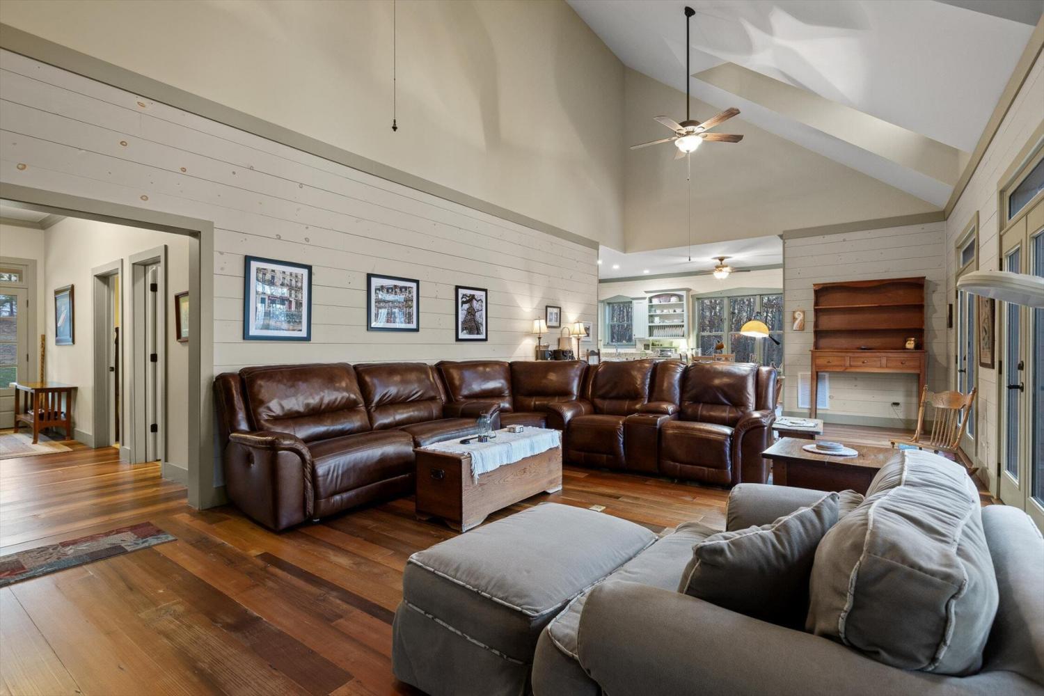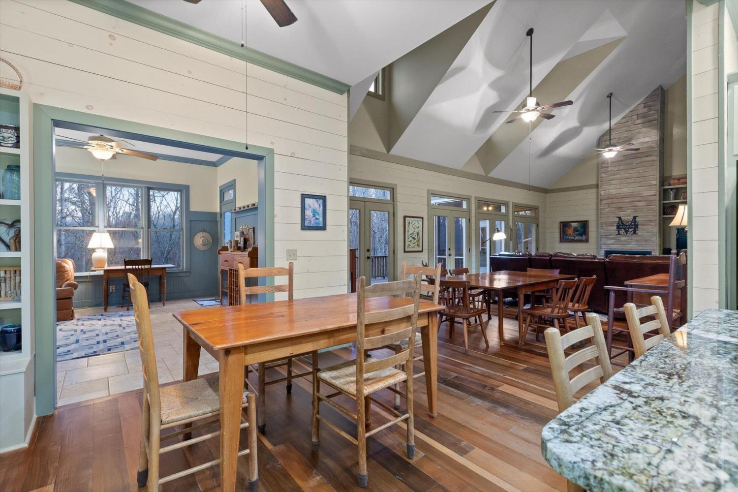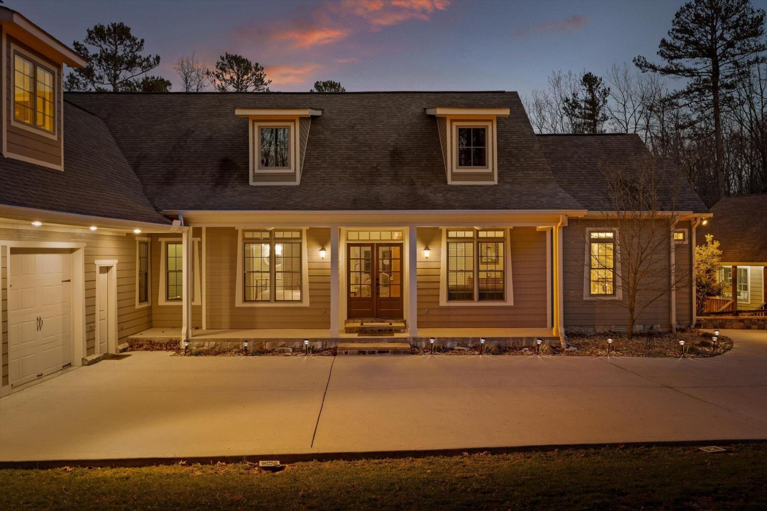 Nestled in nature's serenity, this breathtaking estate blends elegance and tranquility on four secluded acres. The stunning main home features soaring vaulted ceilings, expansive double windows, and doors that open to a sprawling back deck—blurring the lines between indoor comfort and outdoor splendor. Step through grand double doors into a refined sitting room on one side and a bedroom suite on the other, leading seamlessly into a sunlit living area. A majestic stone fireplace stretches from floor to ceiling, creating a warm focal point, while the screened-in porch offers a peaceful retreat overlooking the mountainous backyard and adjacent deck. The kitchen and dining area boast custom cabinetry, a large island, and high-end appliances, including a wall-mounted oven and warming drawer. Off the dining area, a charming sunroom invites you to bask in natural light year-round, offering a tranquil space for coffee, reading, or quiet reflection. The primary suite is a private sanctuary with high ceilings, screened-in porch access, and an ensuite bath featuring a soaking tub framed by stained glass, a spacious double shower, dual vanities, and a walk-in closet. Two additional bedrooms each offer ensuite baths, ensuring comfort and privacy, while the upstairs bonus room provides flexible space for a media room, playroom, or game room. A main-level laundry room adds to the home's functionality. Enhancing the estate's charm, the separate guest cabin features vaulted beamed ceilings, a stone fireplace, and a covered front porch—an inviting retreat for guests. This mountain sanctuary offers luxury, privacy, and breathtaking surroundings—ready to be called home!