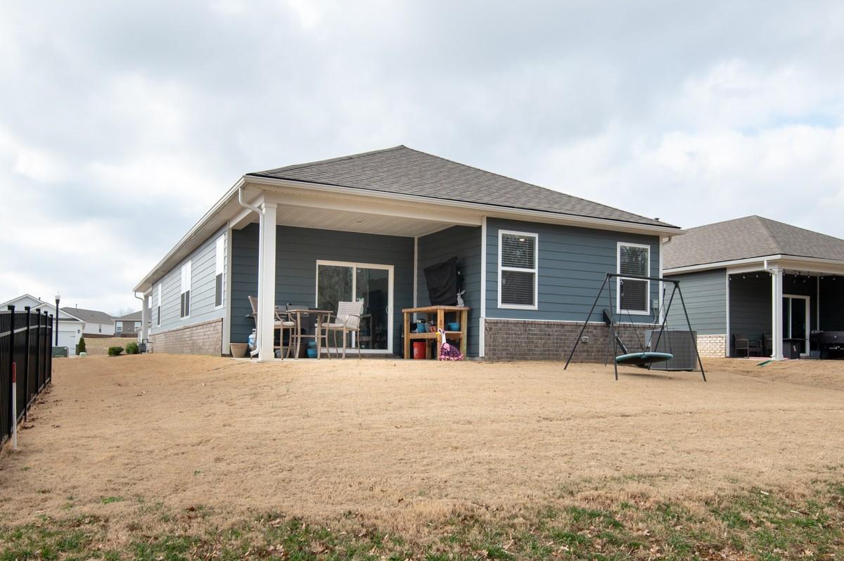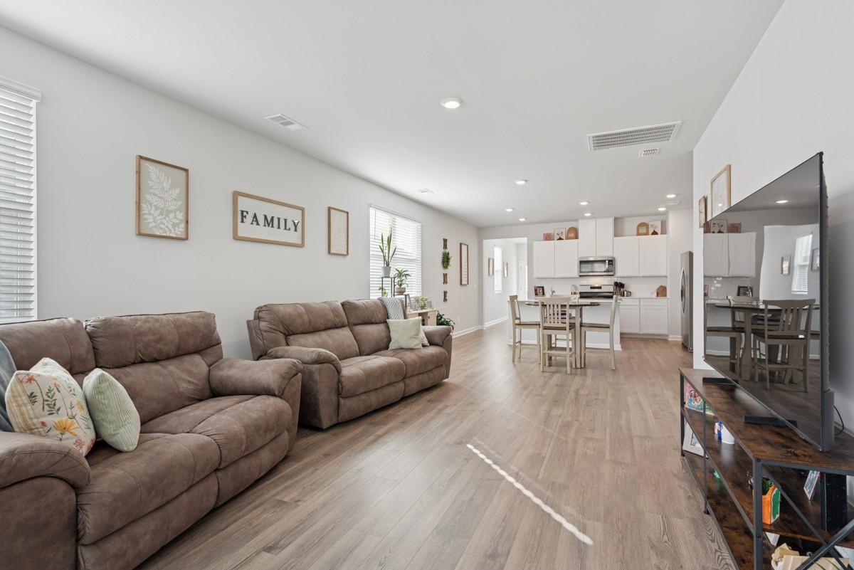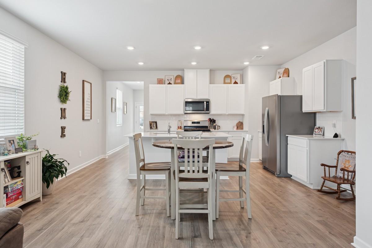 Welcome to this pristine, like-new home—only two years old and meticulously maintained, it shows as if it were brand new. Built by DR Horton, this home features the popular Jennings floor plan with an open-concept design and soaring ceilings throughout. This single-level home offers three bedrooms and two full baths. The gourmet-style kitchen is a standout, featuring granite countertops, a gas cooktop, a spacious pantry, and an oversized island perfect for entertaining. The open layout flows seamlessly into the main living area, enhanced by recessed lighting and stunning windows that fill the space with natural light. Situated on a premier lot, the home backs up to a peaceful wooded area with a creek, providing both privacy and beautiful views. The spacious primary suite includes a large walk-in closet and a well-appointed en-suite bath. Both guest bedrooms feature extra-large closets, offering ample storage. Additional highlights include laminate hardwood flooring throughout, high ceilings, attractive cabinetry, and a generously sized garage—ideal for a workshop, man cave, or she-shed setup. The community offers exceptional amenities, and the HOA conveniently covers lawn care, making for truly low-maintenance living. This home has just hit the market and won’t last long—schedule your showing today!