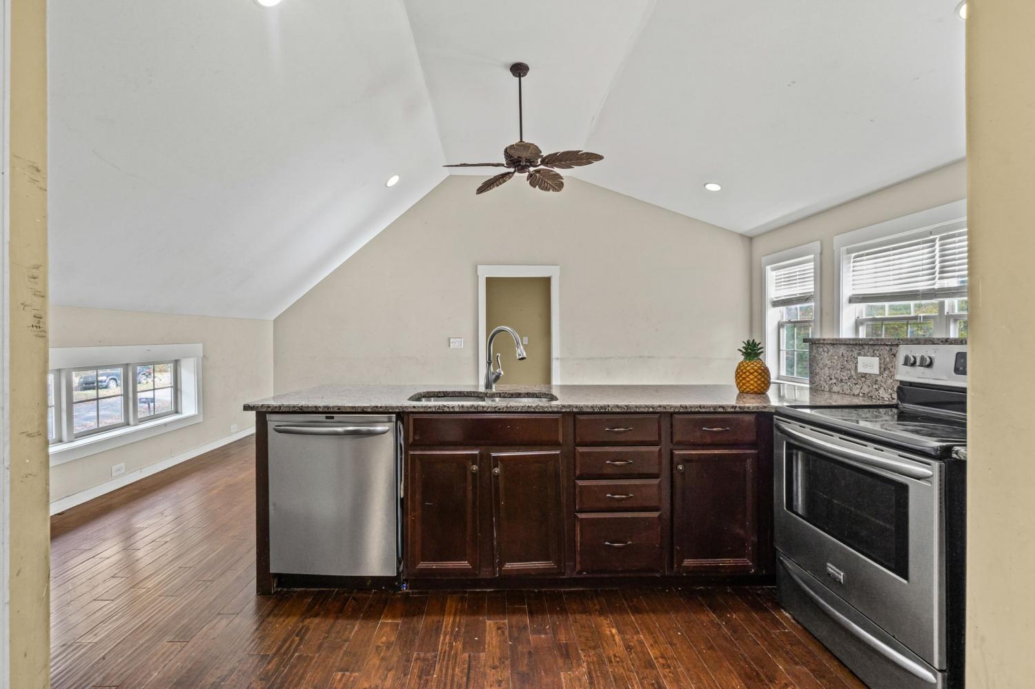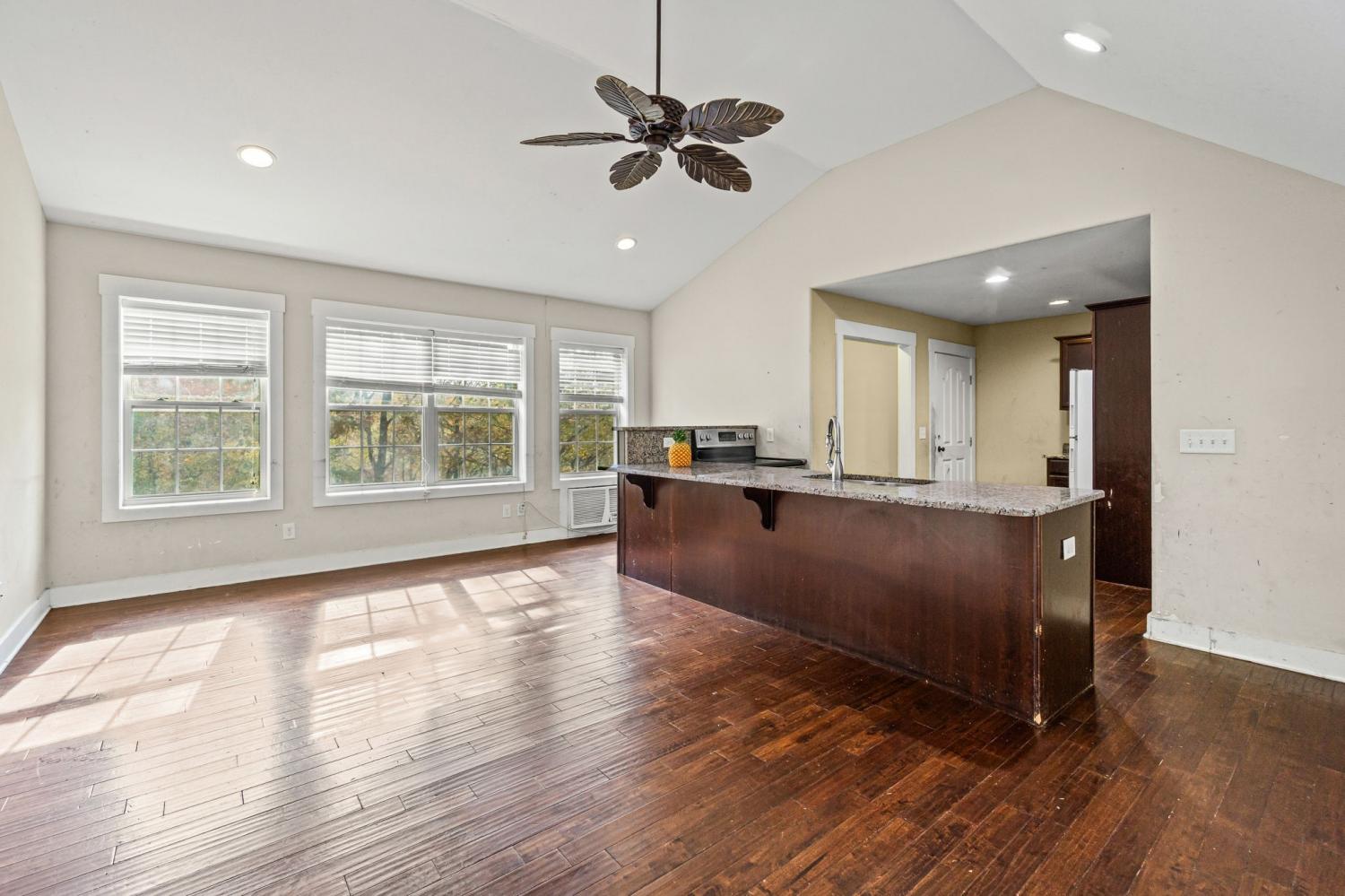Great opportunity near Center Hill Lake! This home sits on a peaceful, wooded 0.47-acre lot with quick access to the community boat ramp. Open-concept design with vaulted ceilings, granite countertops, tiled bath, and modern flooring. Spacious rec room and primary suite on the lower level. Some finishing touches and repairs are needed—ideal for an investor or buyer looking to add value and make it their own. Selling as is.