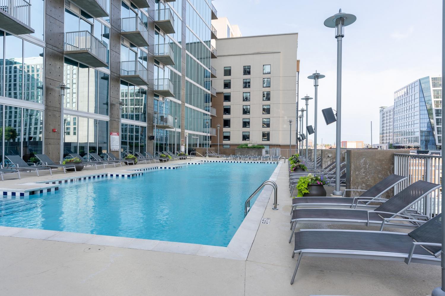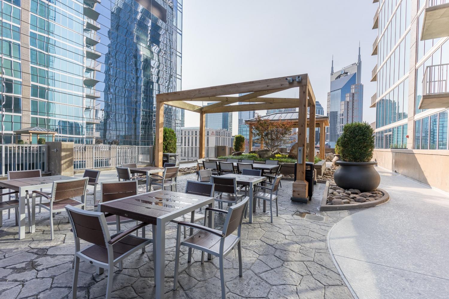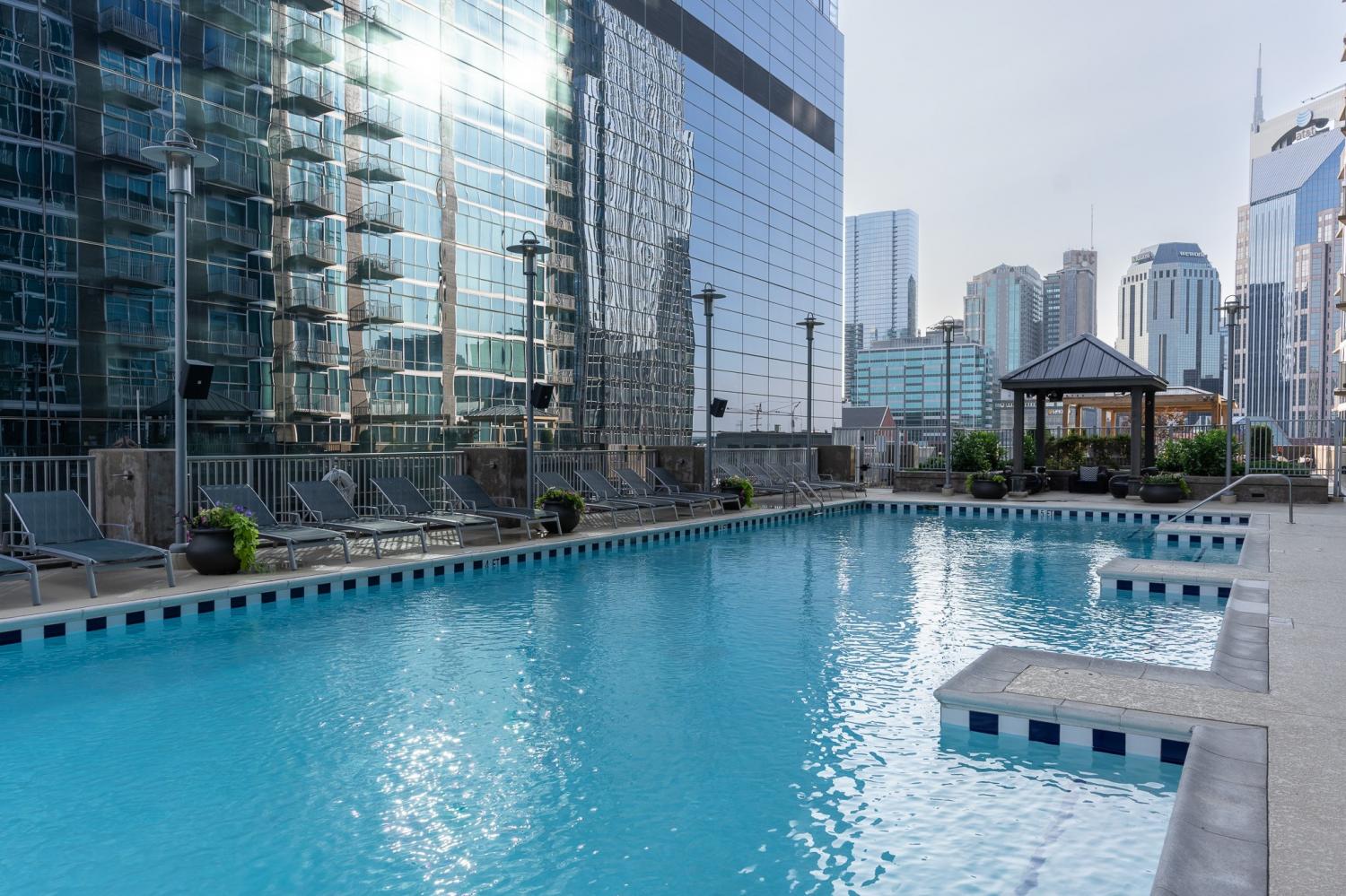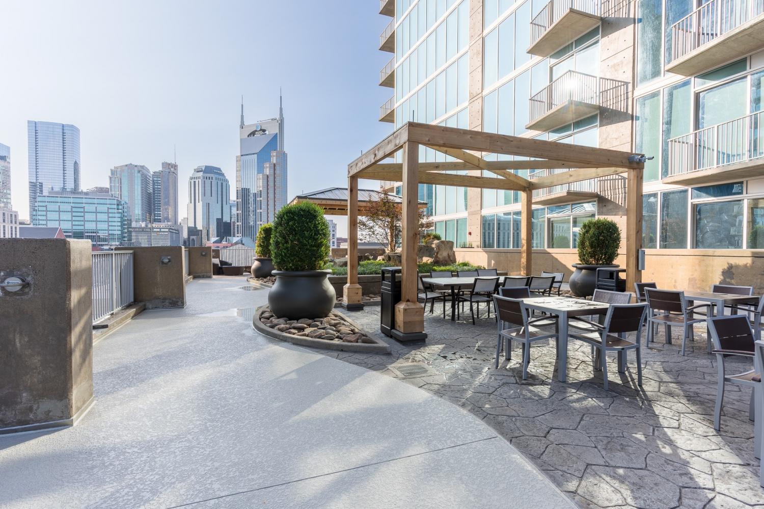 Step into modern luxury with this stunning 2-bedroom, 2-bathroom condo in the highly desirable Encore building. Fully furnished and meticulously renovated, this 1,113 sqft unit offers the ultimate in downtown living. White oak engineered hardwood flooring flows throughout the space, complemented by sleek quartz countertops, brand new cabinets, and floor-to-ceiling windows that flood the interior with natural light. Step out onto your private balcony to enjoy uninterrupted views of the vibrant Nashville skyline. The Encore is known for its prime location, placing you within walking distance of Broadway, the Schermerhorn Symphony Center, The Ryman, Nissan Stadium, Bridgestone Arena, and the Music City Center. Whether you’re catching a Titans game, enjoying a concert, or dining at Nashville’s finest restaurants, everything you need and want is just steps away. This unit includes two assigned parking spaces and access to Encore’s top-tier amenities. Enjoy the convenience of a 24-hour concierge, a state-of-the-art fitness center, and a luxurious owners’ lounge. The outdoor spaces are equally impressive, featuring a terrace with grilling stations, an herb garden, and a resort-style pool with panoramic skyline views. Plus, 24-hour building security ensures your peace of mind. An added perk: WiFi is included with the HOA fees! Please note, the Encore does not permit short-term rentals, preserving the exclusivity and privacy of this sought-after community. This condo offers an unparalleled opportunity to experience the best of Music City in style and comfort. Property being sold fully furnished (minus a few items).