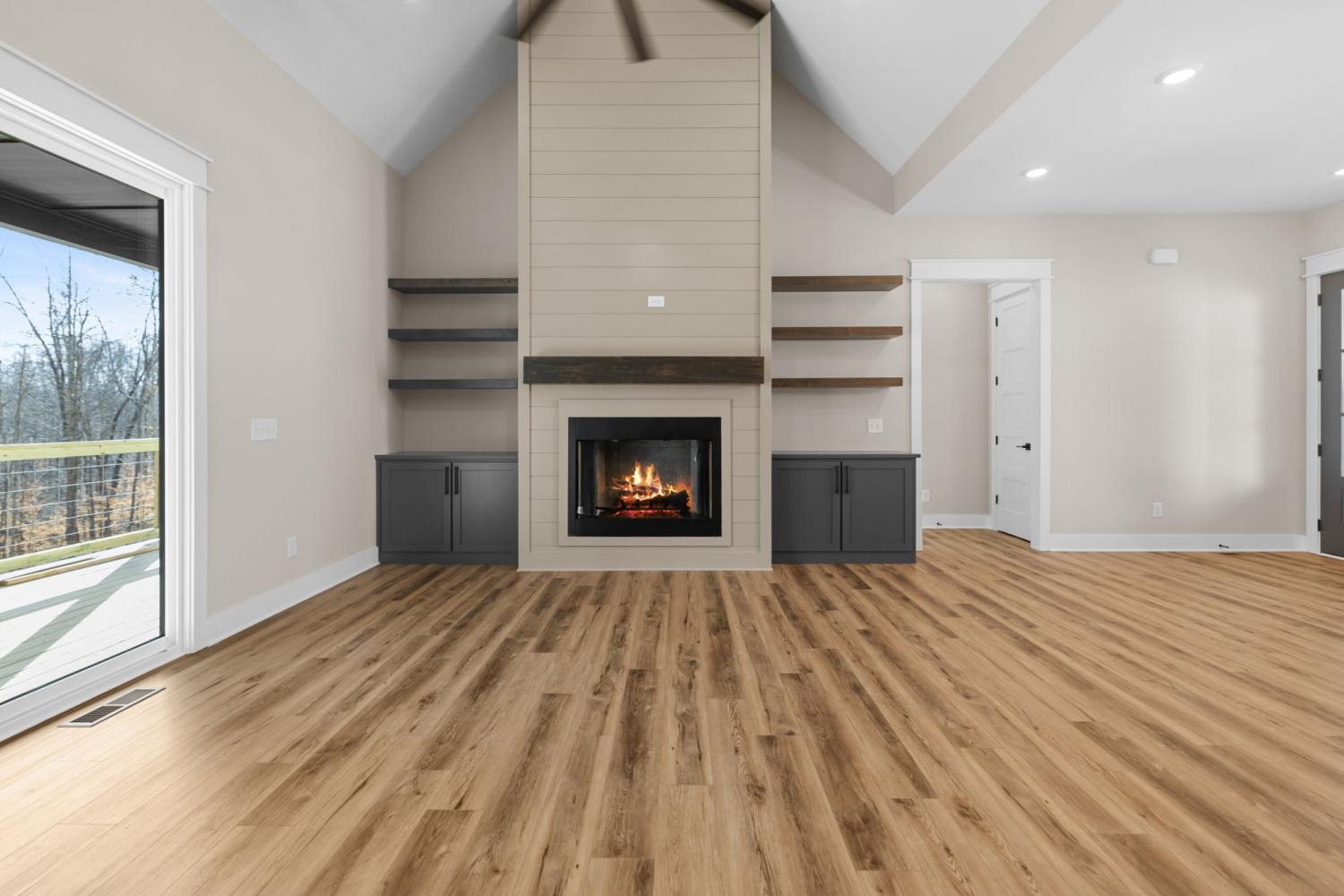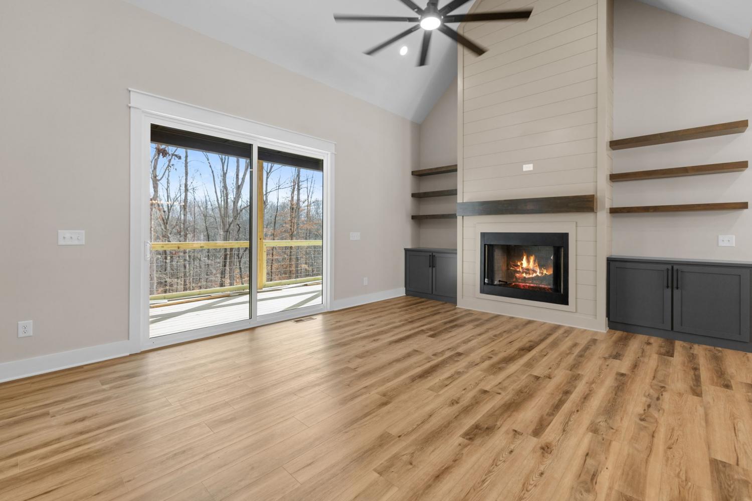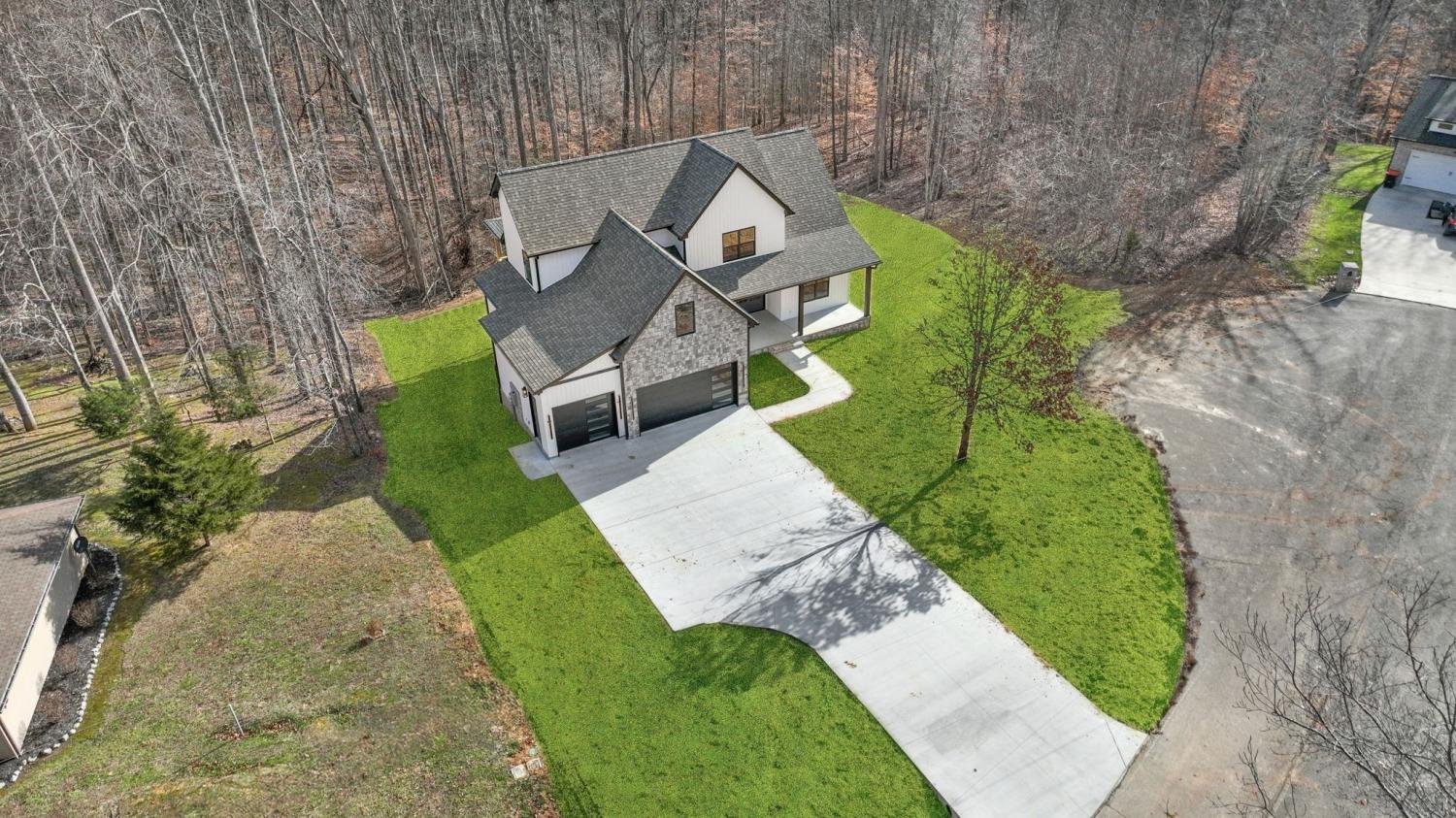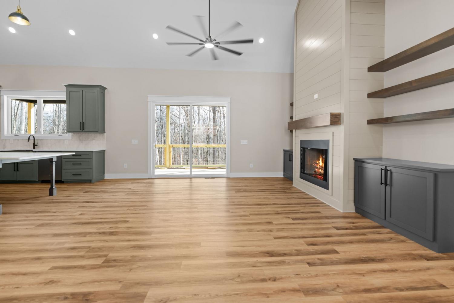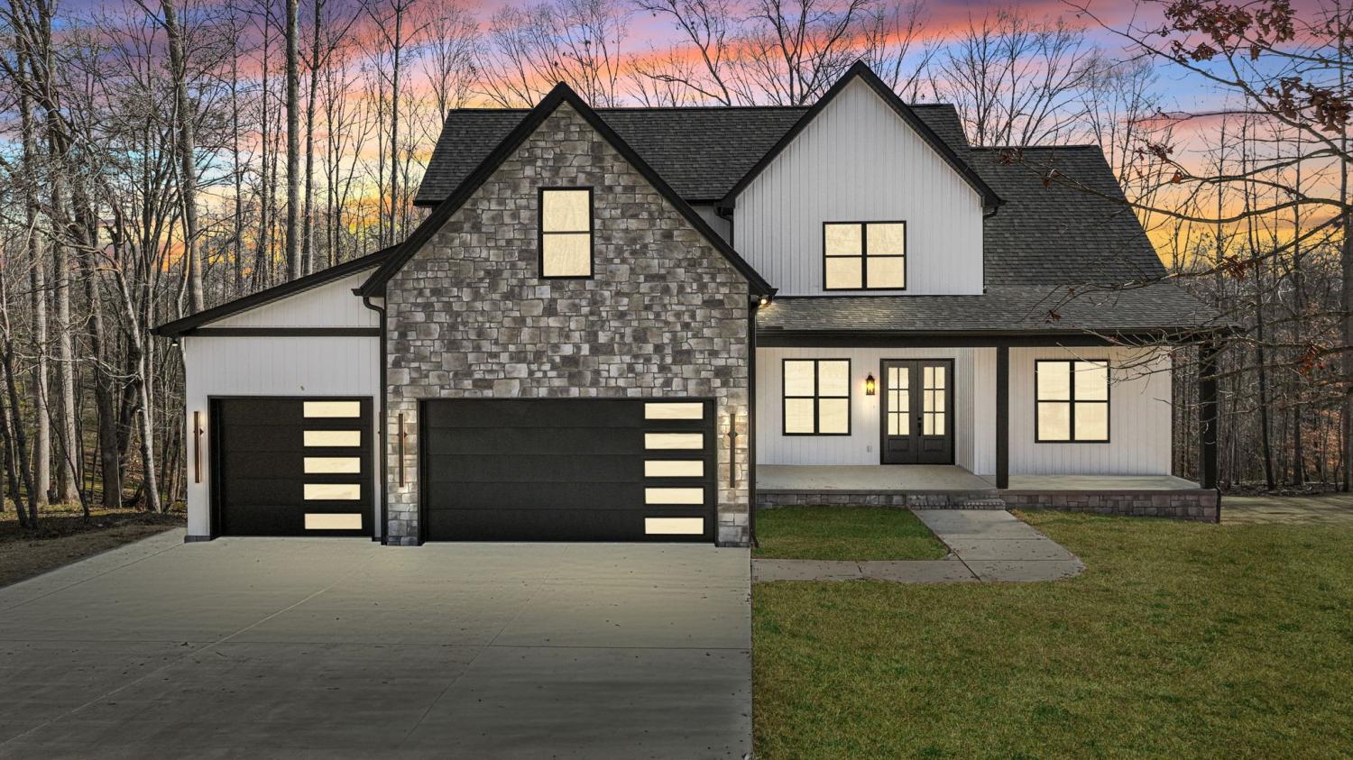 Beautiful new construction in a desirable lake community, located on a quiet cul-de-sac. This home features an abundance of kitchen cabinets with quartz countertops, an oversized island, and a walk-in pantry. The open-concept layout flows seamlessly into the great room with a cozy fireplace and leads out to a covered back porch overlooking the woods—perfect for enjoying nature and privacy. The primary bedroom offers a stylish accent wall and a spa-like bath with a soaker tub, walk-in tile shower, and a spacious walk-in closet. A concrete driveway adds durability and curb appeal. Upstairs, you’ll find two additional bedrooms and a large bonus room. Bedroom closets include built-ins, and there is ample walk-in attic storage. Taxes to be determined. Buyer or Buyer's Agent to verify all pertinent information. All measurements are approximate, if important please remeasure. Quality home built by Gregg Guinn Construction.