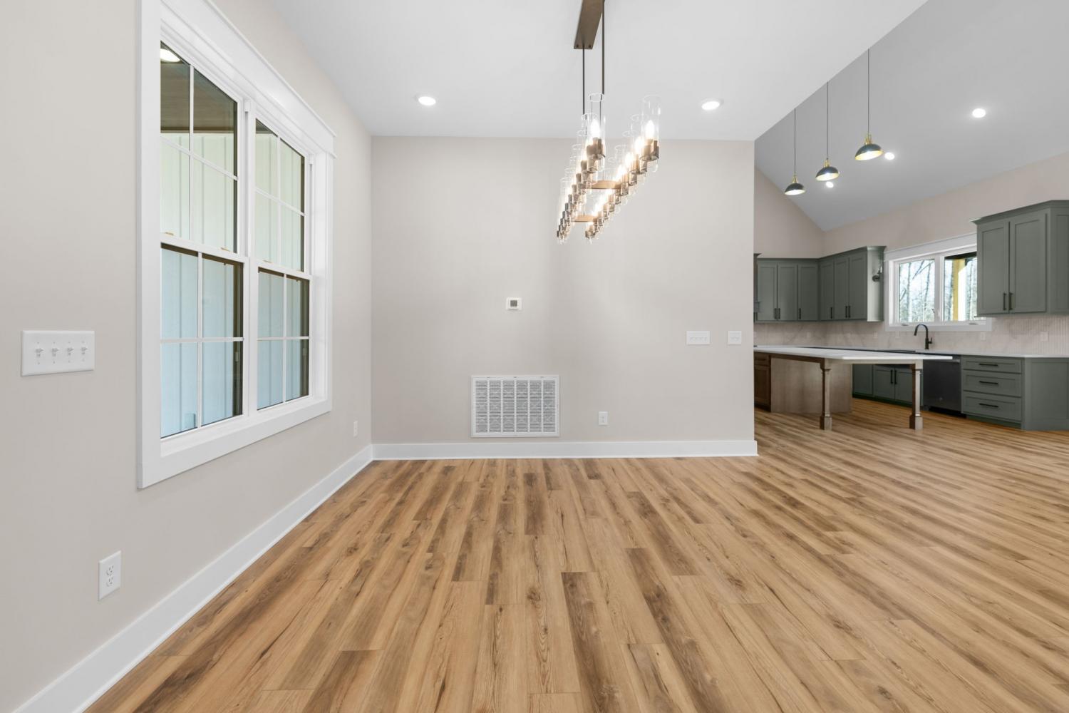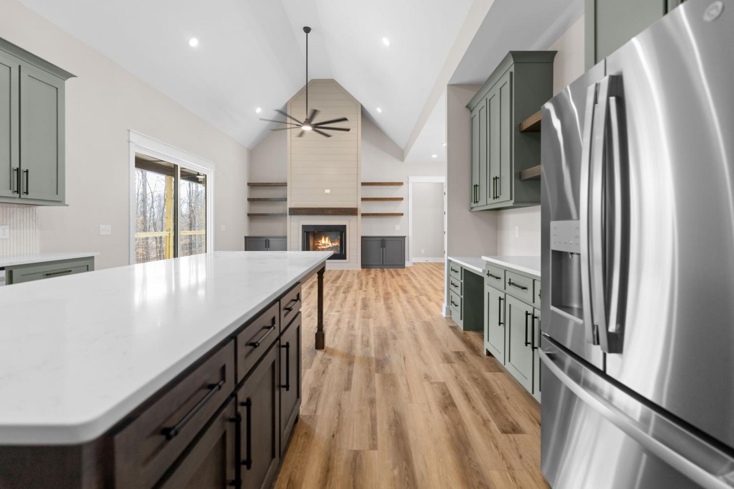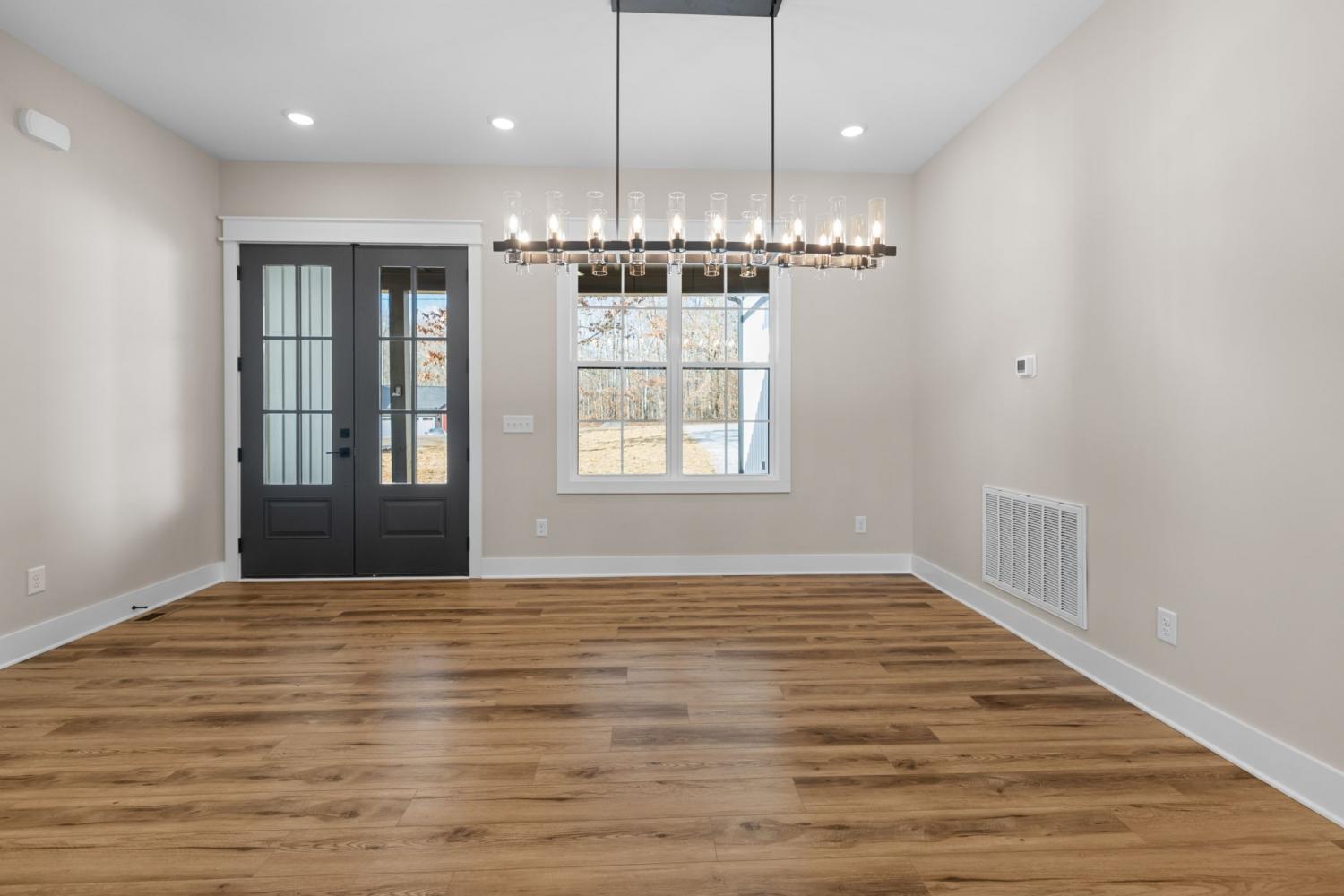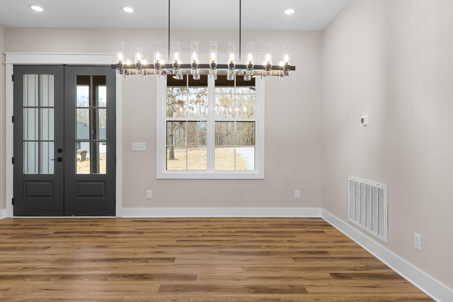 Beautiful new construction in a desirable lake community, located on a quiet cul-de-sac. This home features an abundance of kitchen cabinets with quartz countertops, an oversized island, and a walk-in pantry. The open-concept layout flows seamlessly into the great room with a cozy fireplace and leads out to a covered back porch overlooking the woods—perfect for enjoying nature and privacy. The primary bedroom offers a stylish accent wall and a spa-like bath with a soaker tub, walk-in tile shower, and a spacious walk-in closet. A concrete driveway adds durability and curb appeal. Upstairs, you’ll find two additional bedrooms and a large bonus room. Bedroom closets include built-ins, and there is ample walk-in attic storage. Taxes to be determined. Buyer or Buyer's Agent to verify all pertinent information. All measurements are approximate, if important please remeasure. Quality home built by Gregg Guinn Construction.