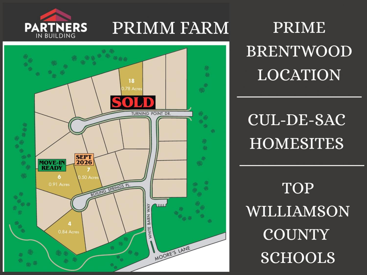 GPS: 8318 Moores Lane Brentwood, TN 37027 • I-65 to Exit 69 Moores Lane EAST Toward Wilson Pike • Continue on Moores Lane 1.5 Mile to LEFT on White Barn Way into PRIMM FARM • LEFT on Boiling Springs Pl • End of Cul-De-Sac