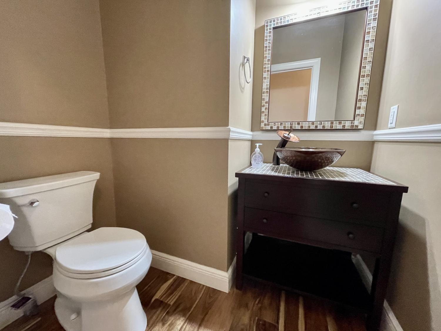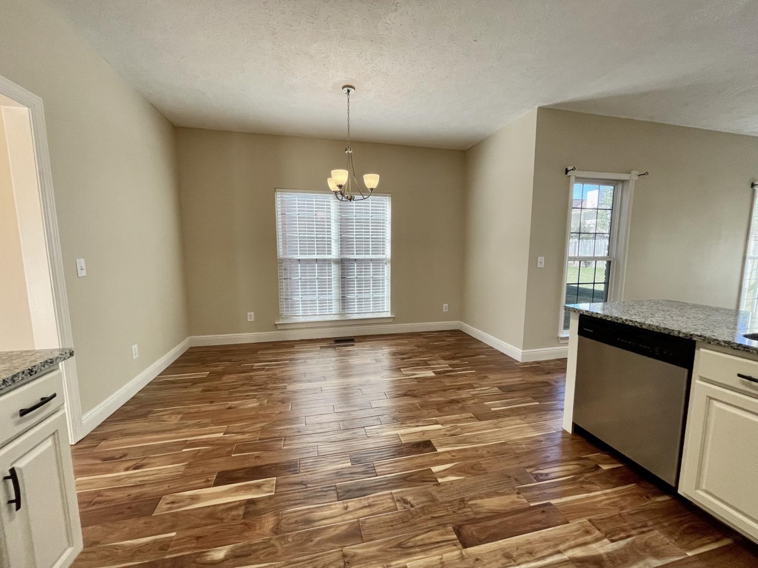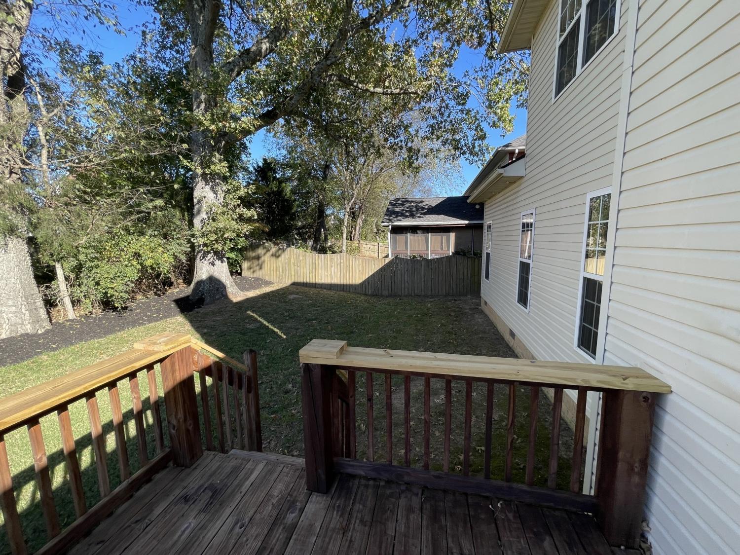 Beautiful home featuring an open floor plan with hardwood floors throughout. The spacious kitchen offers granite countertops, stainless steel appliances, and a sunny breakfast nook that opens to a cozy den with a fireplace and a formal dining room with high ceilings and large windows that bring in plenty of natural light. Step out from the den onto a large deck — perfect for outdoor enjoyment. The main-level primary suite includes generous closet space, a double vanity, and an updated tiled shower. Upstairs, a massive bonus room provides endless possibilities, along with three additional bedrooms, each with ample closet space, and a remodeled tiled bathroom. This home offers a functional and inviting layout ideal for entertaining and comfortable family living.