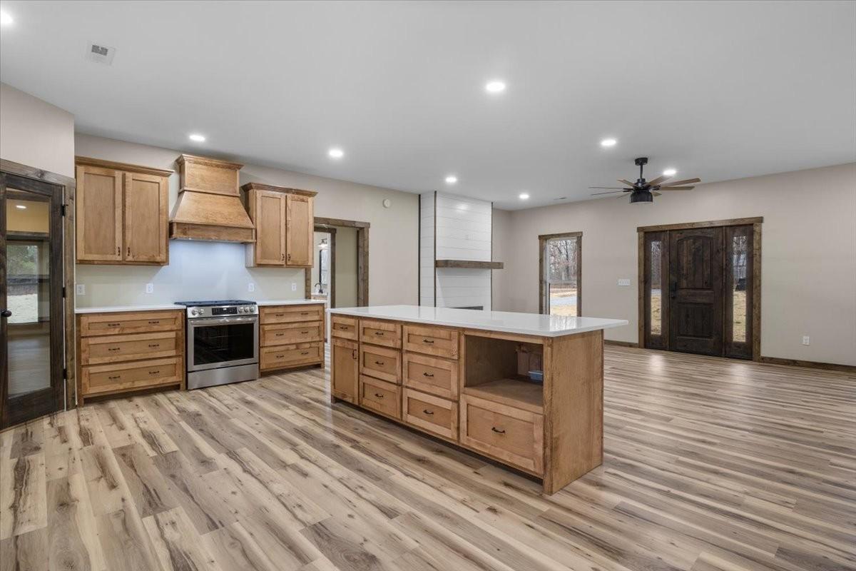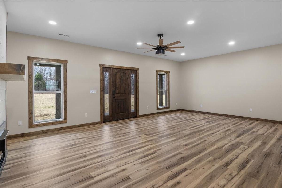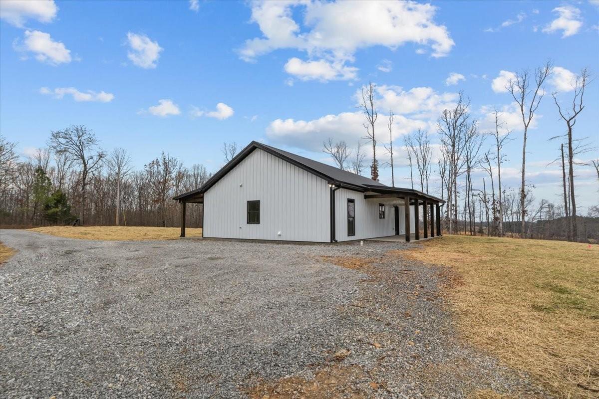 Beautiful custom-built new construction home nestled on 5+ unrestricted acres with stunning views of the rolling Tennessee hills. This 3 BD 2 BA home is ideal for anyone looking for their own space with room to roam. Situated in a peaceful country setting with a spacious and level front and back yards, just 5 minutes to town and 15 minutes to Kentucky Lake/Tennessee River for endless water recreation, this property is in an excellent location! The open floor plan is filled with natural light from large windows throughout and features LVP flooring, a gas fireplace, and a gorgeous kitchen complete with granite countertops, solid walnut cabinets and stainless steel appliances. A private primary suite with a custom tile shower, beautiful finishes and a large walk-in closet does not disappoint! FIBER INTERNET - CONVEYS WITH BRAND NEW SURVEY!! Enjoy outdoor living from both the covered front porch (34x8) and covered back porch (28x8), each accented with tongue-and-groove ceilings, recessed lighting, and a rich dark walnut stain—perfect for relaxing and enjoying the surrounding views. Additional highlights include board-and-batten metal siding, tankless hot water heater, city water, and gas stub-outs for the dryer, range, and furnace, providing efficiency and flexibility. Thoughtfully designed and custom built, this home offers quality craftsmanship, privacy, and the space to truly enjoy country living with all of the modern conveniences.