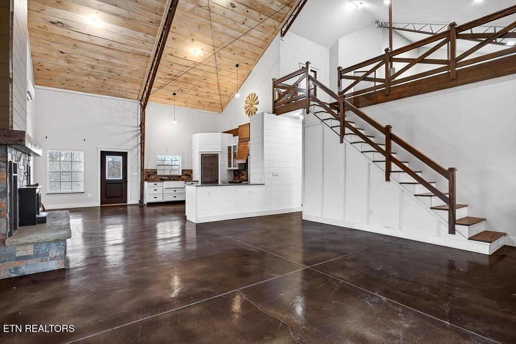 Discover your dream retreat on 27.4 unrestricted acres in the heart of Pickett County! This custom-built 2022 barndominium blends modern comfort with country charm, featuring steel construction with wind bracing & high-speed fiber optic internet. Inside you'll find nearly 2,600 sqft of living space with soaring ceilings, a main-level primary suite, and additional loft living complete with kitchenette. Equestrian enthusiasts will love the horse barn with feed and tack room, 2.5 fenced acres next to the barn, a fully fenced property perimeter, multiple spring-fed creeks that run through the property - including your very own waterfall!! A detached workshop with electrical and plumbing offers space for all the hobbies. Whether you're looking for a full-time residence, vacation home, or working farm, this unrestricted property checks every box: scenic mountain views, water frontage, space for the animals and a versatile layout designed for both relaxation and productivity!! Buyer to verify ALL information!