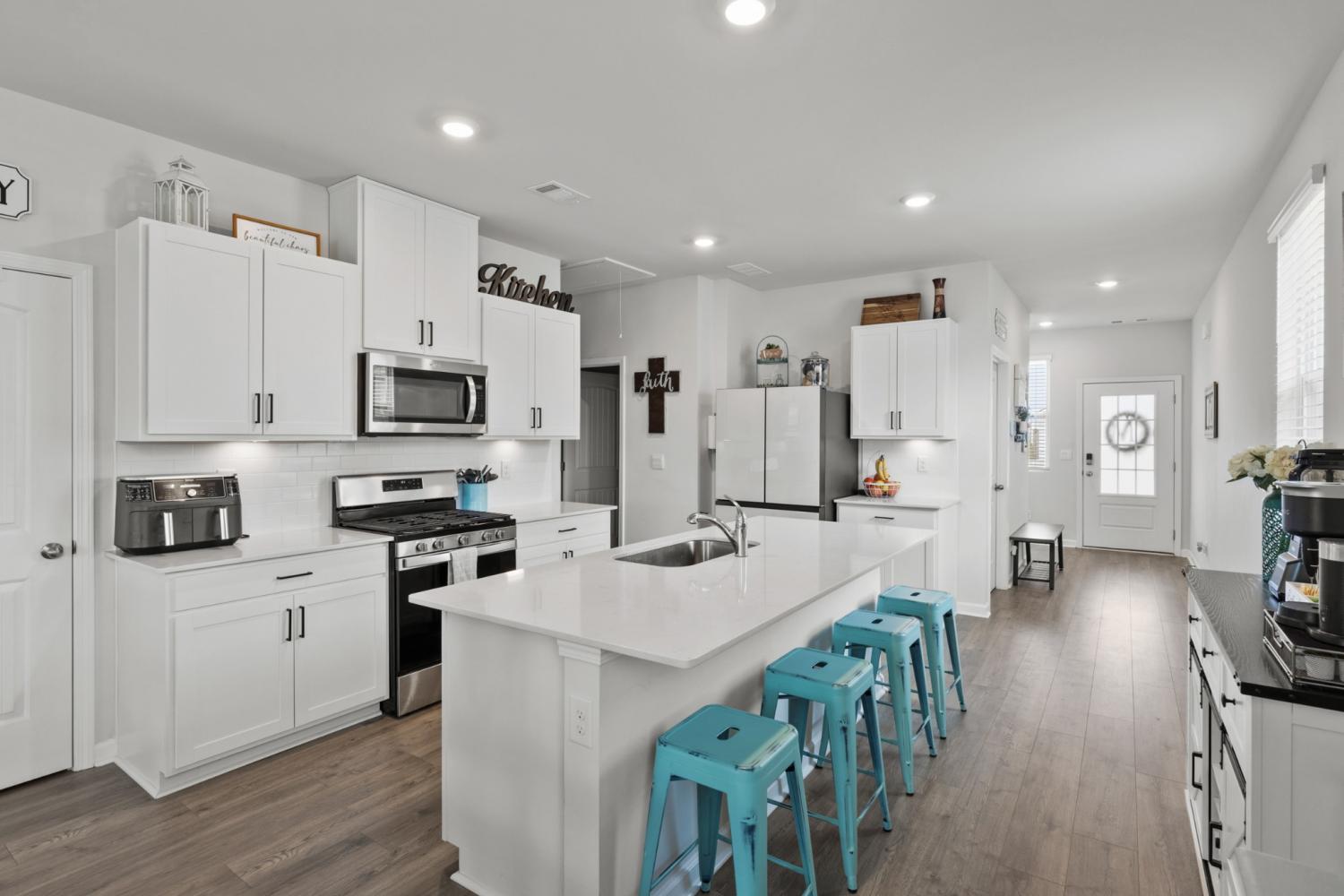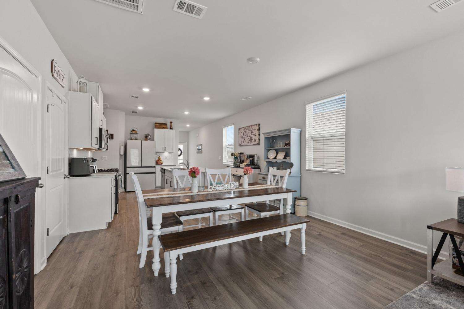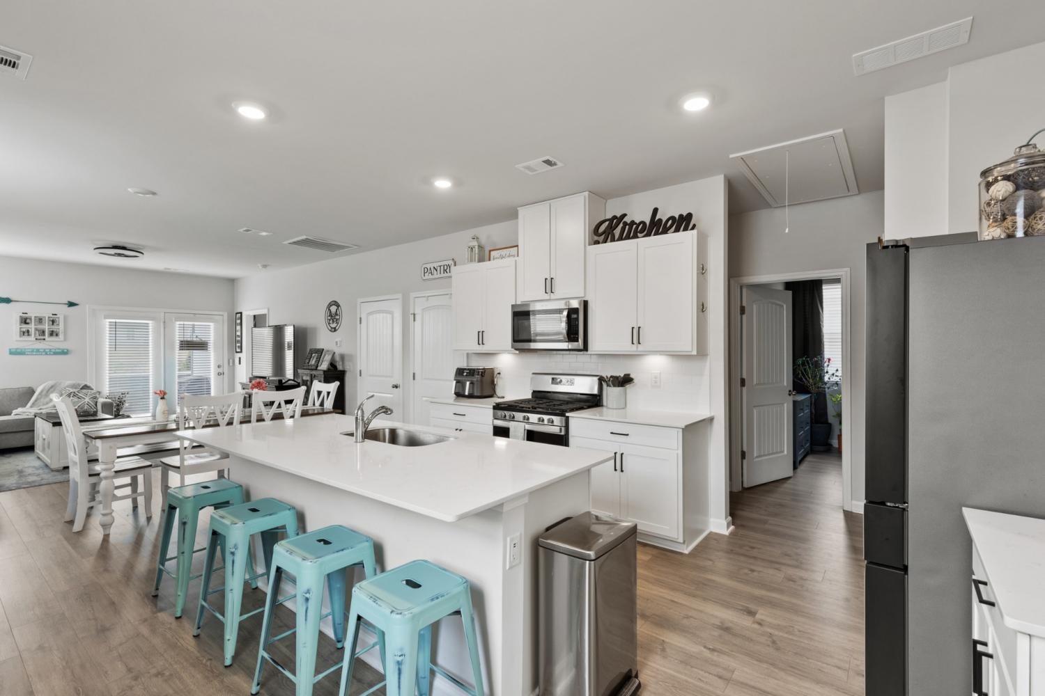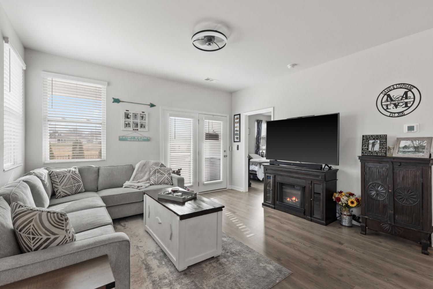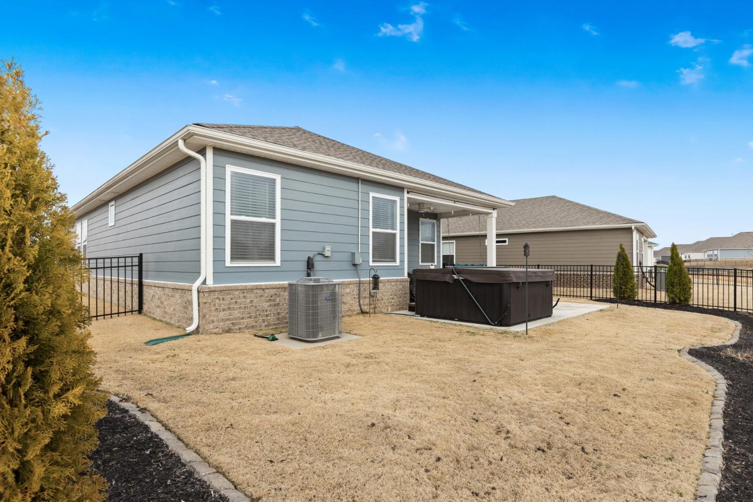 Better than new 2023 construction on a premium lot with no homes to be built behind! This 3-bedroom, 2-bath home offers 1,455 sq ft of thoughtfully upgraded living space in a growing new community. Features include smart home technology, gas heat, gas hot water heater, quartz countertops, upgraded pantry, stone front exterior, and a fully fenced backyard—perfect for pets. Owner upgrades include installed ceiling fans, custom blinds, cabinet hardware, expanded concrete patio, and a 220-volt exterior electrical plug. Enjoy low-maintenance living with modern finishes and privacy that’s hard to find. Move-in ready and truly turnkey!