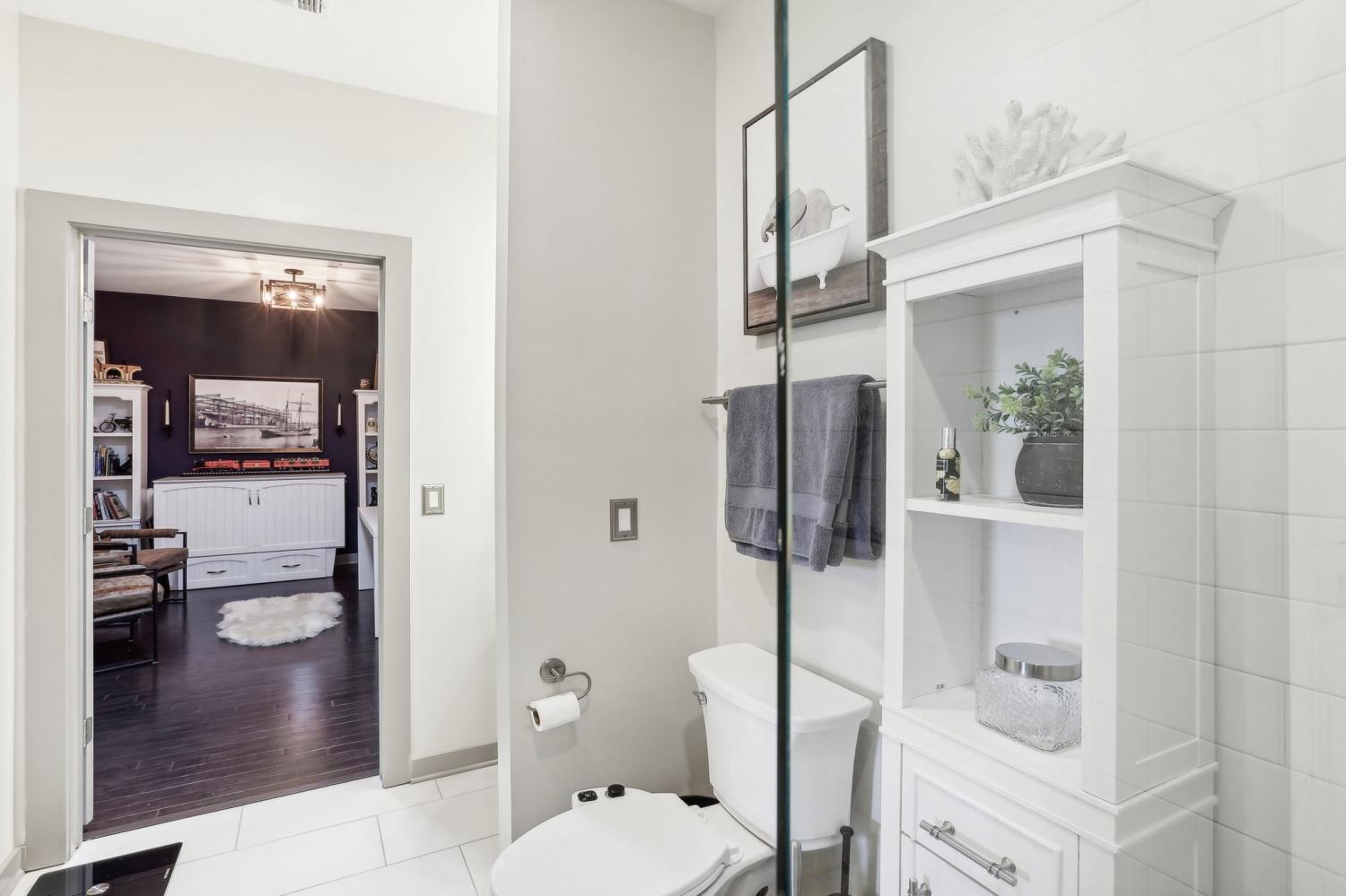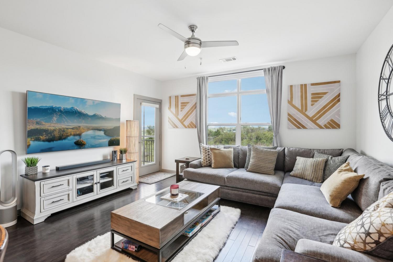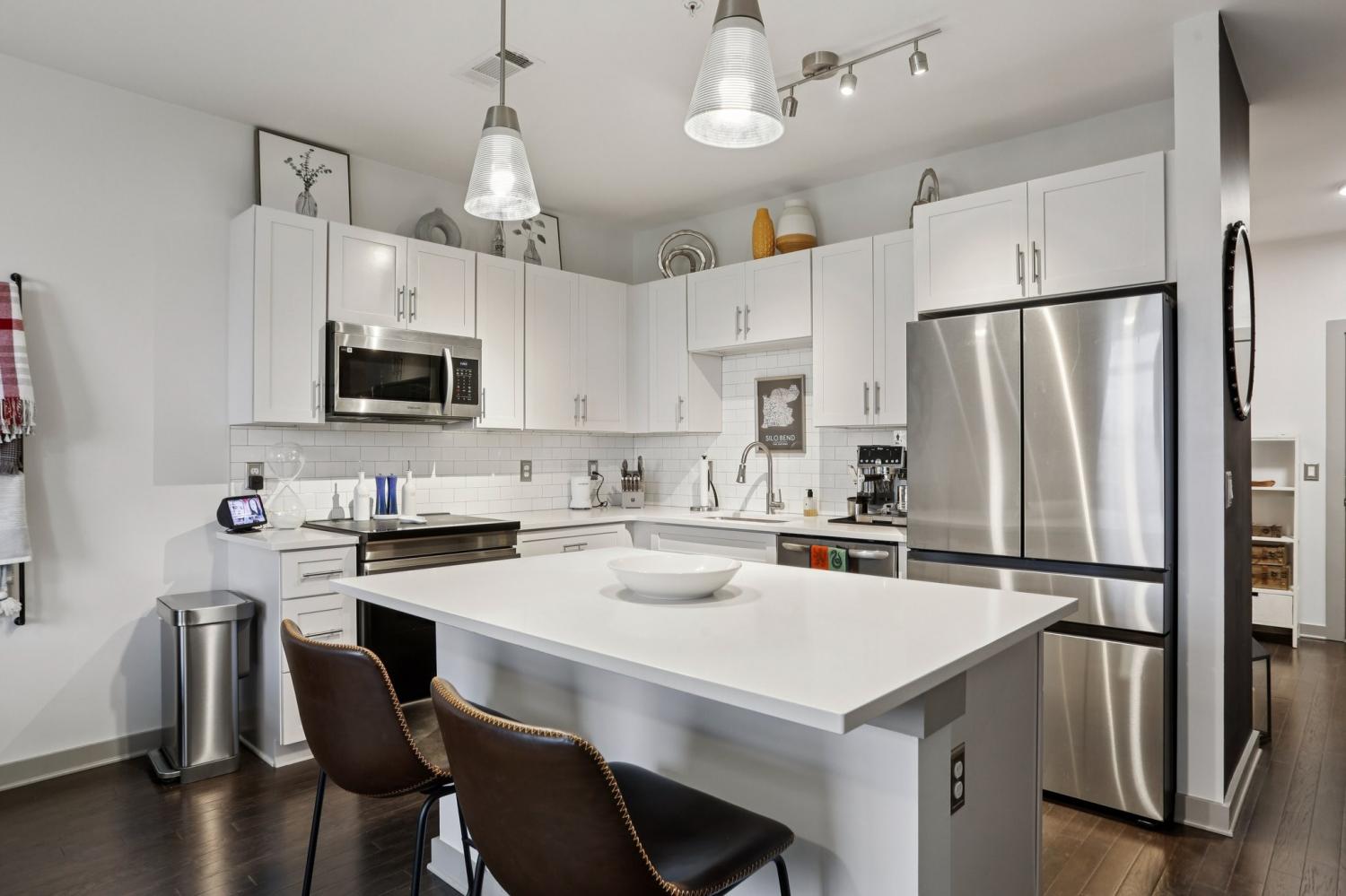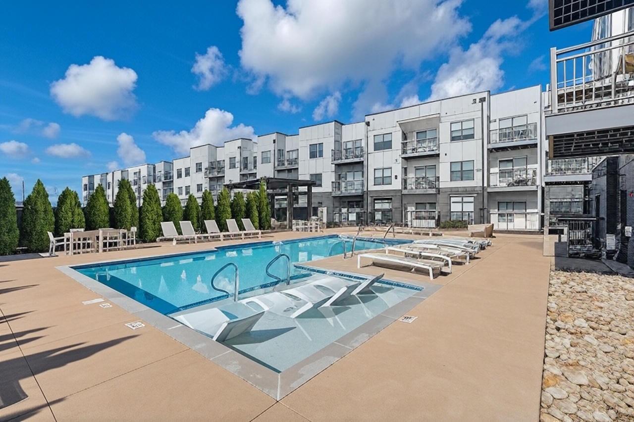 Stunning riverfront view condo in the highly sought-after Silo House, nestled in The Nations neighborhood. Just a short stroll from popular dining and shopping, and only minutes from downtown Nashville, this exceptional unit is especially special with expansive windows and a private balcony overlooking the Cumberland River. Bright, airy, and open, it boasts premium features including custom remote blinds, high end custom closet system, hardwood floors, stainless steel smart appliances new January 2025, induction stove, a large kitchen island, and quartz countertops. The tiled bathroom includes a frameless glass shower, custom vanity with sink and storage, plus a separate guest pedestal sink. Enjoy a spacious $5,000 walk-in custom closet by Closets by Design with a built in dual hamper... includes a lifetime warranty. Unit features a versatile bonus multi-use room that can serve as an office. All kitchen appliances remain, including the new induction stove and washer and dryer! Conveniently located in the same building as the impressive fitness center and gorgeous swimming pool with grilling stations and pergola. Don’t miss this one!