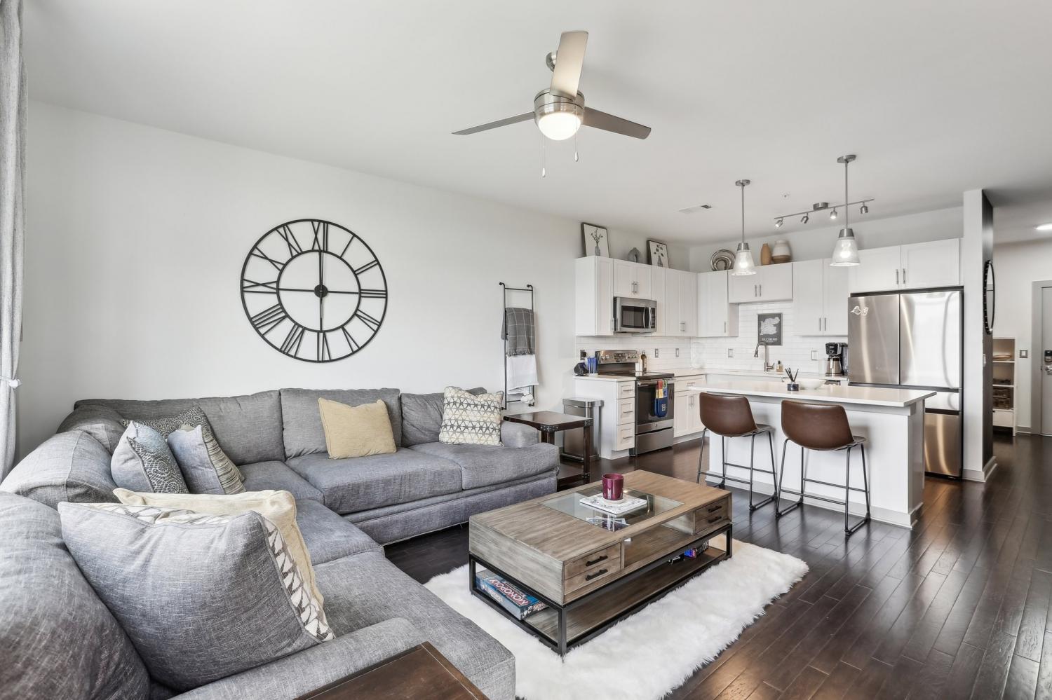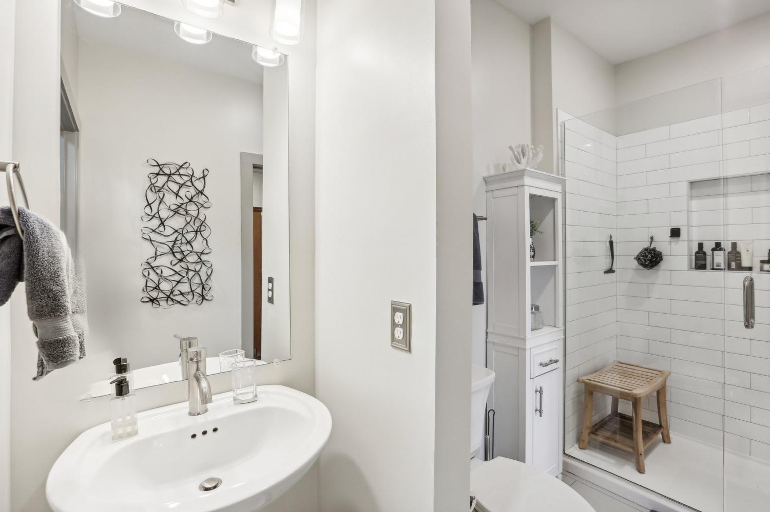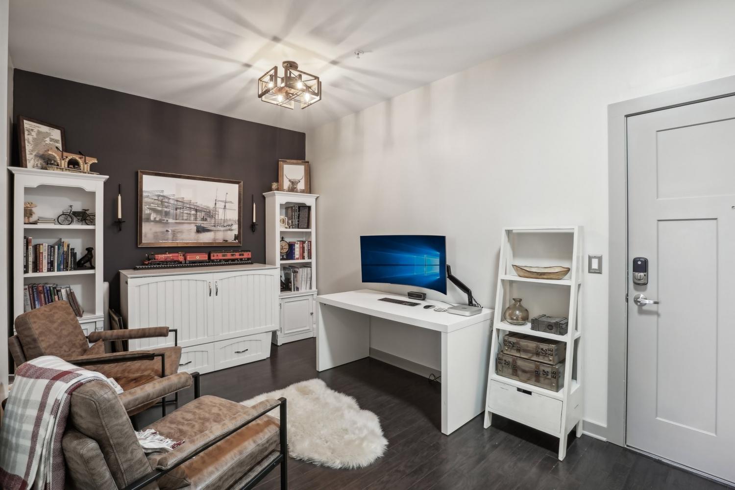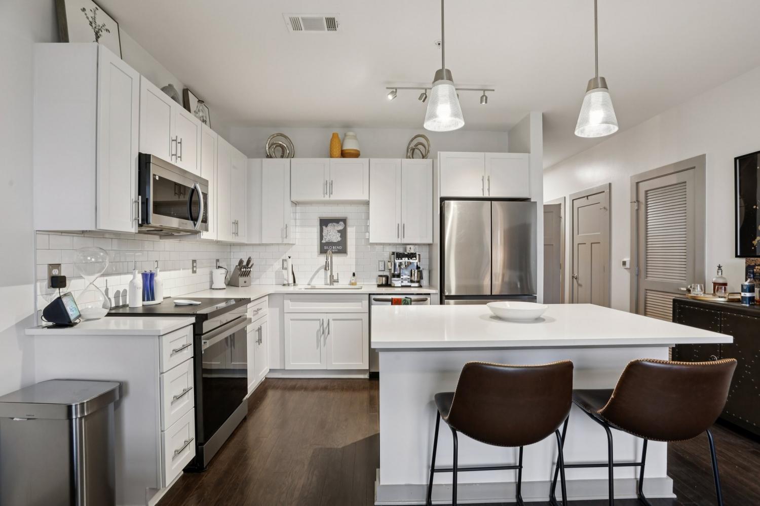 Stunning riverfront view condo in the highly sought-after Silo House, nestled in The Nations neighborhood. Just a short stroll from popular dining and shopping, and only minutes from downtown Nashville, this exceptional unit is especially special with expansive windows and a private balcony overlooking the Cumberland River. Bright, airy, and open, it boasts premium features including custom remote blinds, high end custom closet system, hardwood floors, stainless steel smart appliances new January 2025, induction stove, a large kitchen island, and quartz countertops. The tiled bathroom includes a frameless glass shower, custom vanity with sink and storage, plus a separate guest pedestal sink. Enjoy a spacious $5,000 walk-in custom closet by Closets by Design with a built in dual hamper... includes a lifetime warranty. Unit features a versatile bonus multi-use room that can serve as an office. All kitchen appliances remain, including the new induction stove and washer and dryer! Conveniently located in the same building as the impressive fitness center and gorgeous swimming pool with grilling stations and pergola. Don’t miss this one!