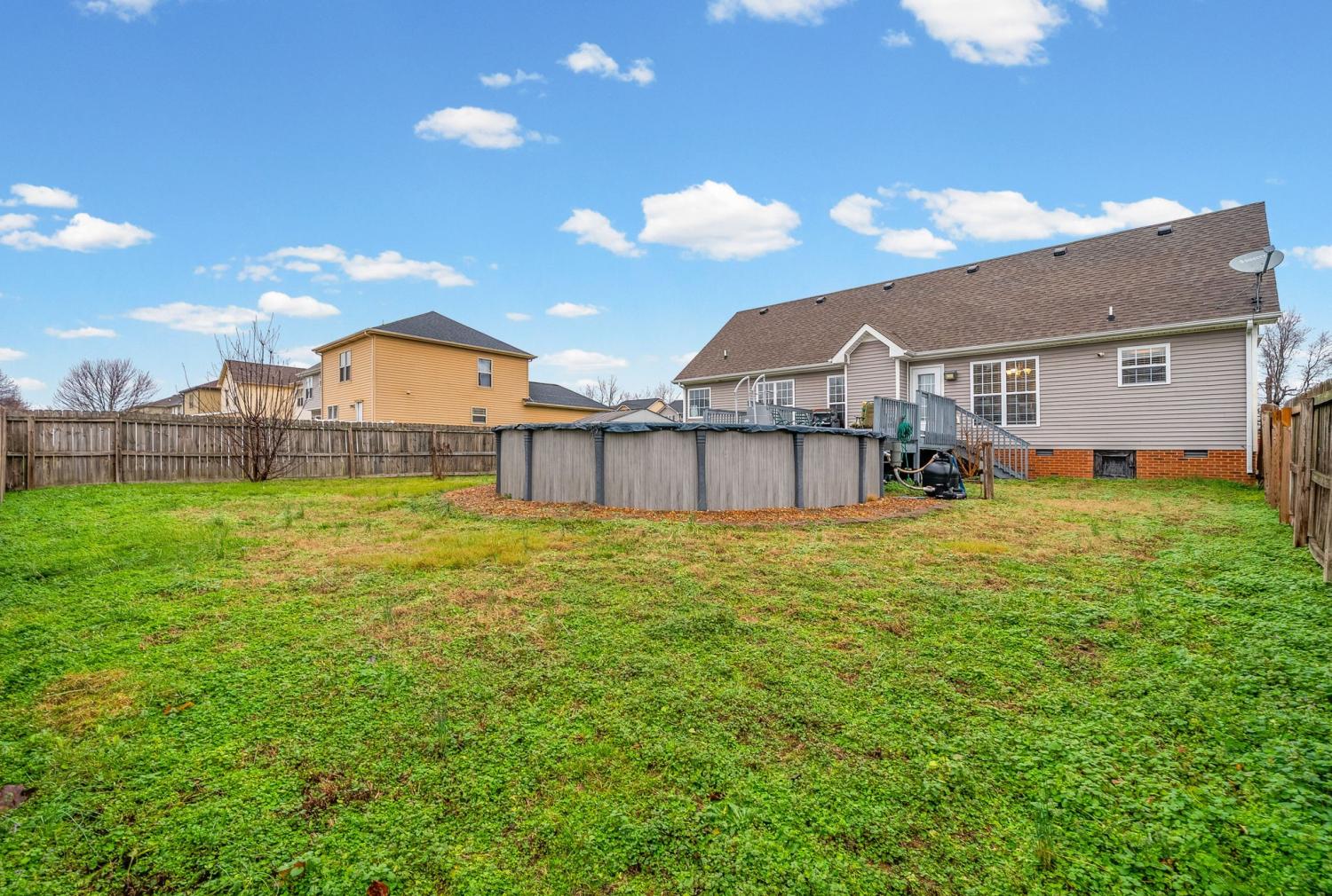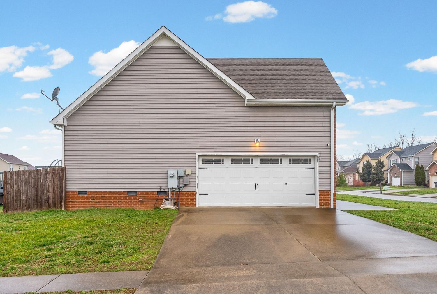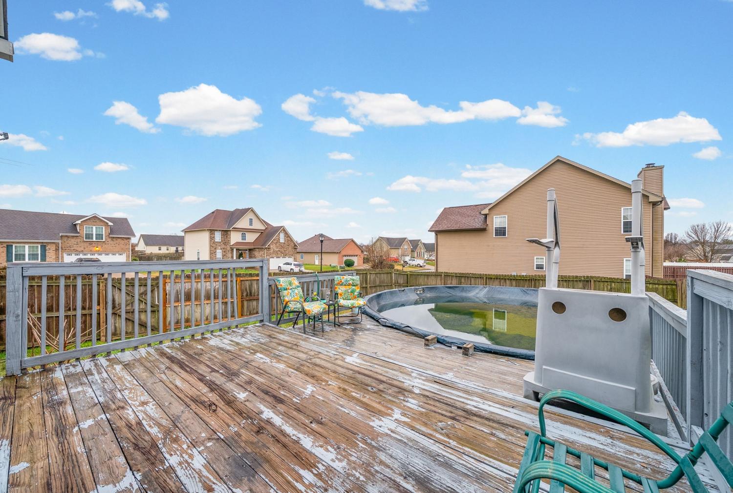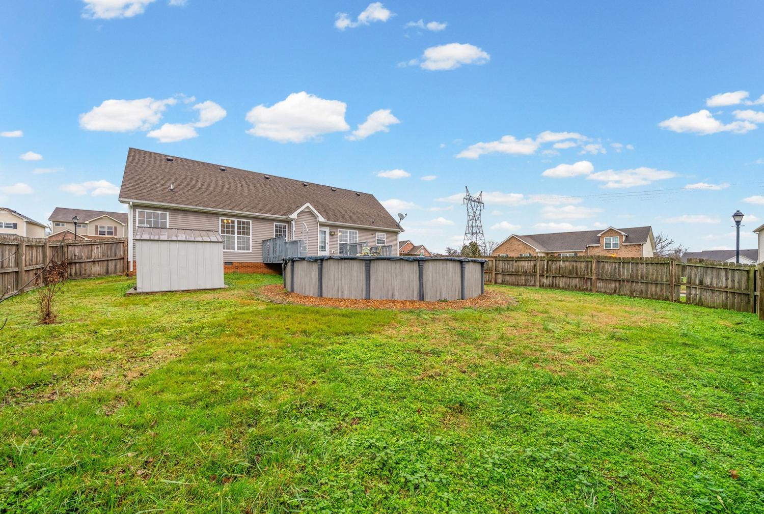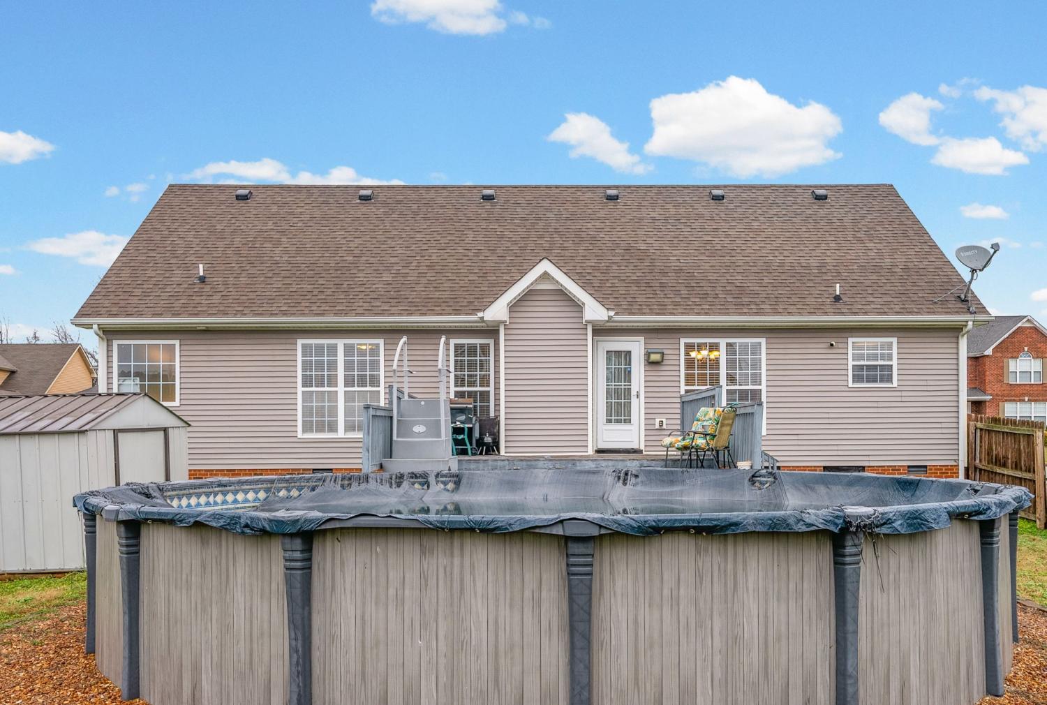 Beautiful corner-lot ranch in Meriweather Subdivision with easy main-level living and quick access to Tiny Town Rd, Wilma Rudolph Blvd, and Ft. Campbell. Step inside to an open floor plan featuring vaulted ceilings in the living room and a cozy gas fireplace, perfect for relaxing or entertaining. The kitchen is a standout with quartz countertops, a double pantry, and ample workspace for cooking and hosting. The primary suite is thoughtfully designed with no carpet, a huge walk-in closet, double vanities, a soaking jacuzzi tub, and a separate stand-up shower for a spa-like feel. Upstairs, you’ll find a gigantic bonus room above the garage complete with a walk-in closet, offering flexibility as a rec room, home office, or 4th bedroom. Enjoy outdoor living with a deck overlooking an above-ground pool, a privacy-fenced backyard, and a storage shed for extra convenience. This home combines comfort, functionality, and an unbeatable location—don’t miss your chance to see it!