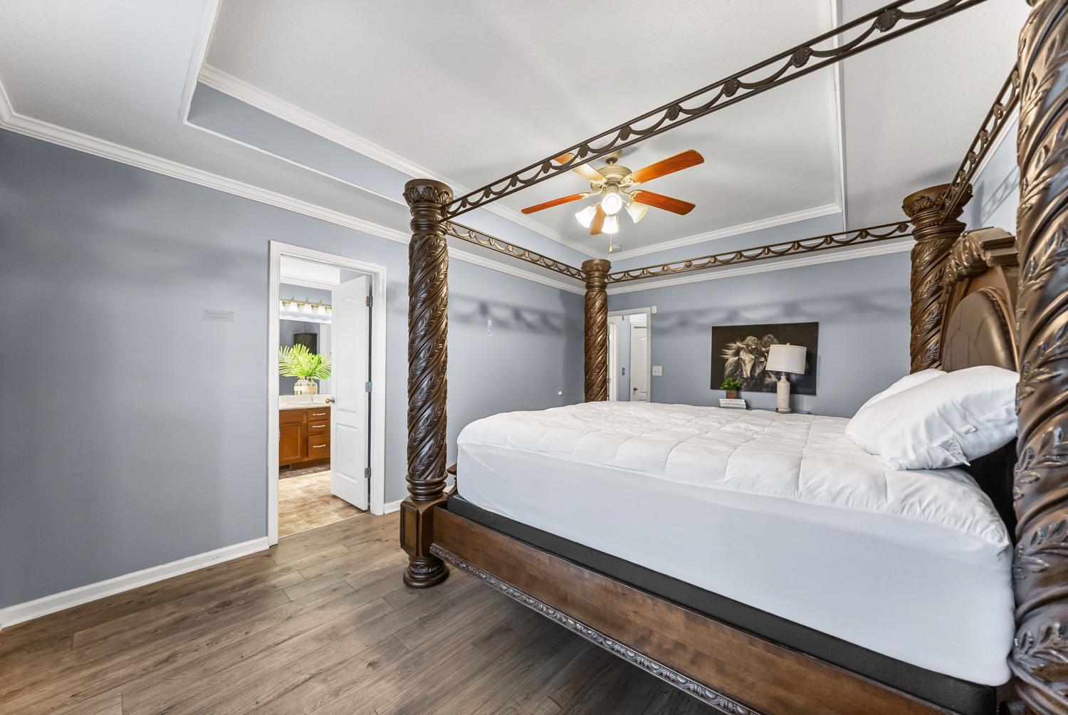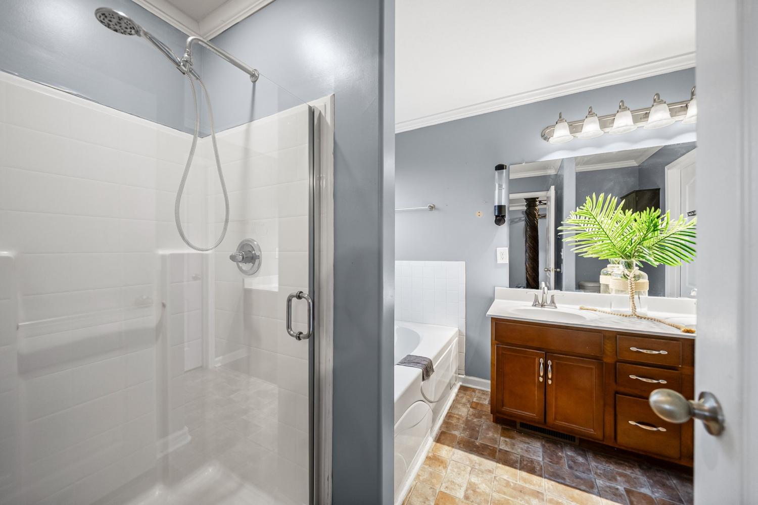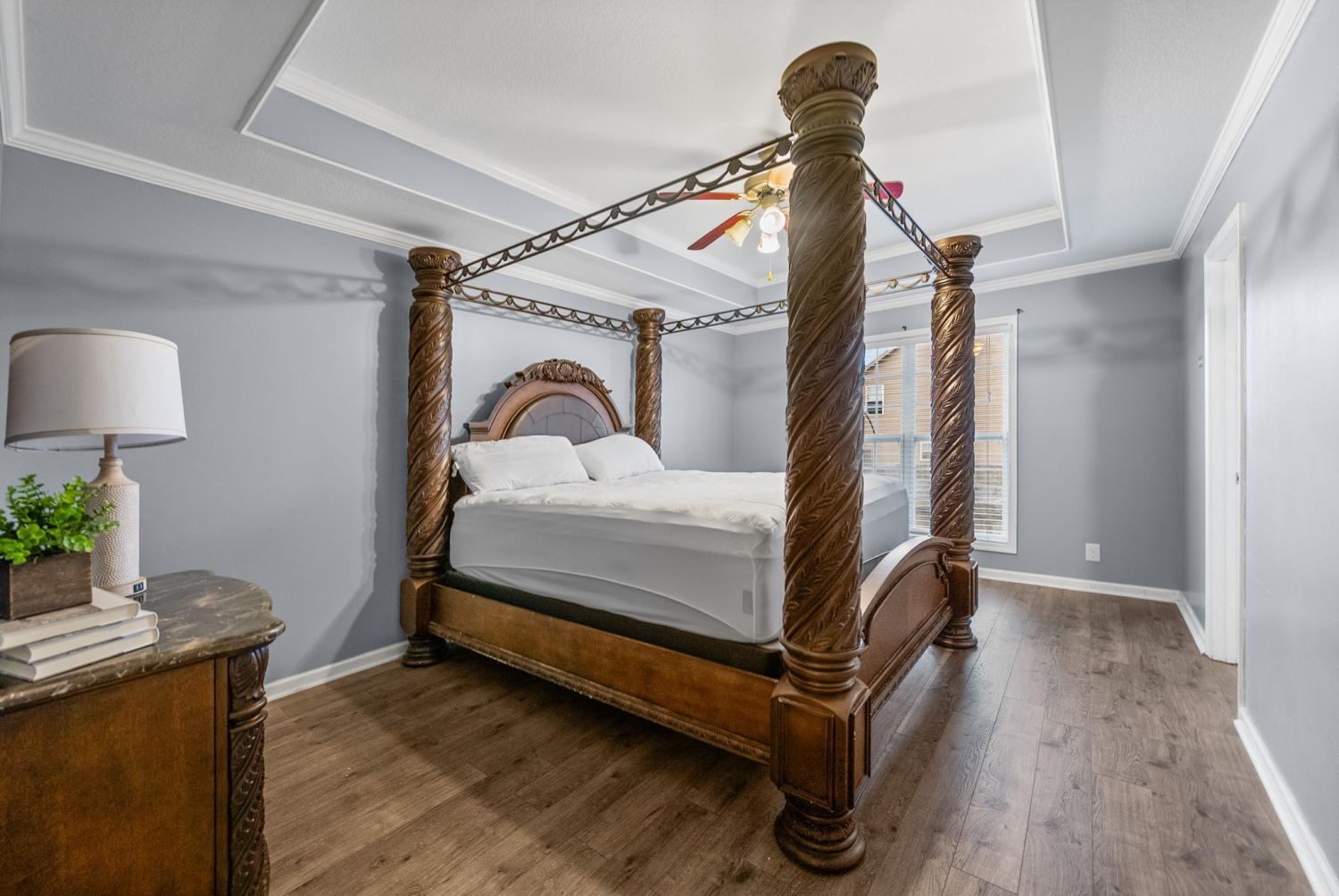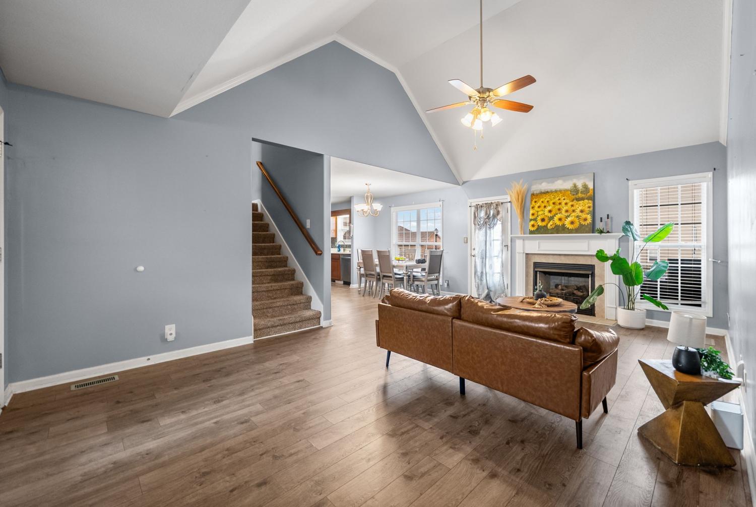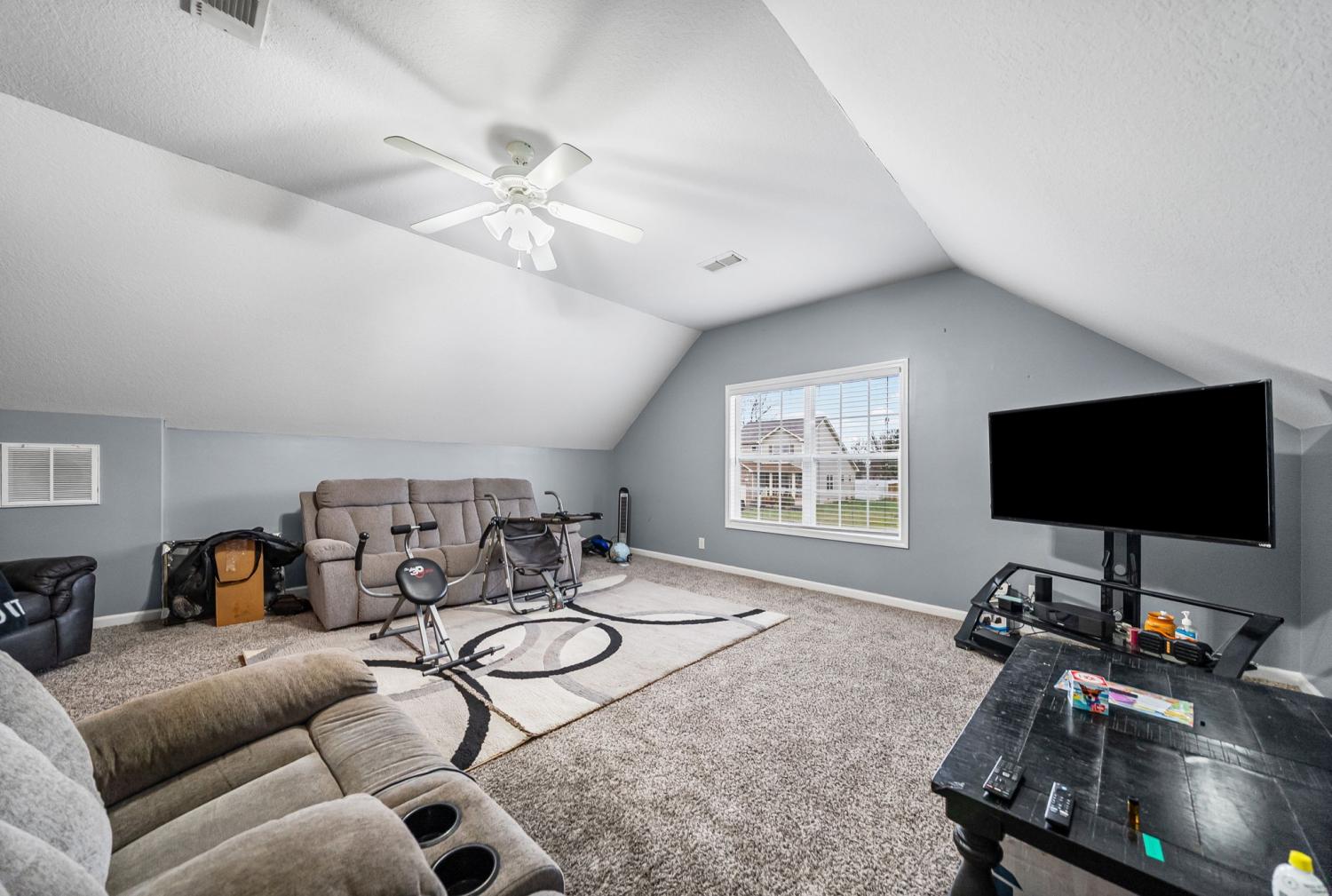 Beautiful corner-lot ranch in Meriweather Subdivision with easy main-level living and quick access to Tiny Town Rd, Wilma Rudolph Blvd, and Ft. Campbell. Step inside to an open floor plan featuring vaulted ceilings in the living room and a cozy gas fireplace, perfect for relaxing or entertaining. The kitchen is a standout with quartz countertops, a double pantry, and ample workspace for cooking and hosting. The primary suite is thoughtfully designed with no carpet, a huge walk-in closet, double vanities, a soaking jacuzzi tub, and a separate stand-up shower for a spa-like feel. Upstairs, you’ll find a gigantic bonus room above the garage complete with a walk-in closet, offering flexibility as a rec room, home office, or 4th bedroom. Enjoy outdoor living with a deck overlooking an above-ground pool, a privacy-fenced backyard, and a storage shed for extra convenience. This home combines comfort, functionality, and an unbeatable location—don’t miss your chance to see it!