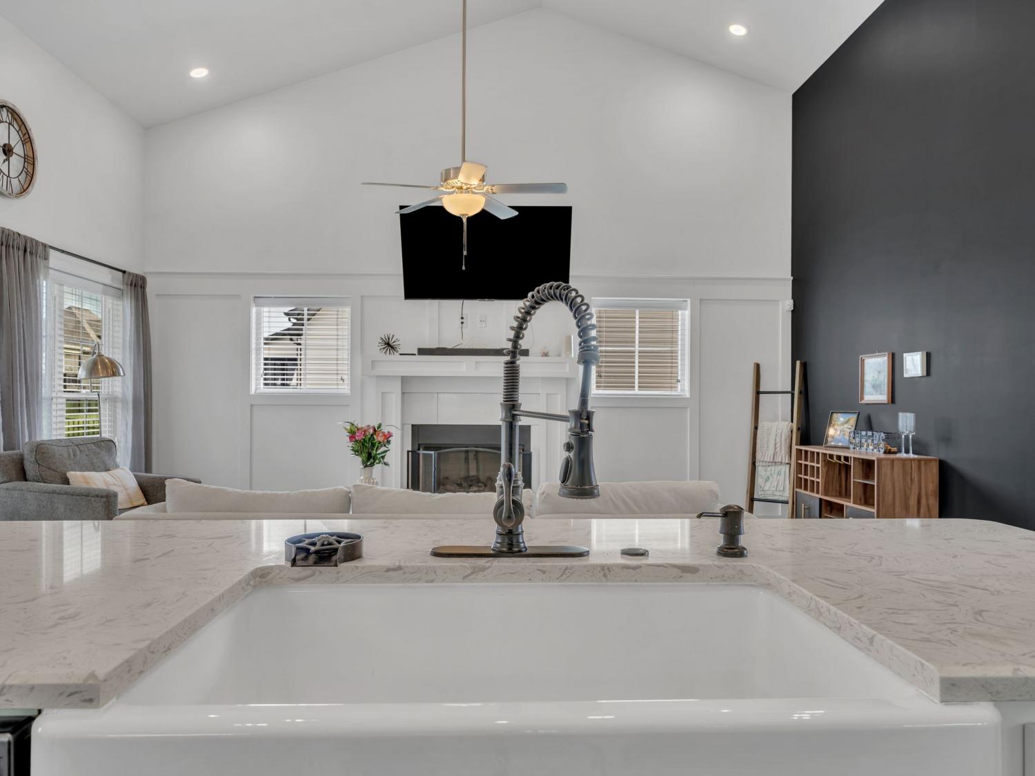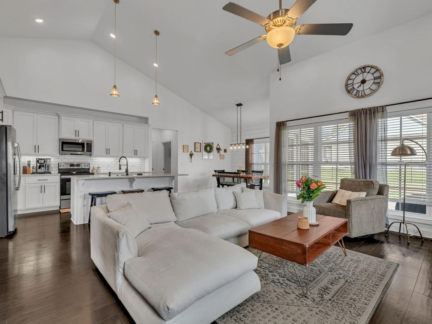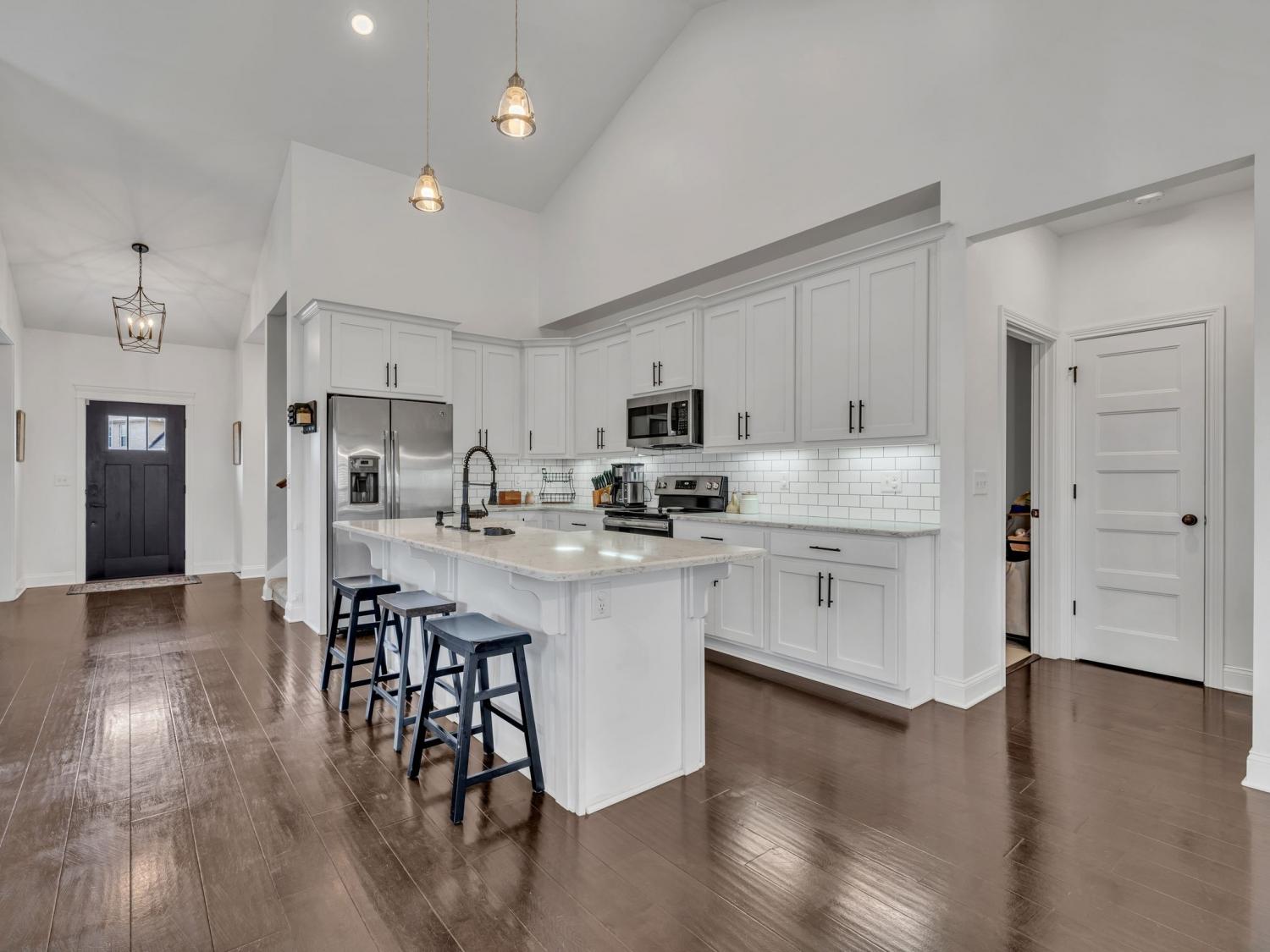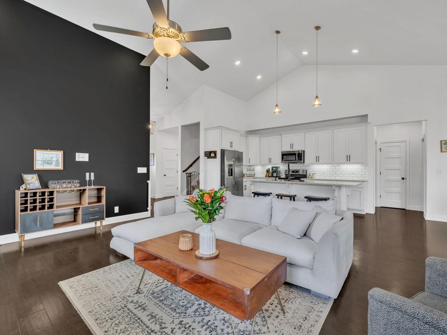 This stunning modern home welcomes you with a charming rocking chair front porch and an open, light-filled interior. Soaring ceilings, beautiful flooring, custom trim work, shiplap accents, and an abundance of windows create a warm yet stylish atmosphere. The white kitchen features stainless steel appliances, a farmhouse sink, pantry, and generous island with extra seating—perfect for everyday living and entertaining. Open-concept living areas center around a cozy fireplace. The spacious main-level primary suite offers high ceilings, a walk-in closet with built-in shelving, and a spa-like bath with double sinks, a separate shower, and a soaking tub. Upstairs, you’ll find spacious secondary bedrooms and a large bonus room ideal for a media room, playroom, gaming room.or teen hangout. Step outside to enjoy a fenced, level yard with both patio and covered patio spaces—perfect for relaxing or entertaining. Crawlspace is encapsulated. Conveniently located near shopping, dining, parks, and I-24 access, with excellent neighborhood amenities to enjoy. 1% lender credit with use of preferred lender.