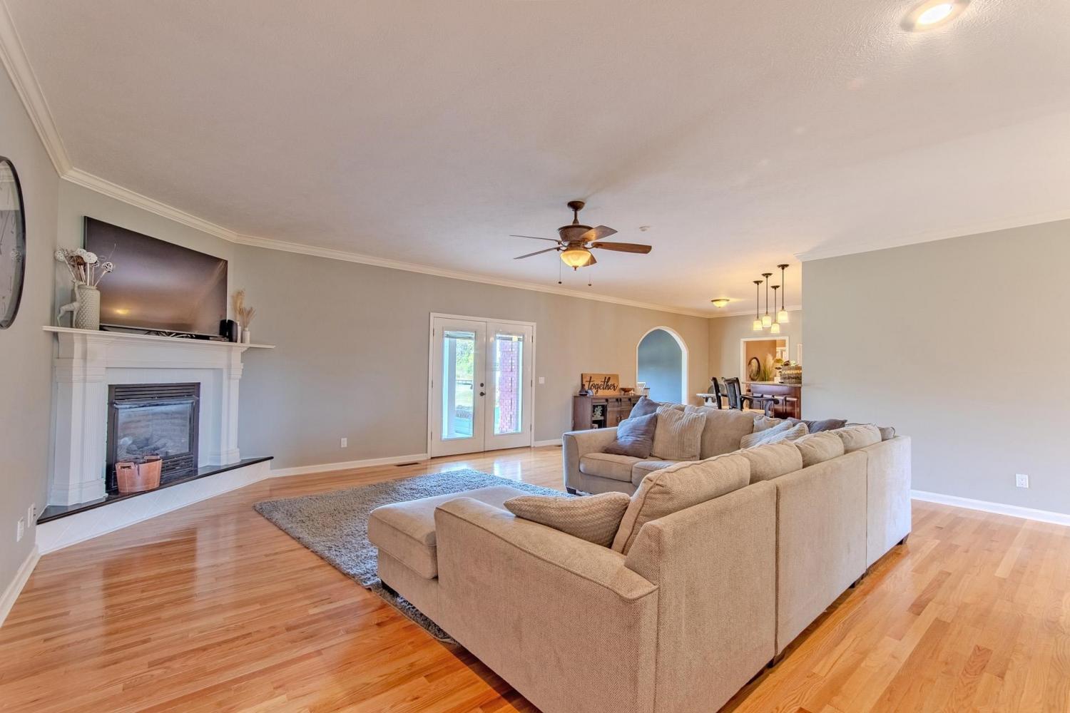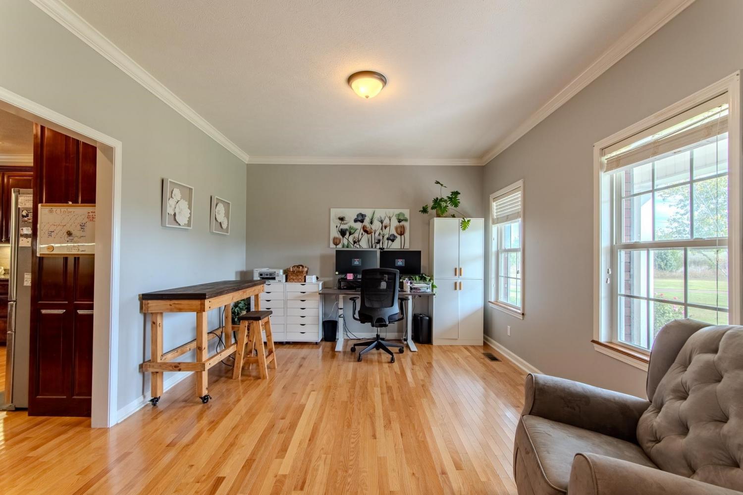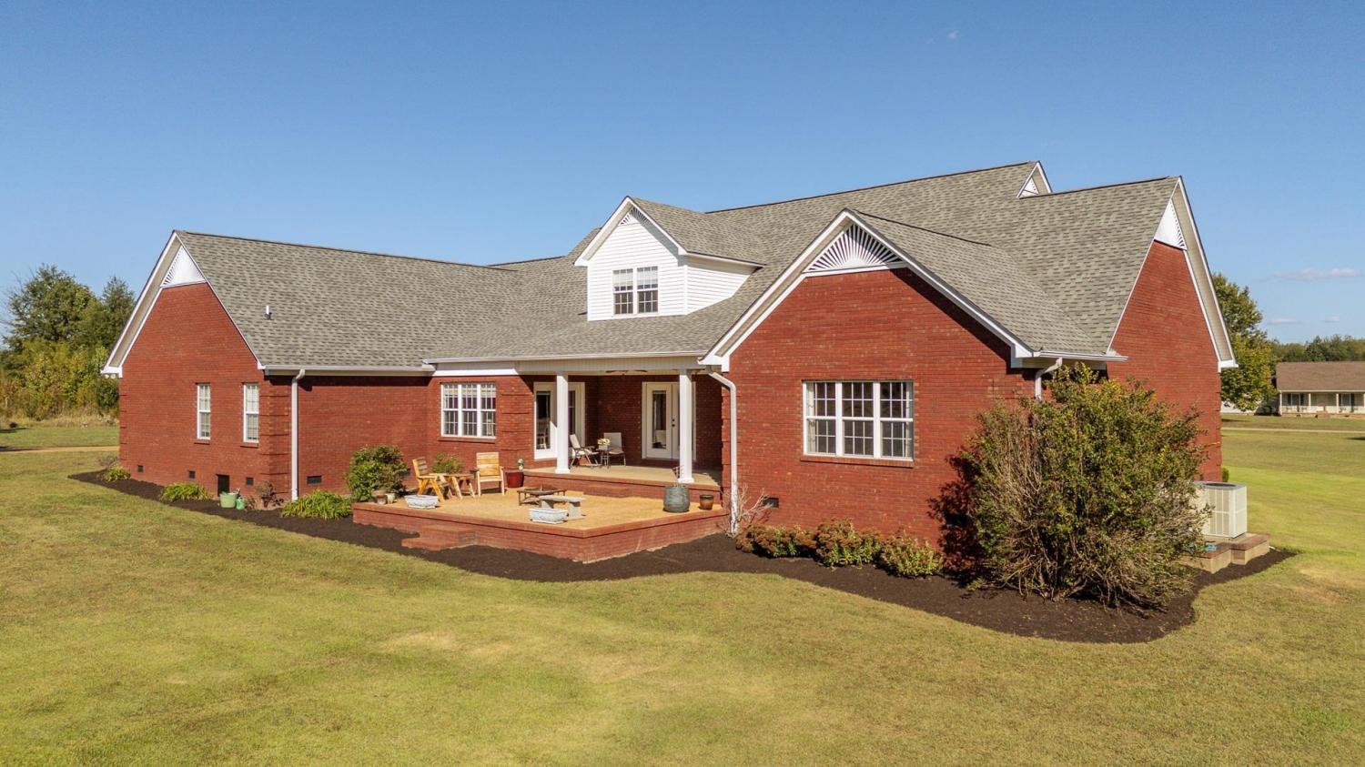 Perfect All-Brick Home on 4.5+/- Acres! This stunning 4 bedroom, 4.5 bath home offers 3,935+/- square feet of comfortable living space - all on one level with a spacious bonus room upstairs. Designed for modern living, the open floor plan features a large kitchen with abundant cabinetry, granite countertops, and a separate dining room ideal for family gatherings. The primary suite is a true retreat with a walk-in tiled shower, double sinks, and a whirlpool tub. Gorgeous hardwood flooring flows throughout, and the home includes both security and fire alarm systems for peace of mind. Enjoy outdoor living on your 4.5+/- acre property complete with a large stocked pond, detached workshop with overhead storage, and a concrete drive. The partial basement serves as a storm shelter for added safety. Conveniently located just minutes from a private school, the Tennessee River, and a public boat ramp. This home truly offers the perfect blend of comfort, quality, and country charm!