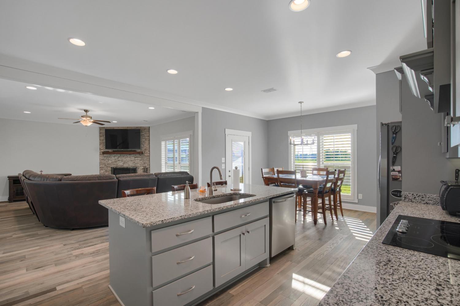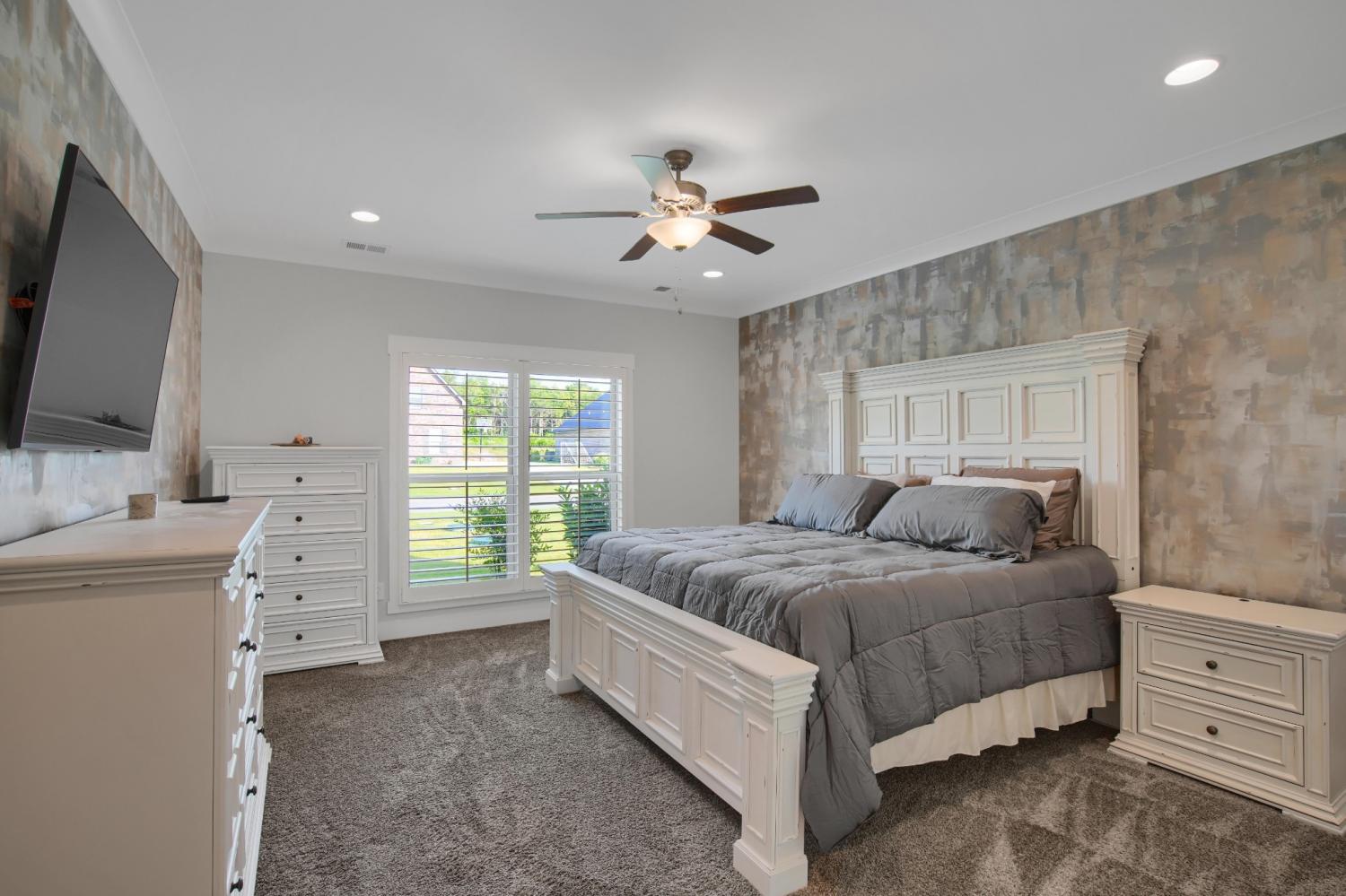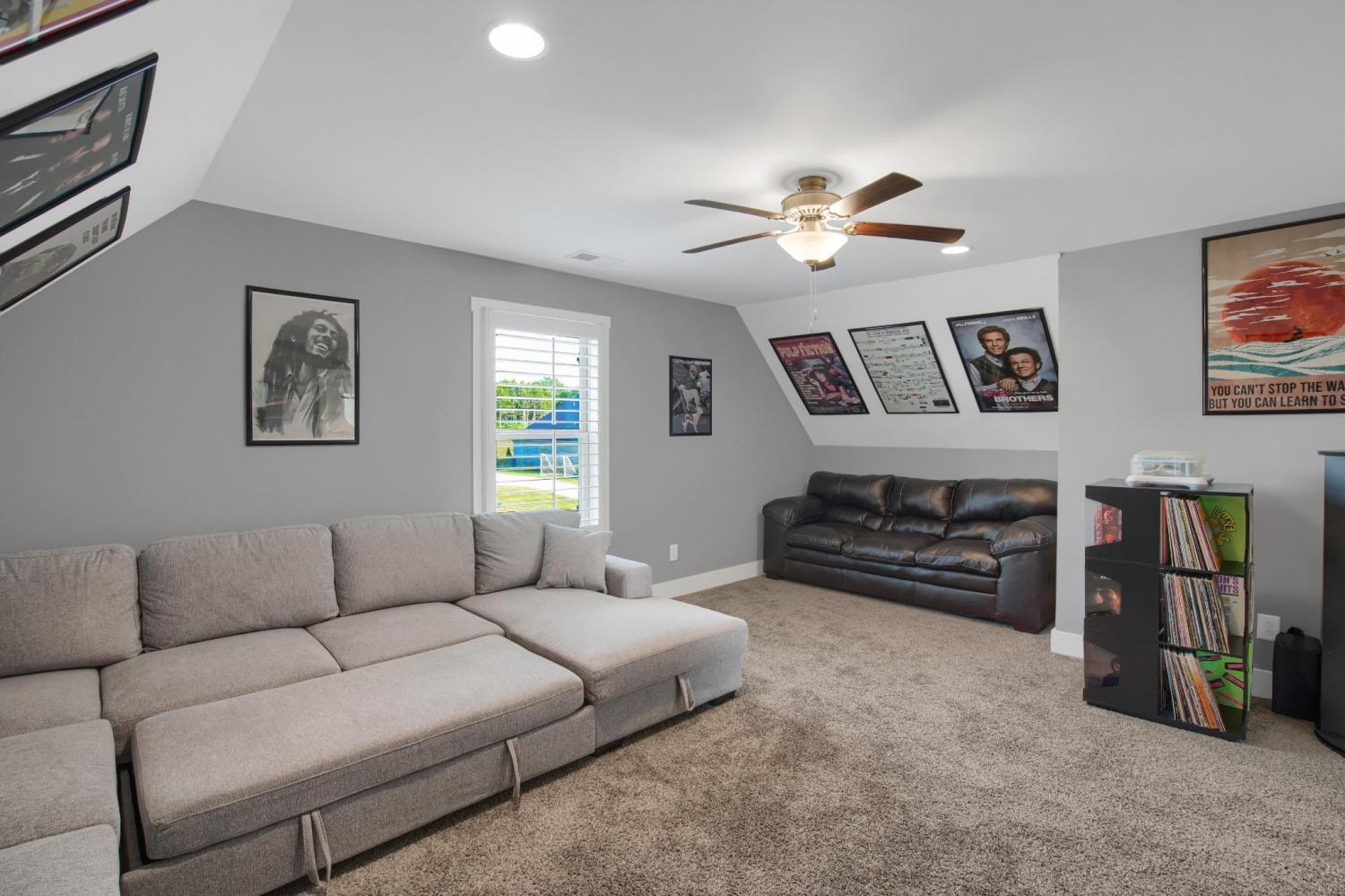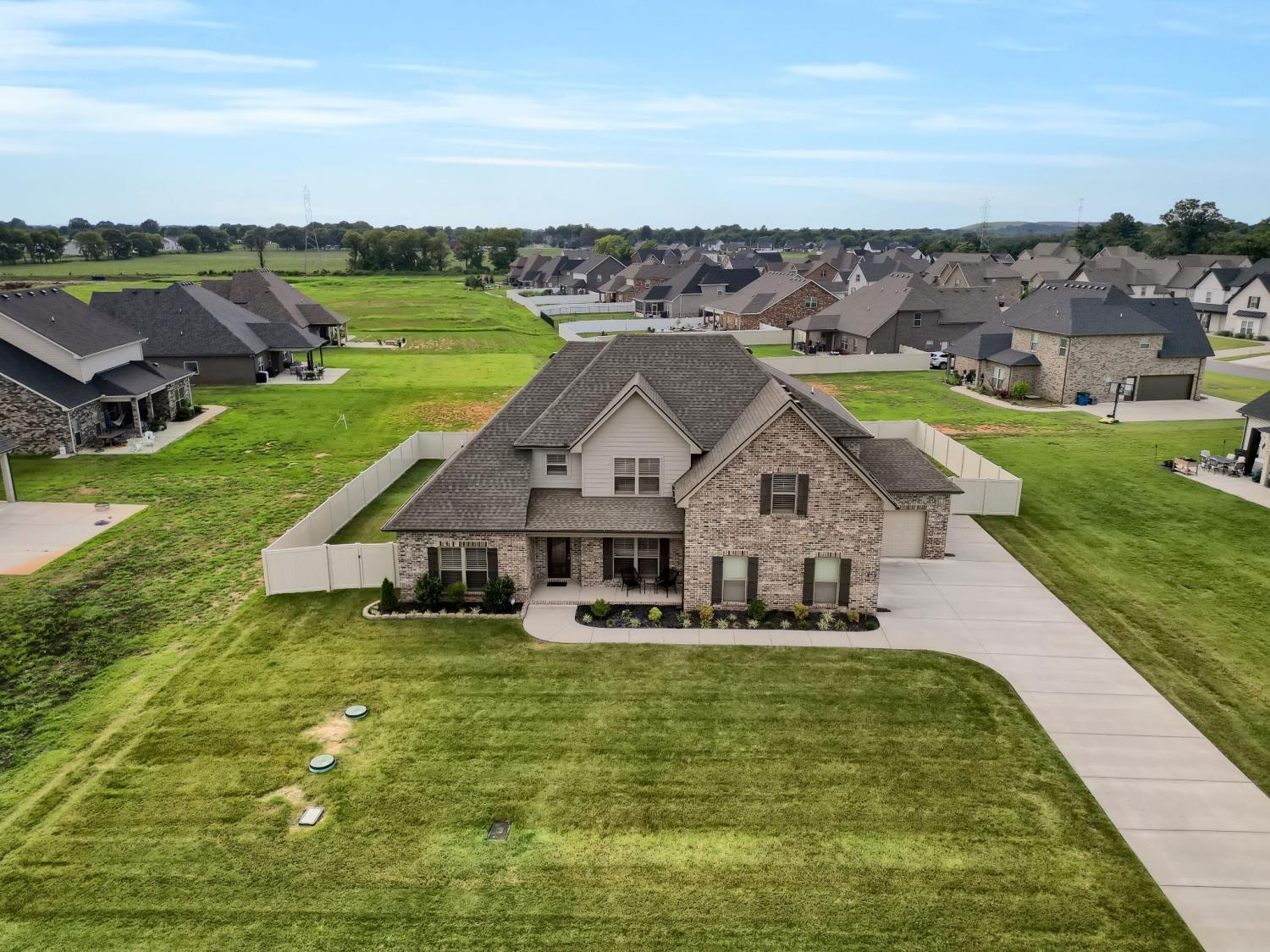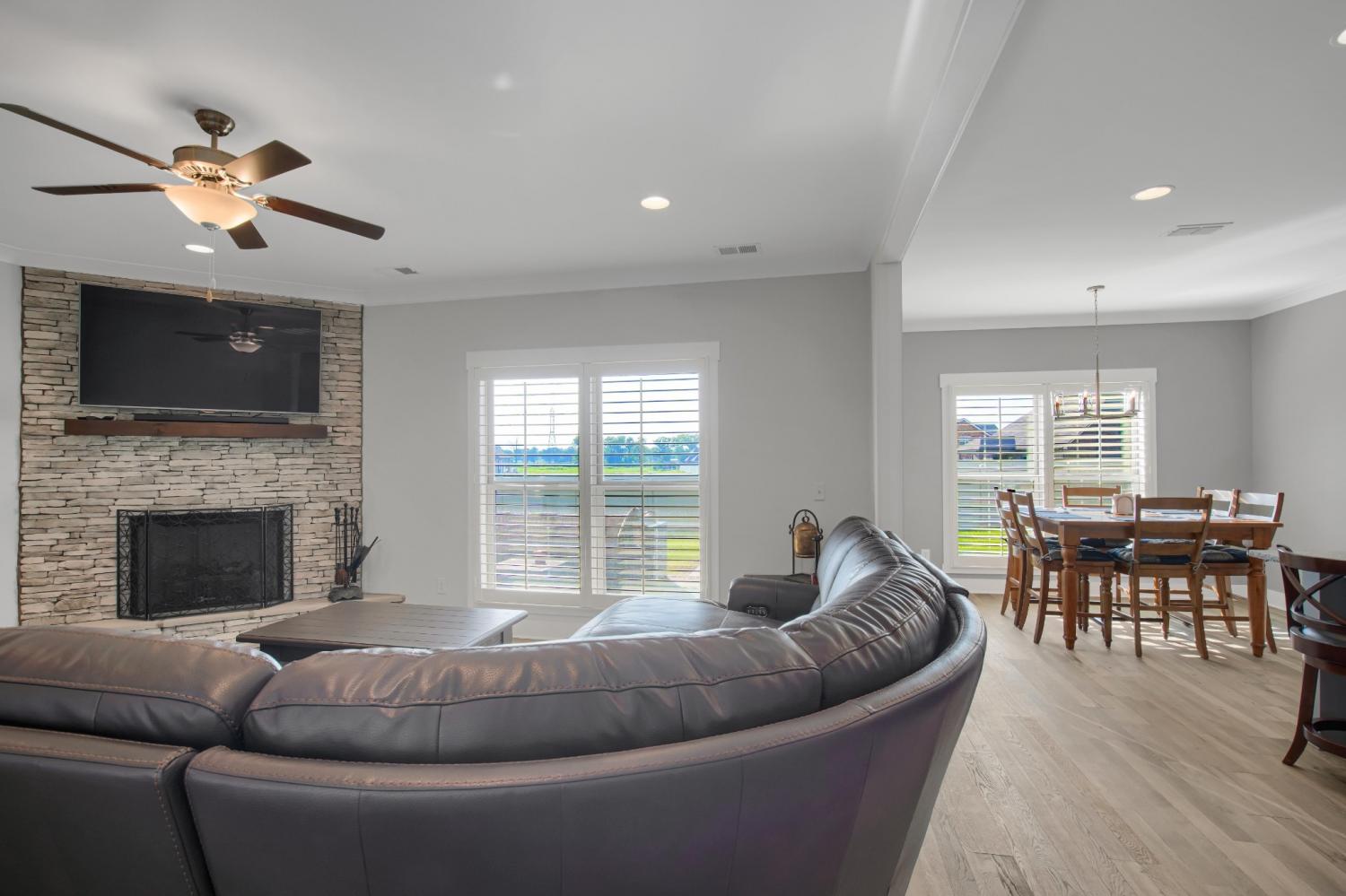 Total Turnkey! This home is available with all furniture for purchase, making it a rare opportunity for first time buyers or anyone looking for a move-in-ready experience. Immaculate and truly better than new, this all-brick home is loaded with upgrades- including plantation shutters, a full vinyl privacy fence and extensive custom shelving. Inside, you'll find a spacious open layout with a welcoming foyer, cozy fireplace, and stunning hardwood floors throughout the main level and stairs. The gourmet kitchen features granite countertops and custom cabinetry, while the formal dining and breakfast rooms offer flexibility for gatherings. The luxurious primary suite include double vanities, a tiled shower and walk-in closet. With 4 bedrooms, 3.5 bathrooms, and a versatile bonus room, this home provides ample living space. Plush carpet in the bedrooms adds comfort, while tile in all wet areas offer durability. The covered patio is perfect for relaxing outdoors. Uniquely situated for maximum privacy in a neighborhood setting- this lot sits between two streets with no immediate rear neighbors in view. Furniture package available for $30,000