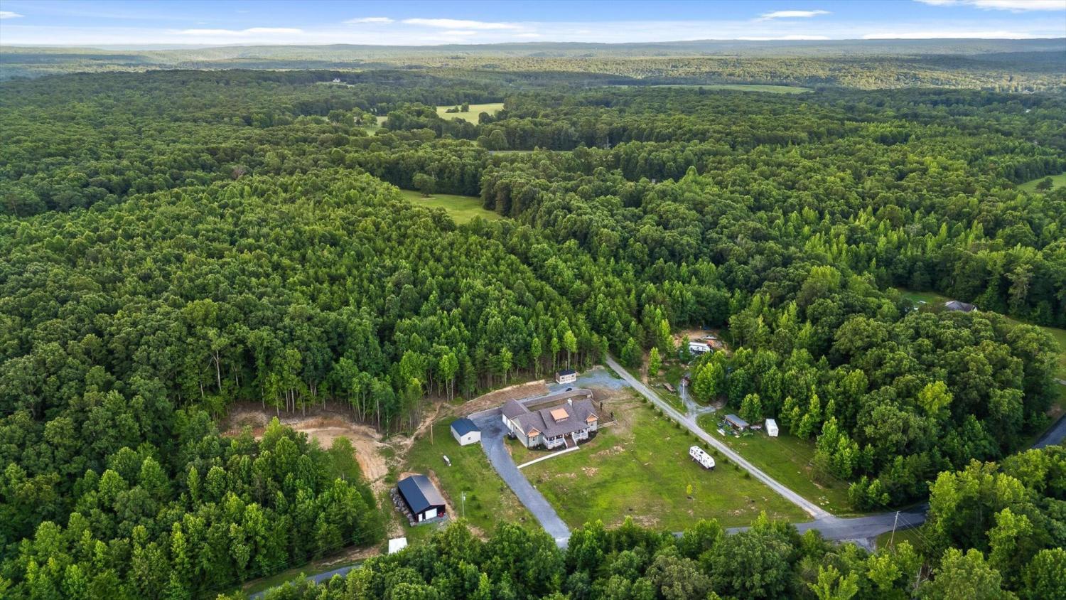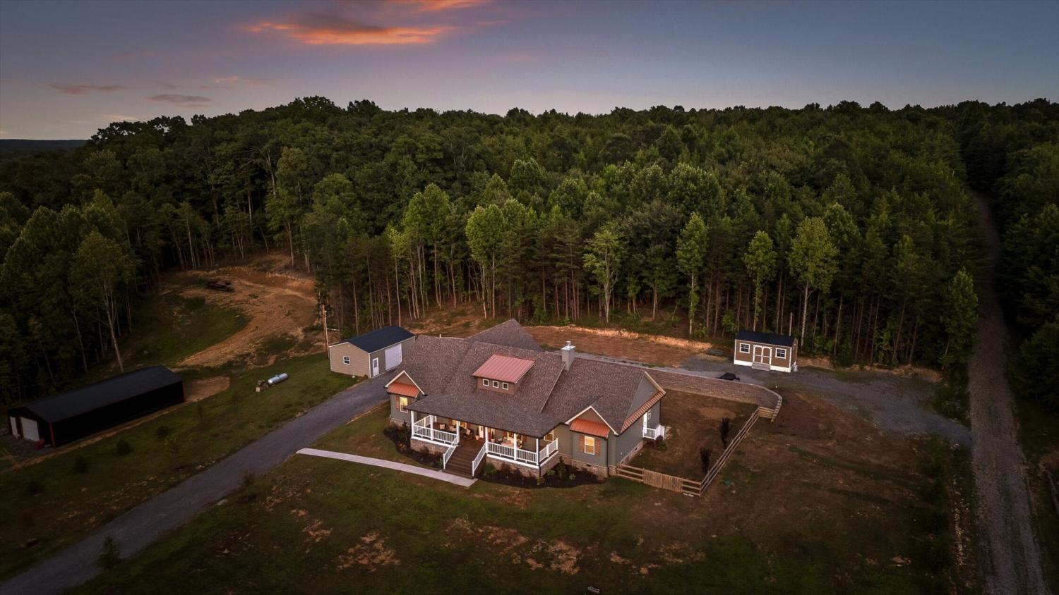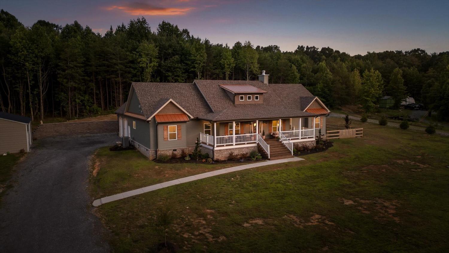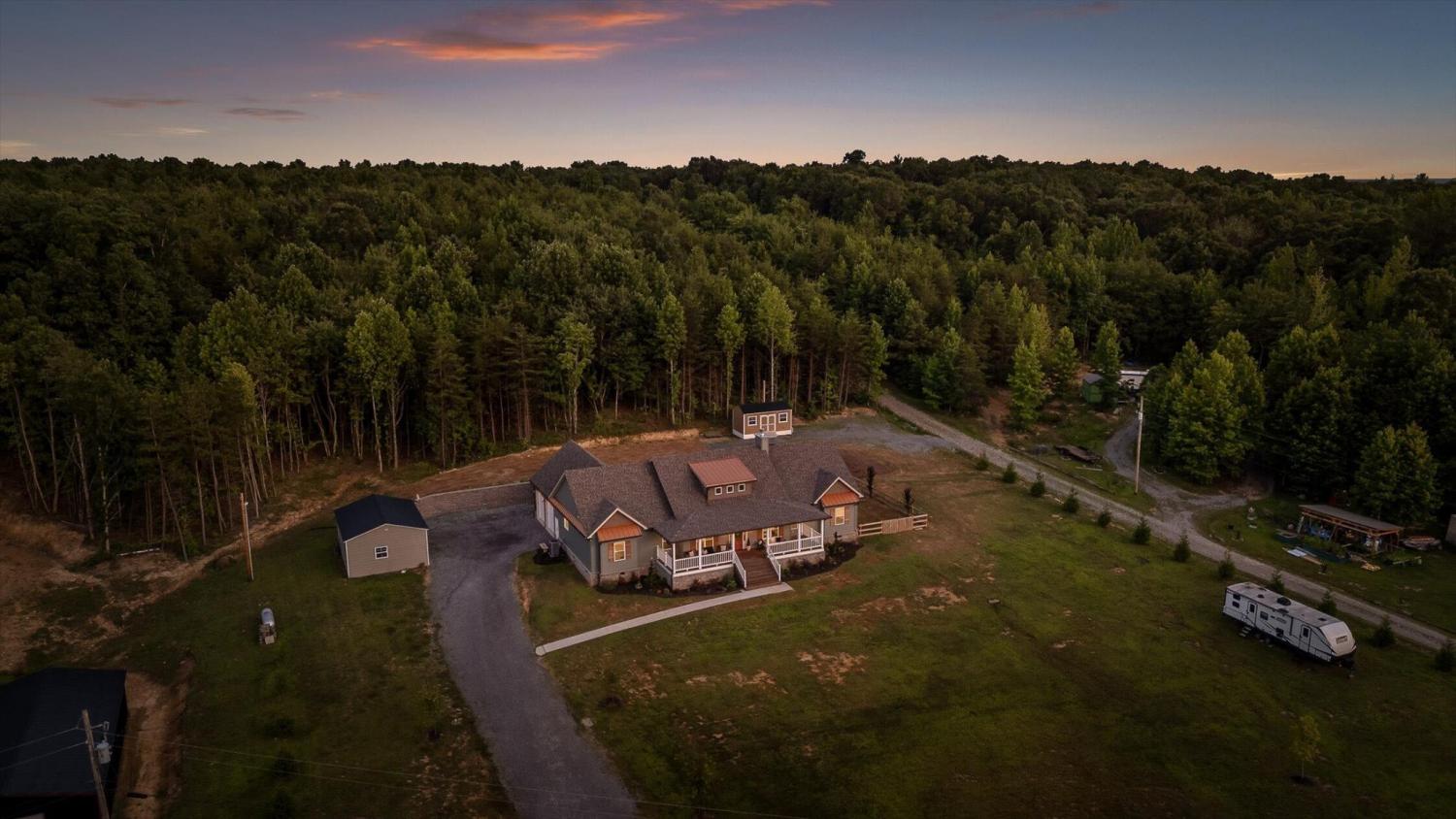 Privately positioned on just under four gently rolling, usable acres, this thoughtfully built custom home offers space, flexibility, and true freedom from HOA restrictions. The setting feels removed yet remains convenient to both Dunlap and Chattanooga, striking a rare balance between breathing room and accessibility. Nearly 3,000 square feet are arranged primarily on the main level, creating a layout well suited for both everyday living and long-term plans. Designed with intention, the split-bedroom floor plan allows privacy across multiple wings of the home. Two full primary suites sit on opposite sides, each featuring gas fireplaces, walk-in closets, and well-appointed ensuite baths with zero-curb tile showers for comfort and accessibility. A third main-level bedroom is located near a full hall bath, along with a separate half bath for guests. Upstairs, a private fourth bedroom with its own ensuite bath offers ideal separation for visitors, a home office, or live-in support without disrupting the main living areas. The heart of the home features vaulted ceilings, abundant natural light, and an open-concept living space anchored by a well-designed kitchen with farmhouse sink, gas range with pot filler, custom vent hood, and a large island with seating. The kitchen flows seamlessly into the dining and living areas, framed by expansive windows overlooking the backyard. Just outside, a covered patio with gas grill line extends the living space and was intentionally planned with future courtyard or pool potential. Outdoors, approximately two acres are cleared and usable, complemented by additional wooded acreage for privacy. The wraparound front porch creates a welcoming approach, while the encapsulated crawl space adds peace of mind. An oversized two-car garage supports daily needs, and a 550+ sq ft metal outbuilding with roll-up and man door access provides excellent space for hobbies, equipment, or workshop use.