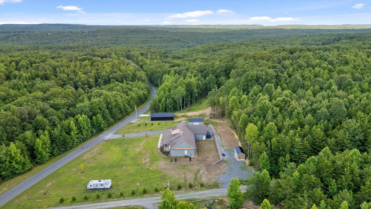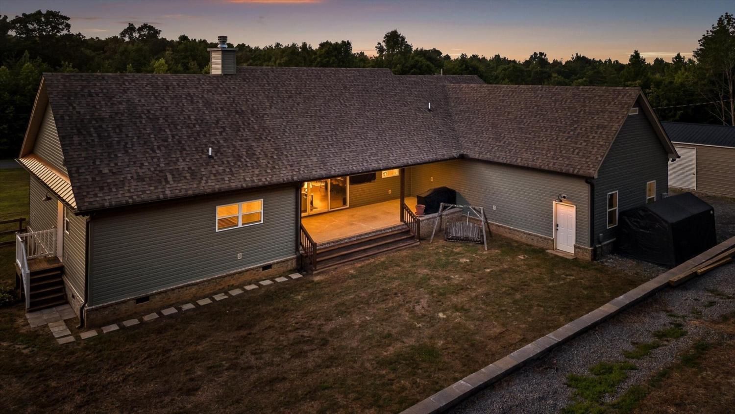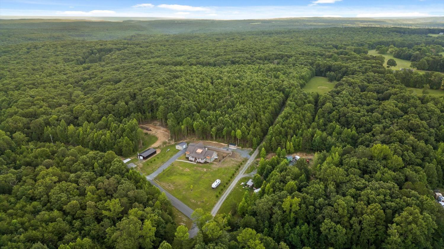 Privately positioned on just under four gently rolling, usable acres, this thoughtfully built custom home offers space, flexibility, and true freedom from HOA restrictions. The setting feels removed yet remains convenient to both Dunlap and Chattanooga, striking a rare balance between breathing room and accessibility. Nearly 3,000 square feet are arranged primarily on the main level, creating a layout well suited for both everyday living and long-term plans. Designed with intention, the split-bedroom floor plan allows privacy across multiple wings of the home. Two full primary suites sit on opposite sides, each featuring gas fireplaces, walk-in closets, and well-appointed ensuite baths with zero-curb tile showers for comfort and accessibility. A third main-level bedroom is located near a full hall bath, along with a separate half bath for guests. Upstairs, a private fourth bedroom with its own ensuite bath offers ideal separation for visitors, a home office, or live-in support without disrupting the main living areas. The heart of the home features vaulted ceilings, abundant natural light, and an open-concept living space anchored by a well-designed kitchen with farmhouse sink, gas range with pot filler, custom vent hood, and a large island with seating. The kitchen flows seamlessly into the dining and living areas, framed by expansive windows overlooking the backyard. Just outside, a covered patio with gas grill line extends the living space and was intentionally planned with future courtyard or pool potential. Outdoors, approximately two acres are cleared and usable, complemented by additional wooded acreage for privacy. The wraparound front porch creates a welcoming approach, while the encapsulated crawl space adds peace of mind. An oversized two-car garage supports daily needs, and a 550+ sq ft metal outbuilding with roll-up and man door access provides excellent space for hobbies, equipment, or workshop use.