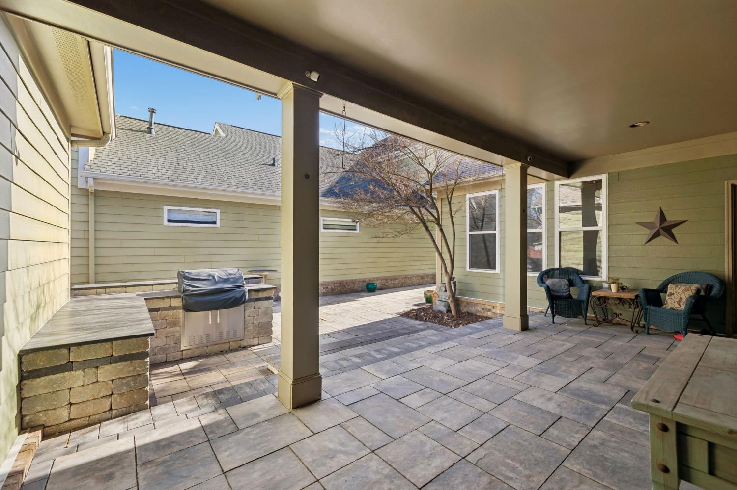 Thoughtfully designed and beautifully maintained, this unique bungalow-style home offers nearly 3,200 square feet of flexible living space centered around a private, hardscaped courtyard and nestled in this wonderful gated community of the Village at Providence. With three bedrooms and three full baths, the layout provides a rare blend of comfort, functionality, and character. The main living areas feature an easy, flowing design ideal for both everyday living and entertaining, while the upstairs bonus room offers exceptional versatility—perfect for a guest suite, studio, office, or additional living space. Natural light, architectural detail, and well-proportioned rooms create a warm, welcoming feel throughout the home. Outdoor living is a standout feature, with the recently upgraded courtyard serving as a peaceful retreat for relaxing or gathering with friends. A detached rear-entry garage enhances privacy and complements the home’s charming streetscape. Located in a desirable community with sidewalks and mature landscaping, this home offers low-maintenance living with timeless style—an exceptional opportunity for those seeking something truly distinctive. HOA maintains grounds outside of courtyard requiring very low maintenance. Amenities include Providence Swim Club, Clubhouse, Playground, and walking trails galore! Extremely convenient to I-40 and within walking distance to Providence shopping and dining. This one truly is special!