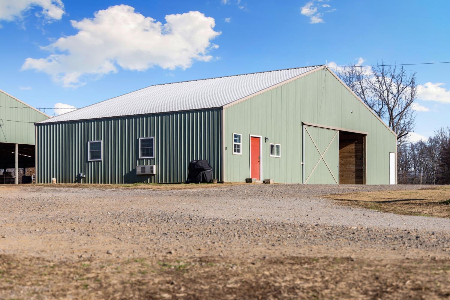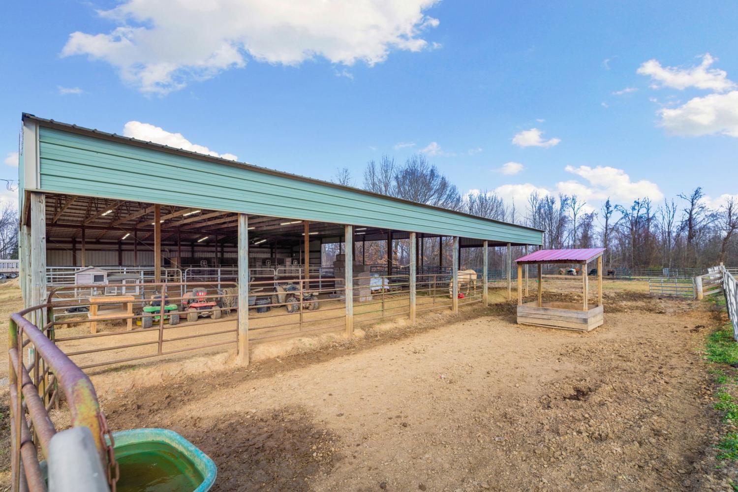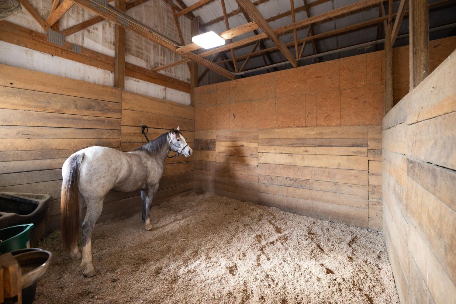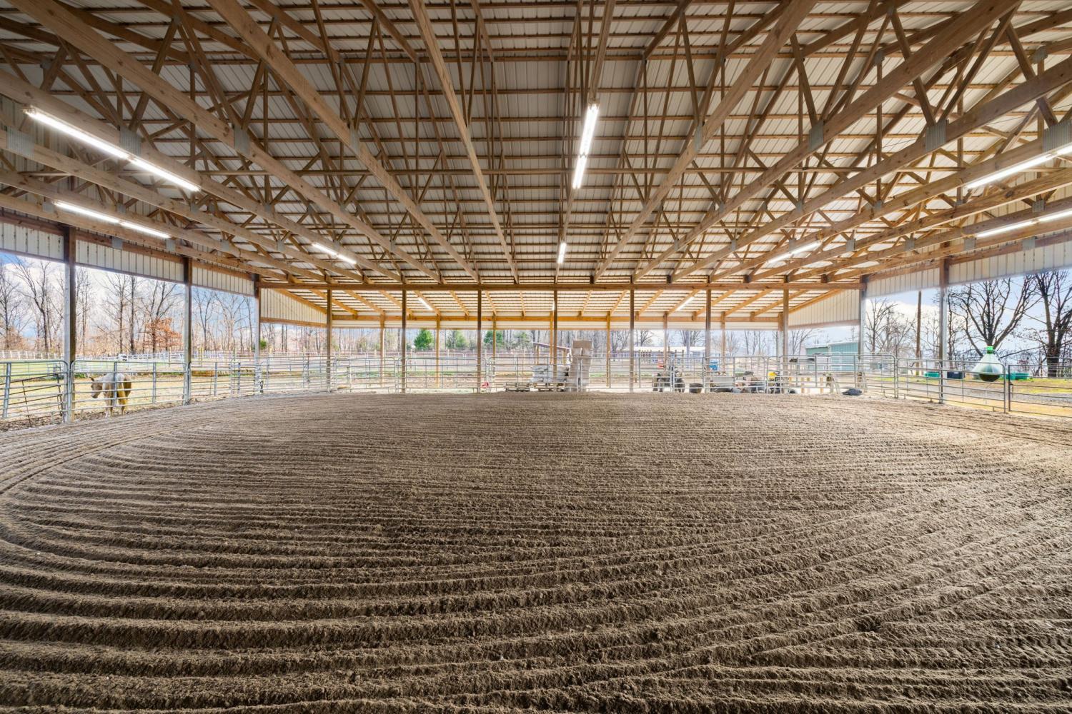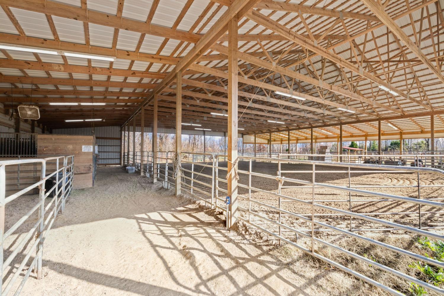 Turnkey 46-acre horse farm offering a complete, well-designed training facility. Improvements include a 60x80 covered arena with lights, sand footing, and two 20-ft side sheds, plus a separate outdoor arena. Eight total stalls—4 located off the covered arena and 4 inside the main barn, including three oversized 14x14 stalls ideal for foaling or studs and one 8x10 stall. Custom Armour Horse Stalls fronts with automatic watering system utilizing PEX piping, along with a dedicated feed room and tack room. Additional features include a six-horse walker, 30x50 hay barn, six run-in sheds, and frost-free hydrants to each pasture. Multiple fenced pastures provide excellent turnout. Attached to the barn is a comfortable barndominium with 1 bedroom, 1.5 baths, full kitchen, and laundry. New water well system installed in 2024. Ample room for future stall expansion within the covered arena, plus a separate potential building site already equipped with septic, water, and electric. Gated entrance. Move-in ready and built for year-round equestrian use.