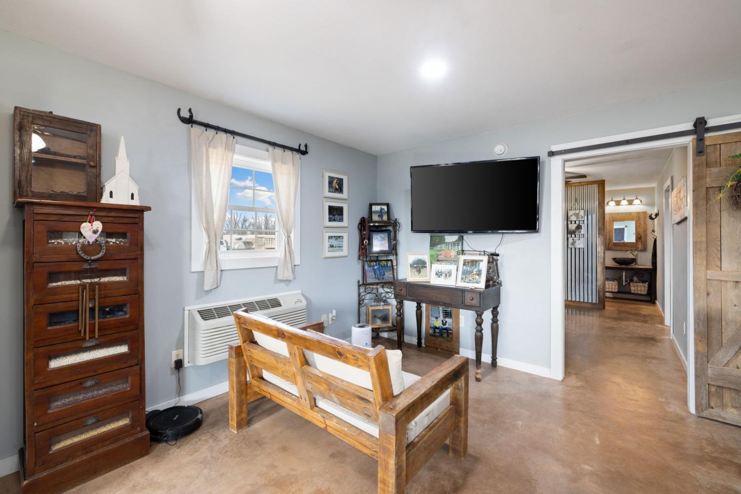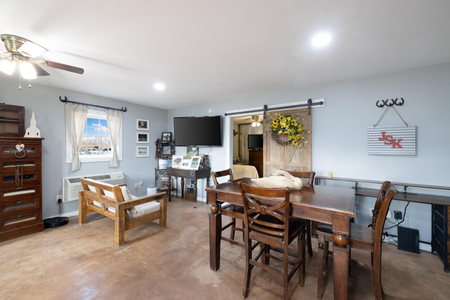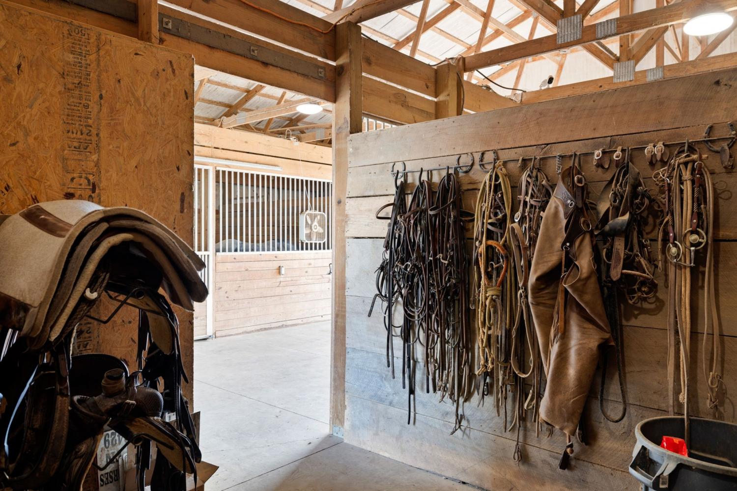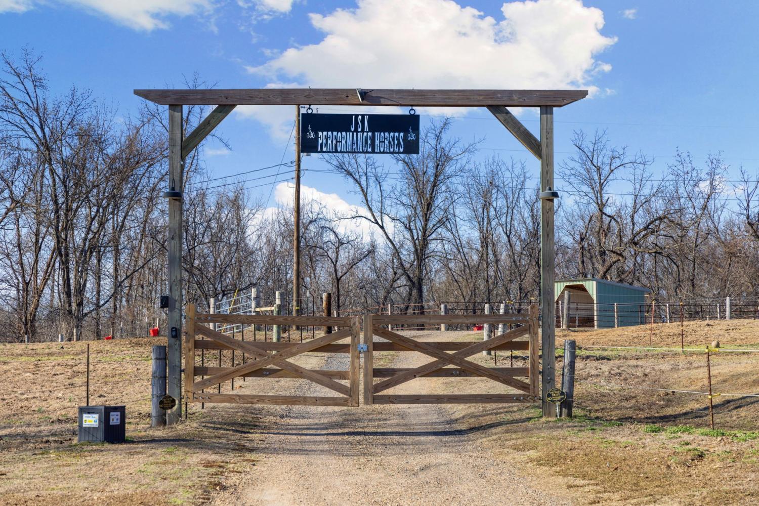 Turnkey 46-acre horse farm offering a complete, well-designed training facility. Improvements include a 60x80 covered arena with lights, sand footing, and two 20-ft side sheds, plus a separate outdoor arena. Eight total stalls—4 located off the covered arena and 4 inside the main barn, including three oversized 14x14 stalls ideal for foaling or studs and one 8x10 stall. Custom Armour Horse Stalls fronts with automatic watering system utilizing PEX piping, along with a dedicated feed room and tack room. Additional features include a six-horse walker, 30x50 hay barn, six run-in sheds, and frost-free hydrants to each pasture. Multiple fenced pastures provide excellent turnout. Attached to the barn is a comfortable barndominium with 1 bedroom, 1.5 baths, full kitchen, and laundry. New water well system installed in 2024. Ample room for future stall expansion within the covered arena, plus a separate potential building site already equipped with septic, water, and electric. Gated entrance. Move-in ready and built for year-round equestrian use.