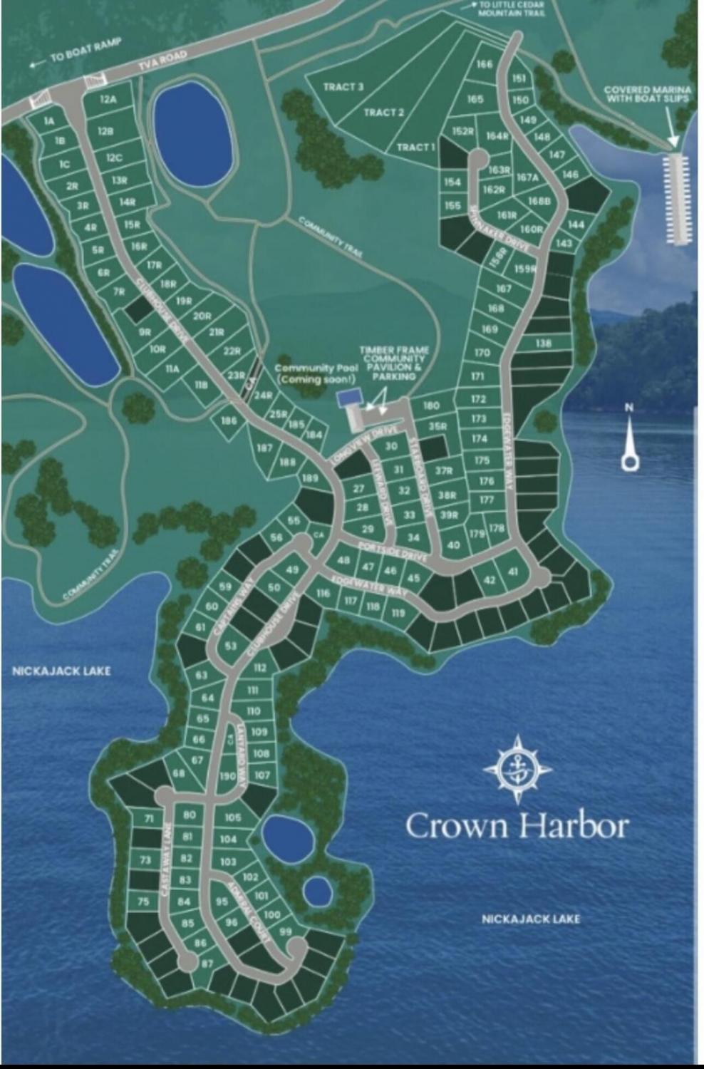 West on 24 from downtown Chattanooga to exit 158, left on TVA road, left into Crown Harbor onto Clubhouse drive, sign on property