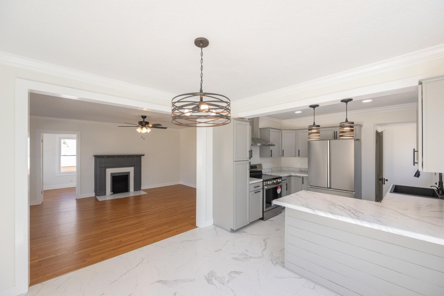 Completely updated inside and out, yet full of the character you don't find in new builds! This 3 bedroom, 2 bathroom home has been fully remodeled from top to bottom and is truly move in ready, located inside the Lexington city limits and directly across from Lexington High School! Updates include a new roof, HVAC system, windows, gas water heater, all new appliances, fixtures, along with a new driveway and parking pad. Step inside to a welcoming living room with a gas fireplace, refinished hardwood floors, and charming nooks that preserve the home's original character, with a laundry room and large storage closet just off the living space. Off to the right of the living room, the kitchen is the true show stopper, featuring satori porcelain tile, brand new cabinets and countertops, stainless steel appliances, and stylish finishes that anchor the home beautifully. Both bathrooms have been completely remodeled with matching satori porcelain tile and fresh, modern finishes. Two bedrooms are located on the main floor, while the upstairs third bedroom offers added privacy with its own bathroom, built ins, and access to a large floored attic perfect for storage. Additional highlights include a basement with walkout access ideal for a storm shelter, a fenced backyard, a 2 car carport, and city utilities including gas, city sewer, and trash pickup. Homes like this do not come around often, so call or text today to schedule your showing before it's gone!
