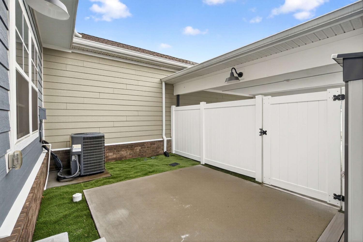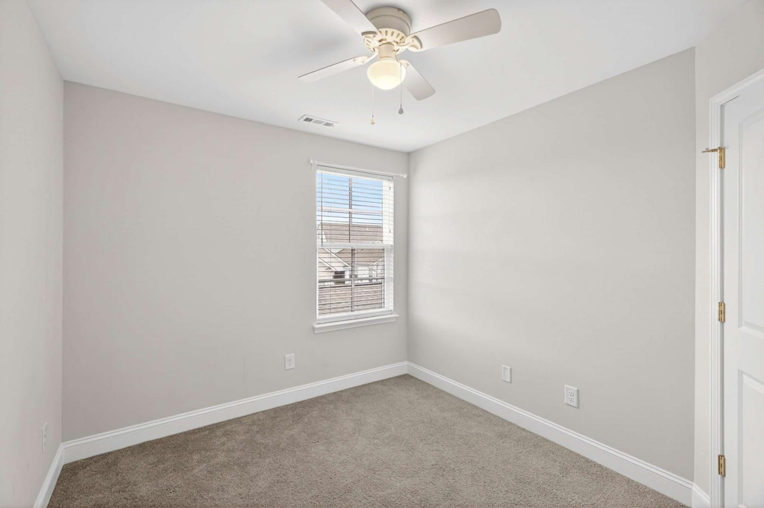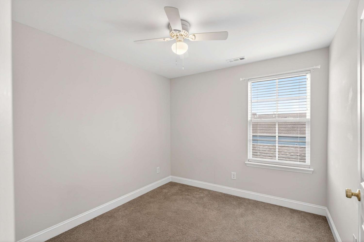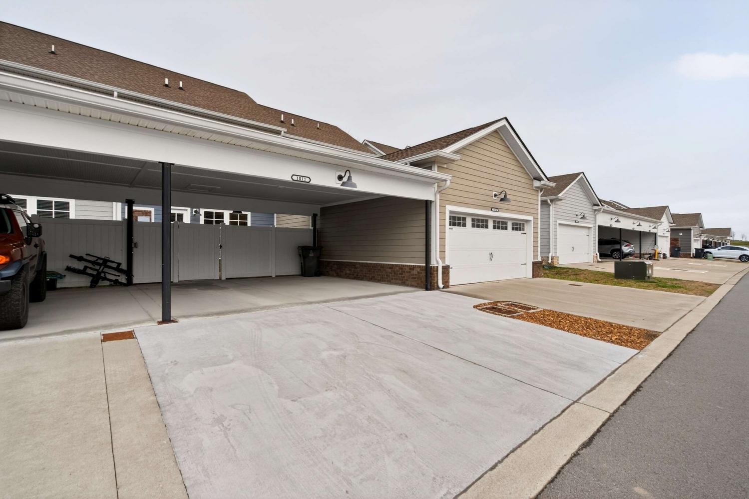 This townhome in the Carothers Crossing community offers comfortable living with thoughtful design throughout. The main level features a bright, open layout anchored by a living area that flows into the kitchen. The kitchen showcases contemporary cabinetry, generous storage, and a center island ideal for cooking, gathering, or casual meals. A convenient half bath completes the first floor. Upstairs, the primary suite has plenty of natural light, dual walk-in closets, and an en-suite bath featuring patterned tile floors and a tiled walk-in shower. Two additional rooms on the second level provide flexible space for bedrooms, home offices, or creative use, along with a well-appointed secondary bathroom. Step outside to a private, oversized back patio designed for low-maintenance outdoor enjoyment, complete with turf and space for grilling or entertaining. The patio offers direct access to the two-car carport, adding everyday convenience. Carothers Crossing residents enjoy a vibrant community atmosphere with amenities that include walking trails, a dog park, playground, neighborhood shops, and a community garden making this an ideal place to call home.
