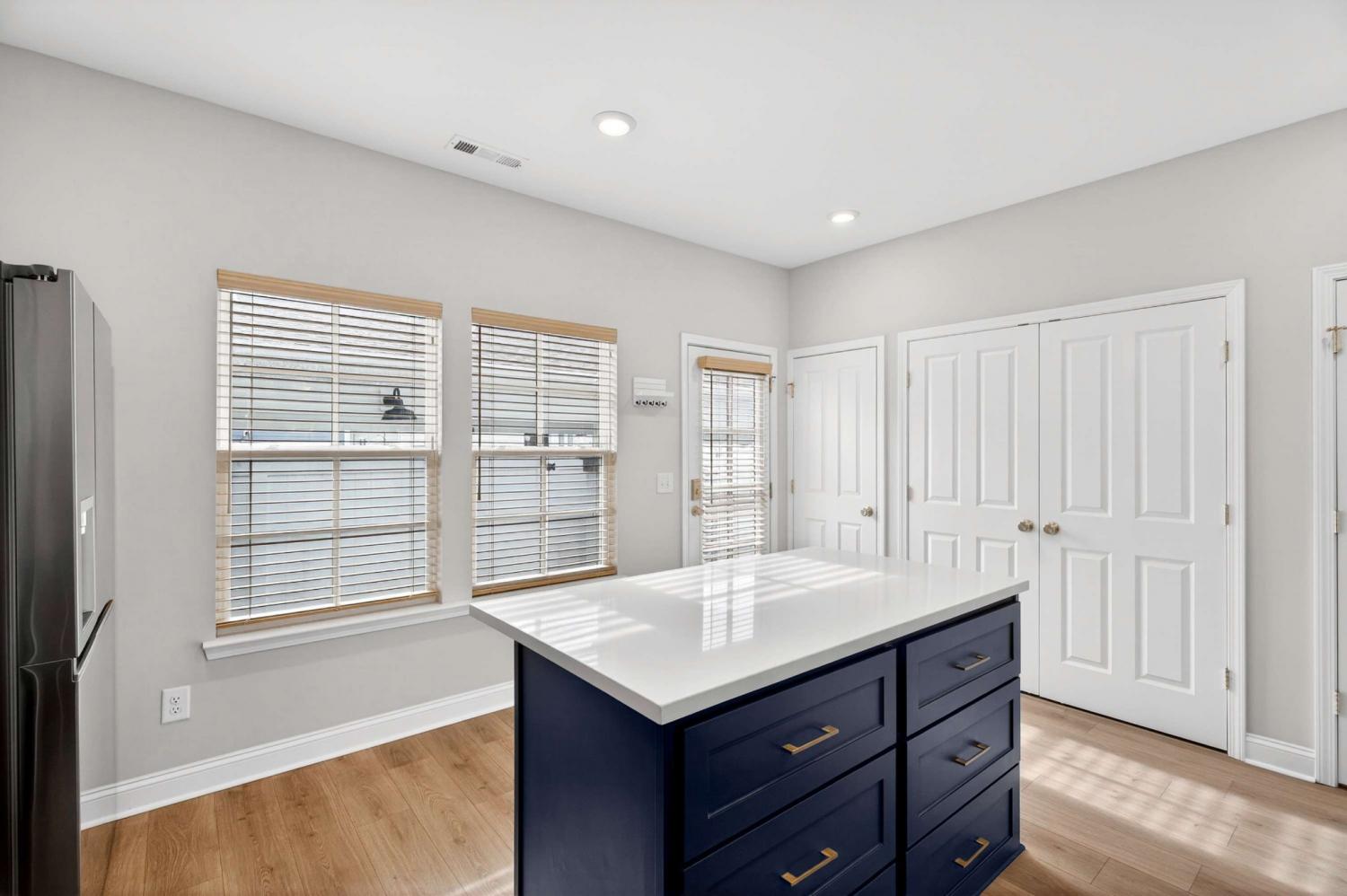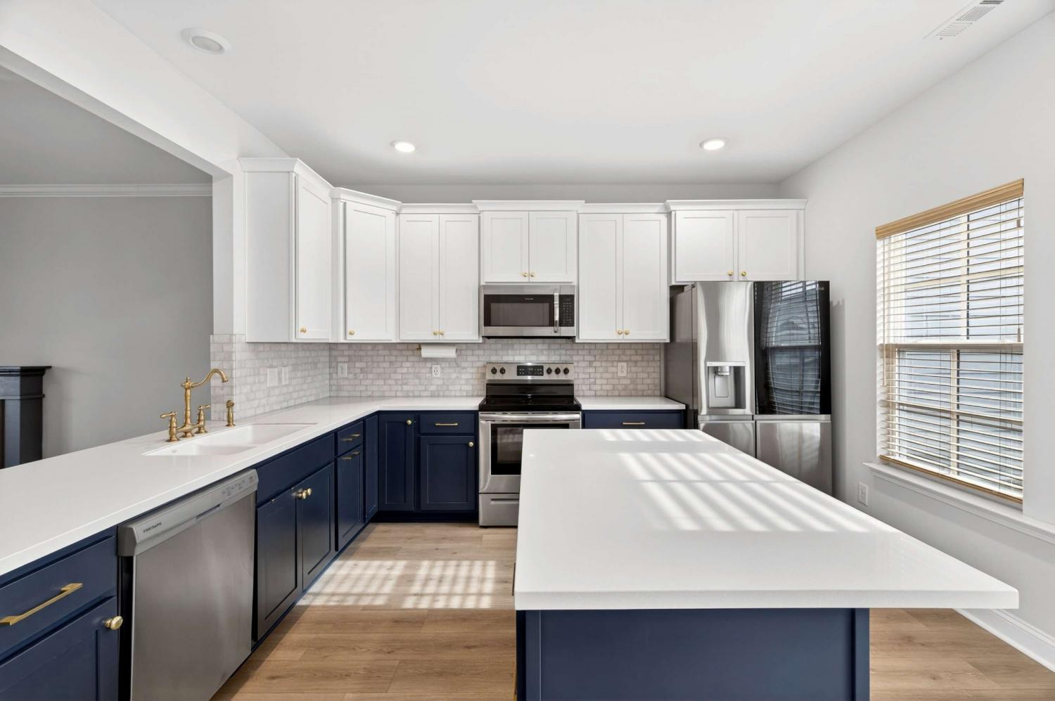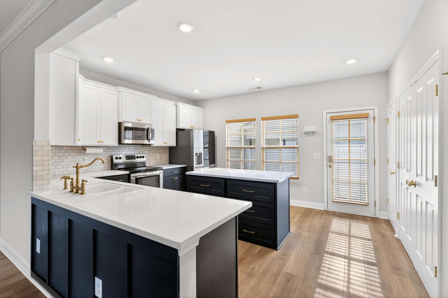 This townhome in the Carothers Crossing community offers comfortable living with thoughtful design throughout. The main level features a bright, open layout anchored by a living area that flows into the kitchen. The kitchen showcases contemporary cabinetry, generous storage, and a center island ideal for cooking, gathering, or casual meals. A convenient half bath completes the first floor. Upstairs, the primary suite has plenty of natural light, dual walk-in closets, and an en-suite bath featuring patterned tile floors and a tiled walk-in shower. Two additional rooms on the second level provide flexible space for bedrooms, home offices, or creative use, along with a well-appointed secondary bathroom. Step outside to a private, oversized back patio designed for low-maintenance outdoor enjoyment, complete with turf and space for grilling or entertaining. The patio offers direct access to the two-car carport, adding everyday convenience. Carothers Crossing residents enjoy a vibrant community atmosphere with amenities that include walking trails, a dog park, playground, neighborhood shops, and a community garden making this an ideal place to call home.