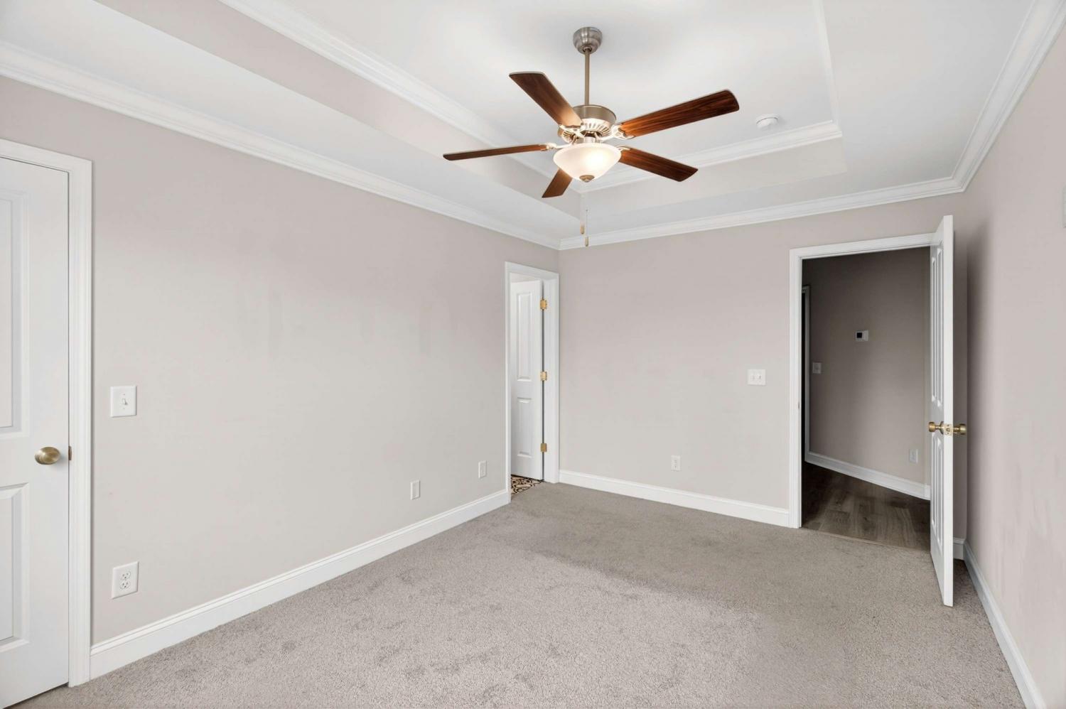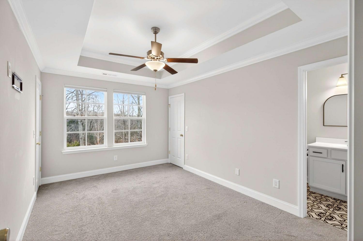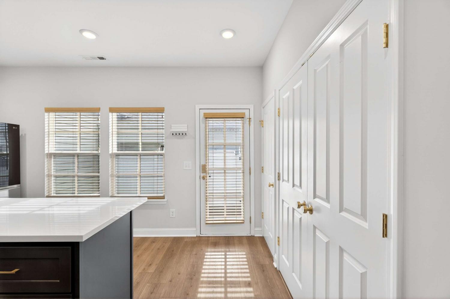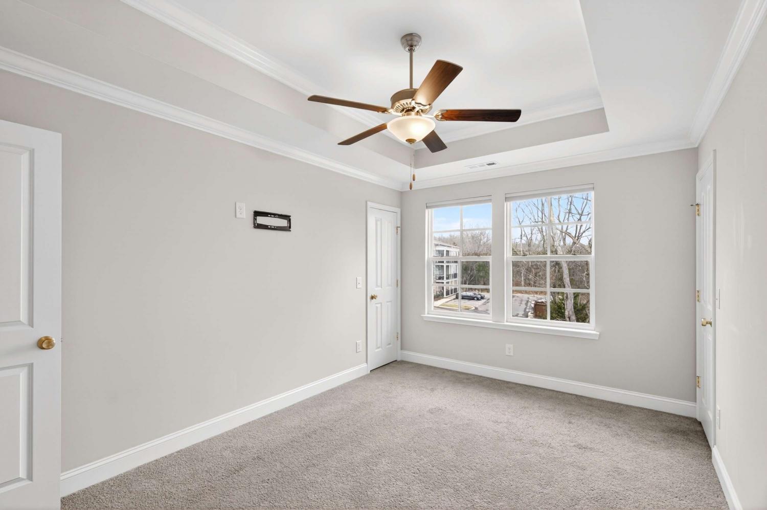 This townhome in the Carothers Crossing community offers comfortable living with thoughtful design throughout. The main level features a bright, open layout anchored by a living area that flows into the kitchen. The kitchen showcases contemporary cabinetry, generous storage, and a center island ideal for cooking, gathering, or casual meals. A convenient half bath completes the first floor. Upstairs, the primary suite has plenty of natural light, dual walk-in closets, and an en-suite bath featuring patterned tile floors and a tiled walk-in shower. Two additional rooms on the second level provide flexible space for bedrooms, home offices, or creative use, along with a well-appointed secondary bathroom. Step outside to a private, oversized back patio designed for low-maintenance outdoor enjoyment, complete with turf and space for grilling or entertaining. The patio offers direct access to the two-car carport, adding everyday convenience. Carothers Crossing residents enjoy a vibrant community atmosphere with amenities that include walking trails, a dog park, playground, neighborhood shops, and a community garden making this an ideal place to call home.