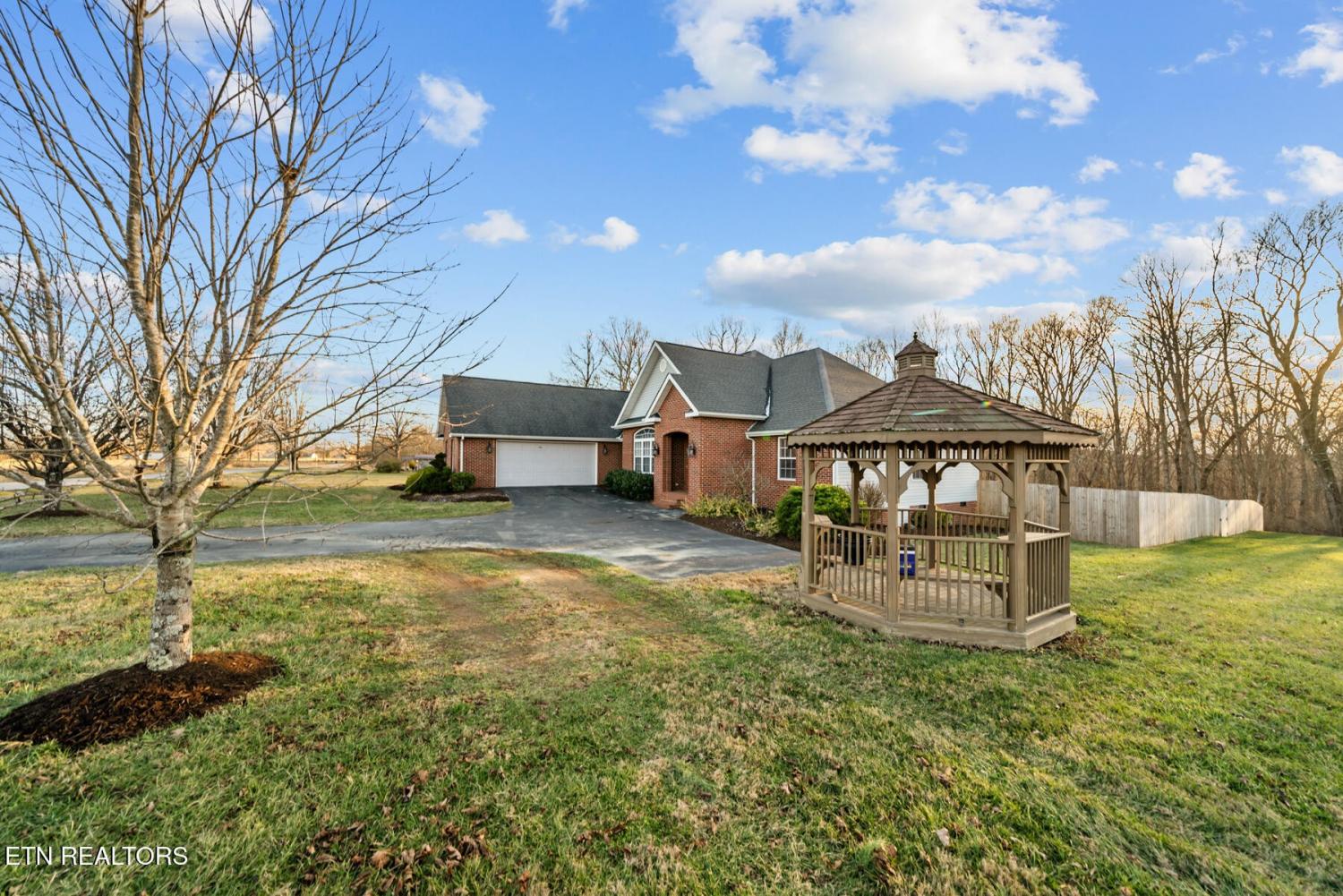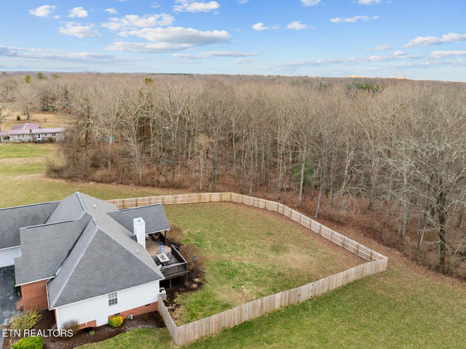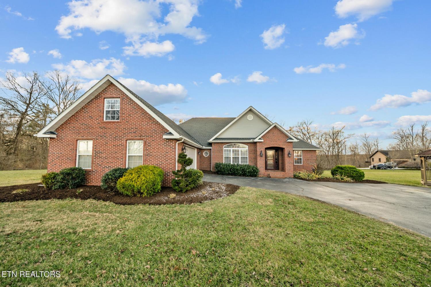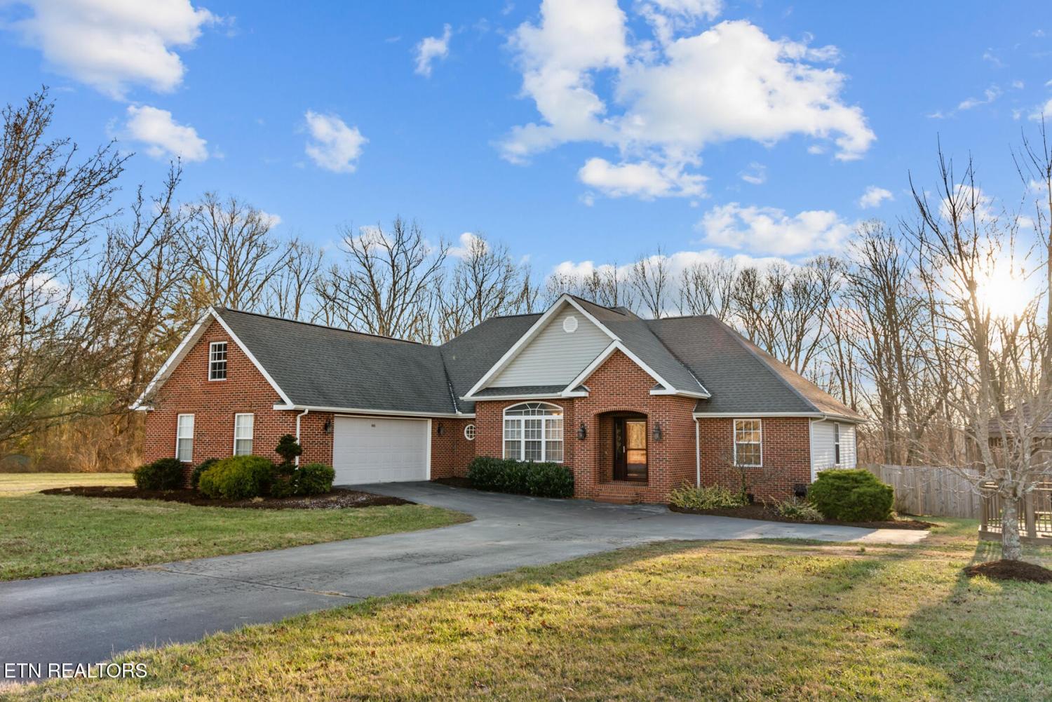Set on 3.59 acres with wooded surroundings, this brick 3-bedroom, 2-bath home offers a balance of privacy, interior upgrades, and well-maintained outdoor space. The driveway leads to a clean, traditional exterior with mature landscaping and an attached garage. Inside, the home features an open, functional layout with vaulted ceilings, recessed lighting, and hardwood flooring throughout the main living areas. The living room centers around a gas fireplace with a custom surround and mantel, bordered by multiple windows that bring in natural light and views of the backyard. The kitchen was updated in 2019 and includes quartz countertops, white cabinetry with ample storage, stainless steel appliances, tile backsplash, and a large island that provides both workspace and seating. A dining area sits just off the kitchen with direct access to the back deck. A wood beam detail visually separates the kitchen and dining space while maintaining an open flow. The primary bedroom is spacious and features a tray ceiling, hardwood flooring, and room for additional furnishings. The en suite bathroom includes a quartz-topped double vanity, updated fixtures, and a tiled walk-in shower with glass enclosure and built-in bench. Two additional bedrooms are located on the opposite side of the home, offering separation from the primary suite, with a full guest bathroom featuring an oversized double vanity and updated finishes. Outdoor living space includes a partially covered back deck and overlooking a fenced backyard area with wooded views beyond. The lot extends past the fenced portion, providing additional usable acreage and privacy. Mechanical and structural updates include a 1-year-old HVAC system, a tankless gas water heater approximately 2.5 years old, an encapsulated crawl space completed in 2021, and a new front door installed in 2022. The garage has been upgraded with an epoxy-coated floor and a gas wall heater, making it suitable for year-round use.