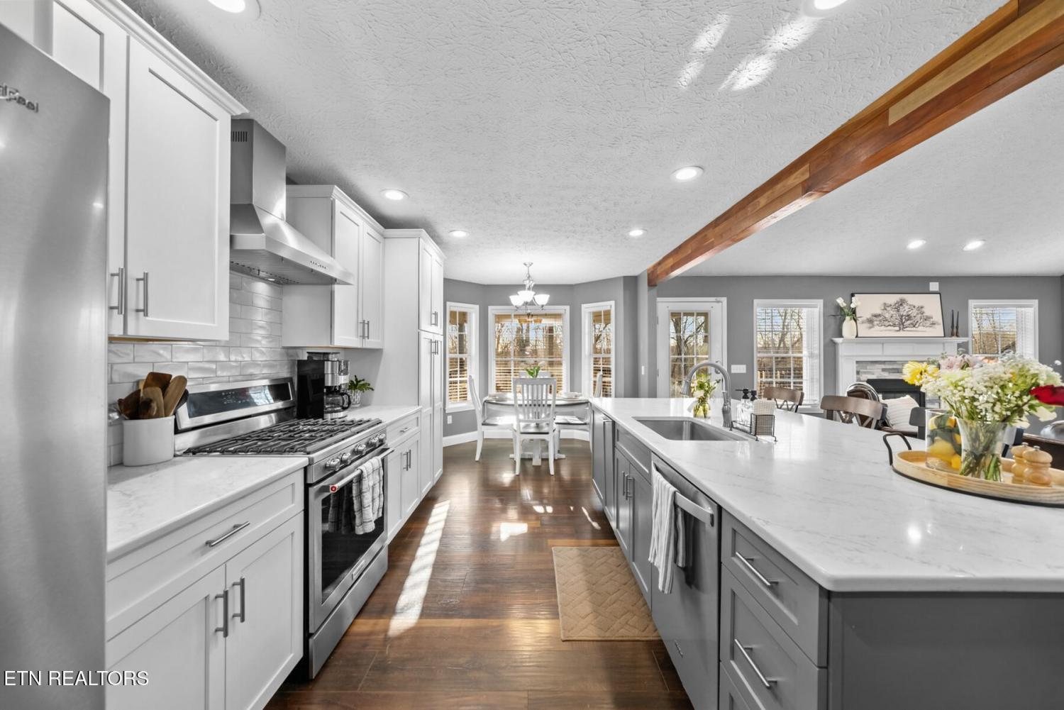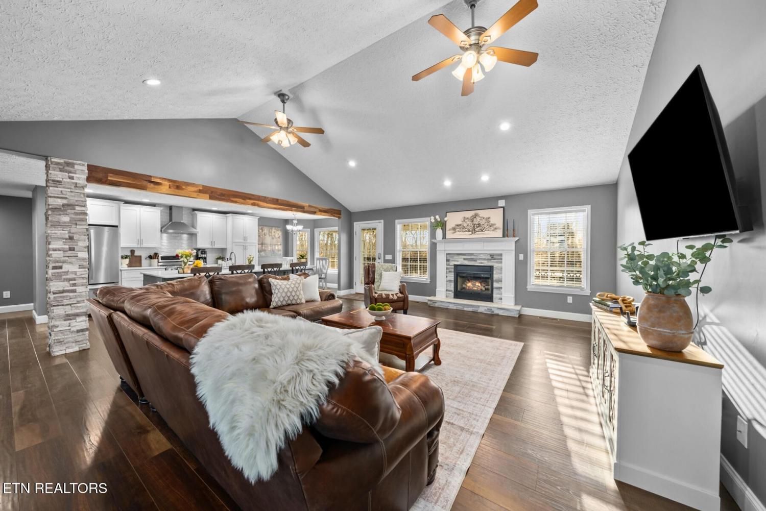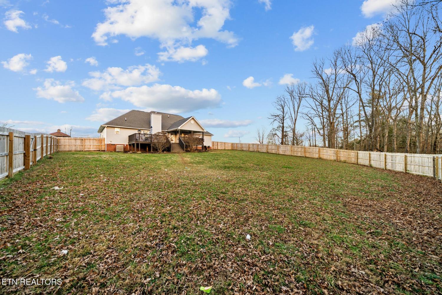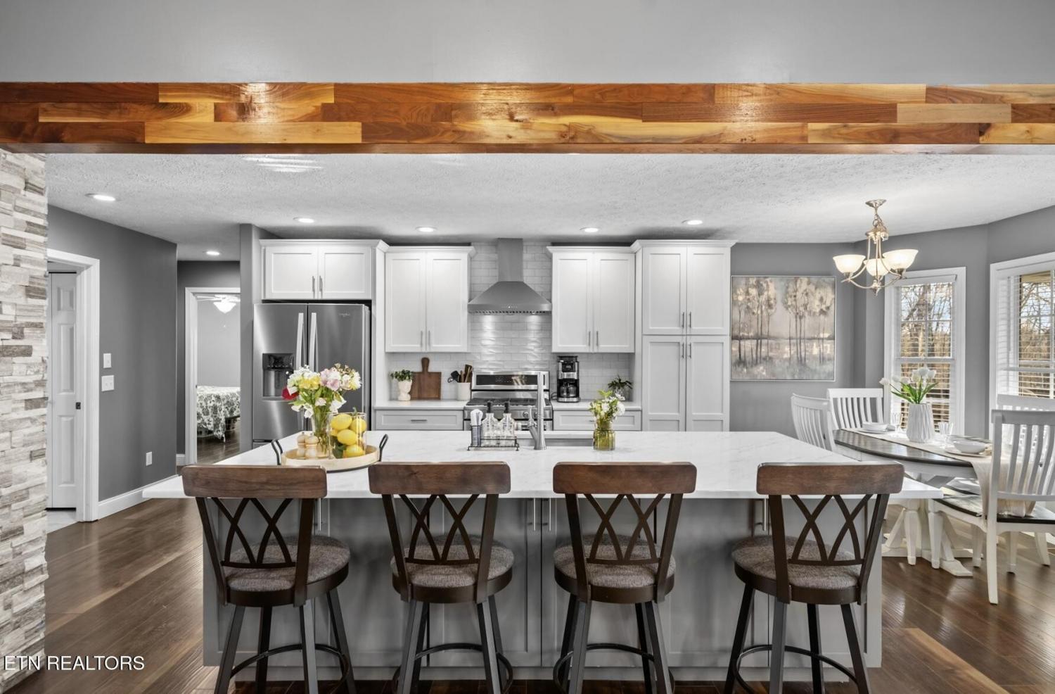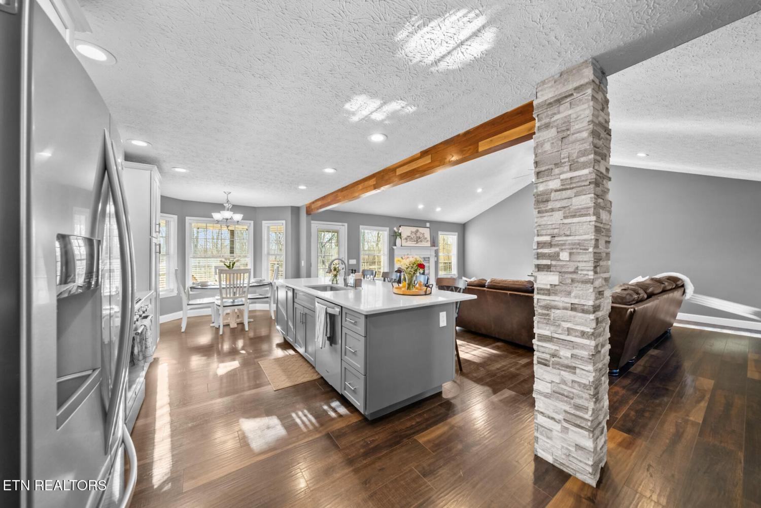 Set on 3.59 acres with wooded surroundings, this brick 3-bedroom, 2-bath home offers a balance of privacy, interior upgrades, and well-maintained outdoor space. The driveway leads to a clean, traditional exterior with mature landscaping and an attached garage. Inside, the home features an open, functional layout with vaulted ceilings, recessed lighting, and hardwood flooring throughout the main living areas. The living room centers around a gas fireplace with a custom surround and mantel, bordered by multiple windows that bring in natural light and views of the backyard. The kitchen was updated in 2019 and includes quartz countertops, white cabinetry with ample storage, stainless steel appliances, tile backsplash, and a large island that provides both workspace and seating. A dining area sits just off the kitchen with direct access to the back deck. A wood beam detail visually separates the kitchen and dining space while maintaining an open flow. The primary bedroom is spacious and features a tray ceiling, hardwood flooring, and room for additional furnishings. The en suite bathroom includes a quartz-topped double vanity, updated fixtures, and a tiled walk-in shower with glass enclosure and built-in bench. Two additional bedrooms are located on the opposite side of the home, offering separation from the primary suite, with a full guest bathroom featuring an oversized double vanity and updated finishes. Outdoor living space includes a partially covered back deck and overlooking a fenced backyard area with wooded views beyond. The lot extends past the fenced portion, providing additional usable acreage and privacy. Mechanical and structural updates include a 1-year-old HVAC system, a tankless gas water heater approximately 2.5 years old, an encapsulated crawl space completed in 2021, and a new front door installed in 2022. The garage has been upgraded with an epoxy-coated floor and a gas wall heater, making it suitable for year-round use.