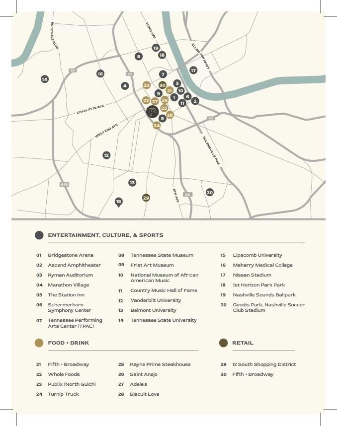 From I-40/I-65 towards downtown take the Demonbreun exit. Turn left on 13th Ave. Building is at the corner of Demonbreun at 13th Ave. Guest parking is available in the attached garage. There are garage entrances off of 13th Ave. S. and off of McGavock.