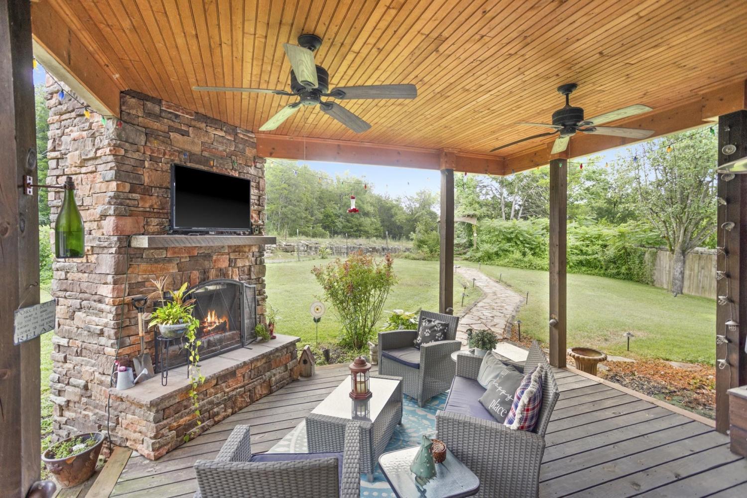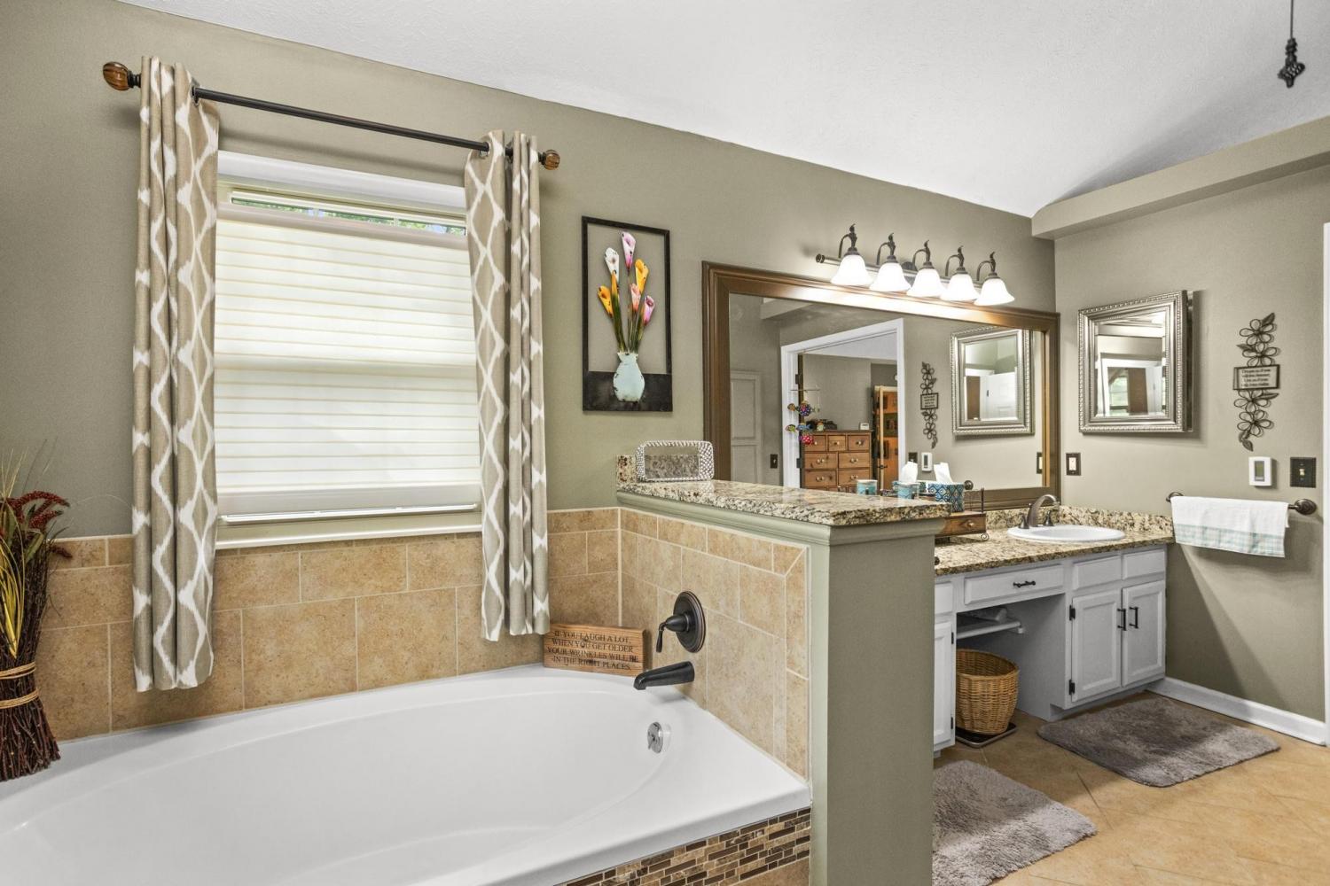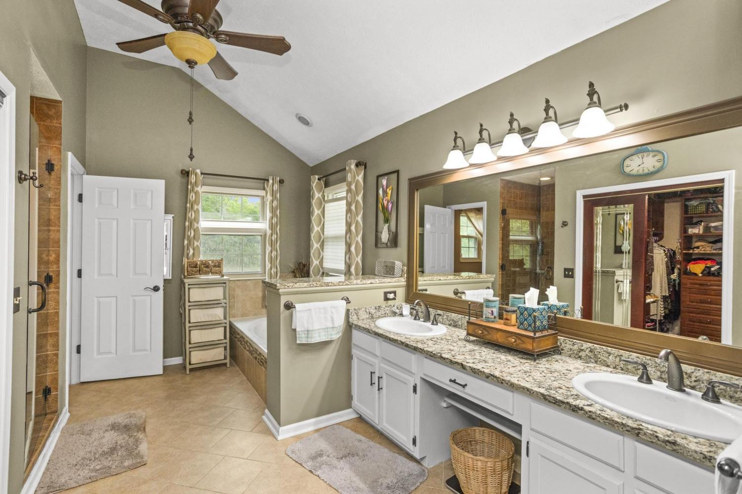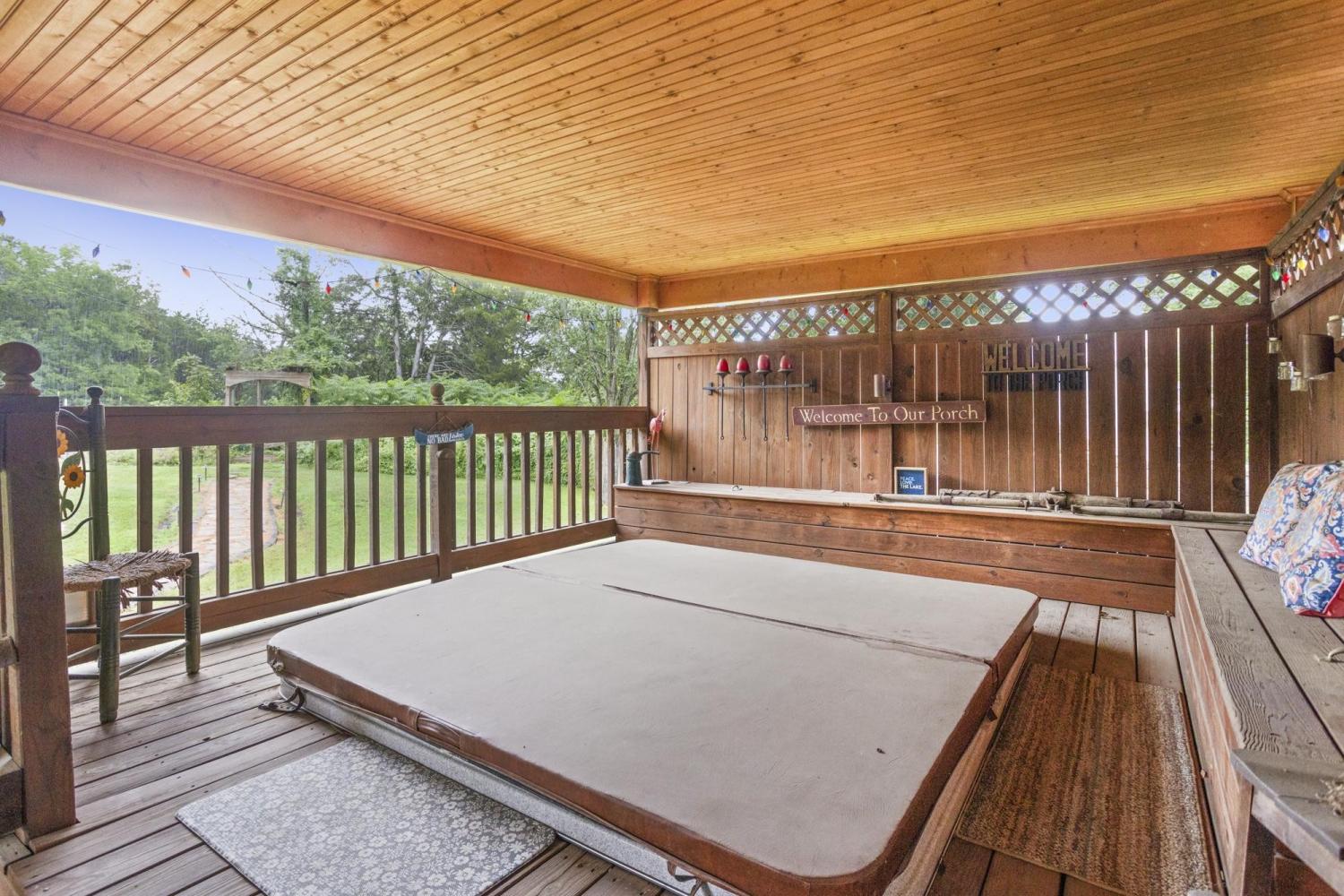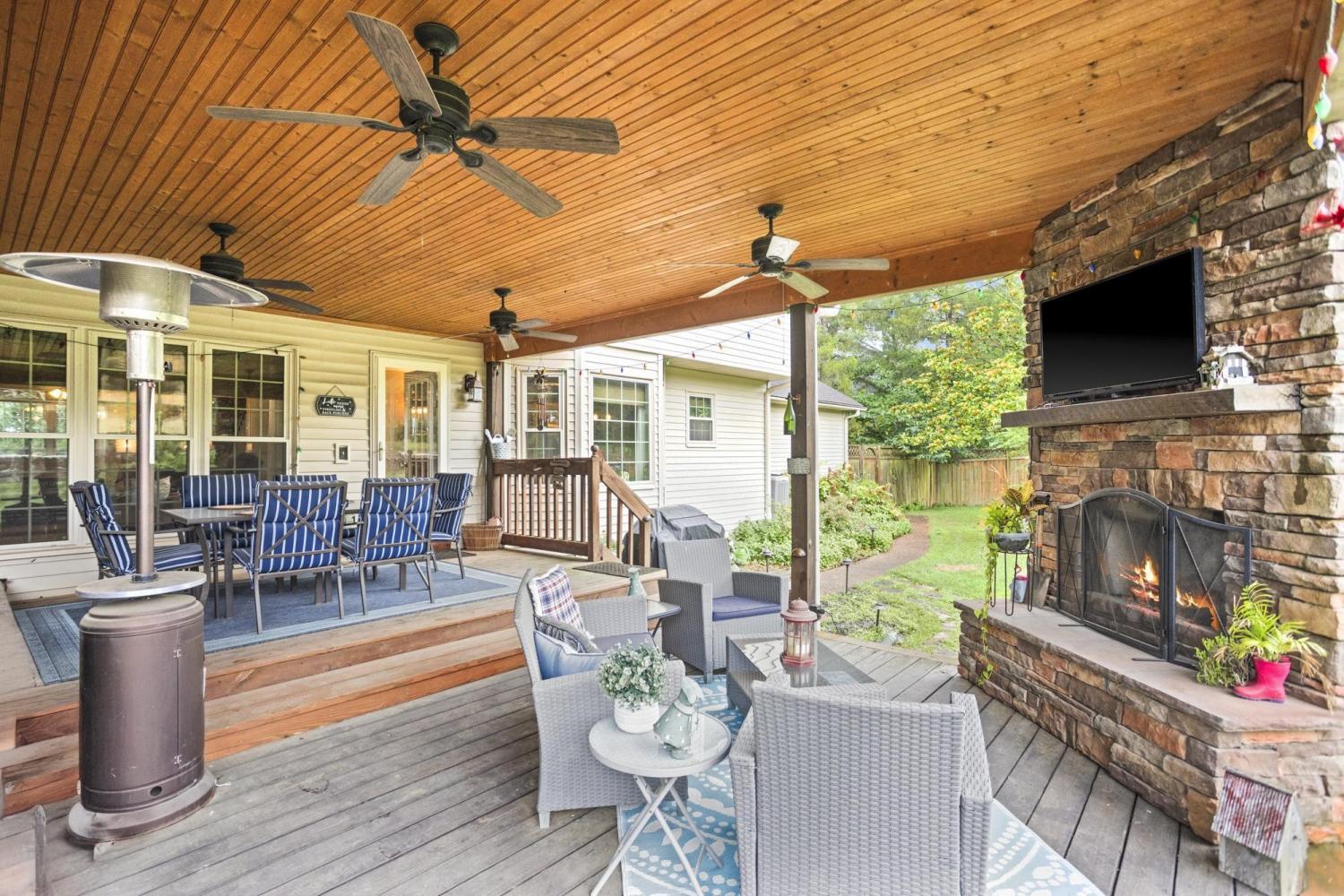 Private retreat located on a quiet cul-de-sac with an expansive covered deck featuring a stone fireplace, hot tub, and complete privacy. Interior highlights include a kitchen with granite countertops and stainless steel appliances, an oversized family room, and a spacious primary suite with walk-in closet, soaking tub, and heated tile floors. Oversized attached garage with additional storage plus two backyard sheds.