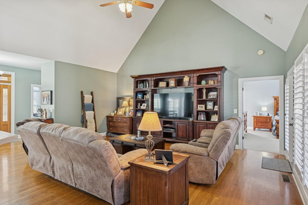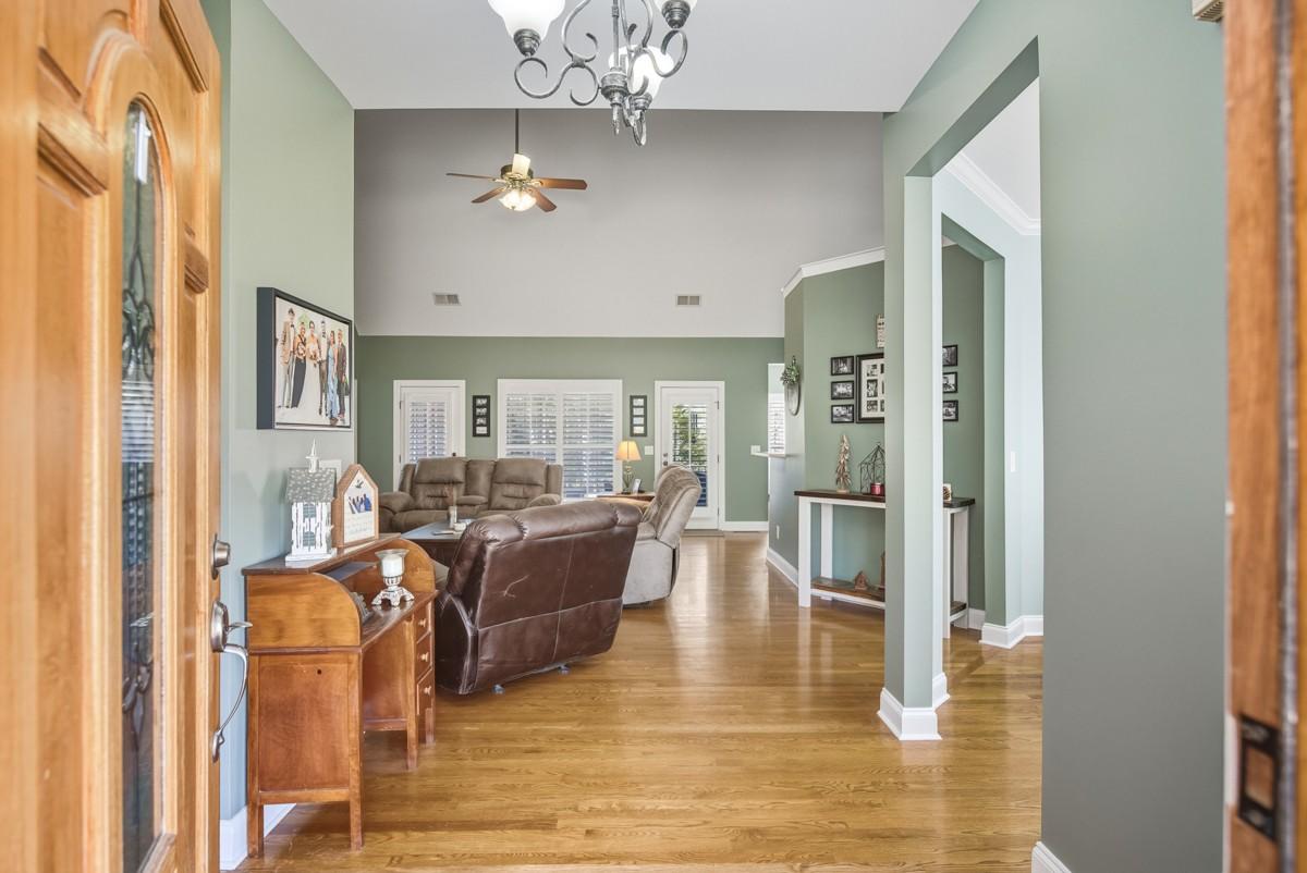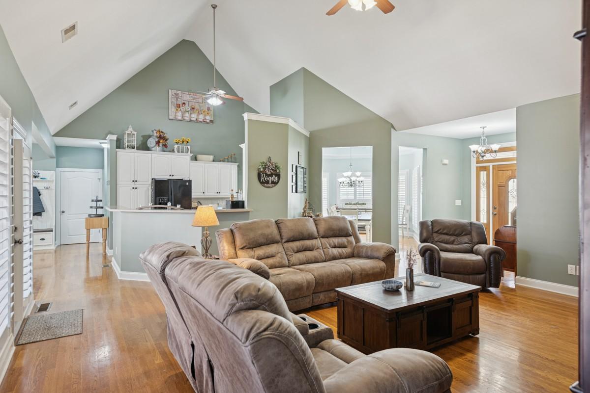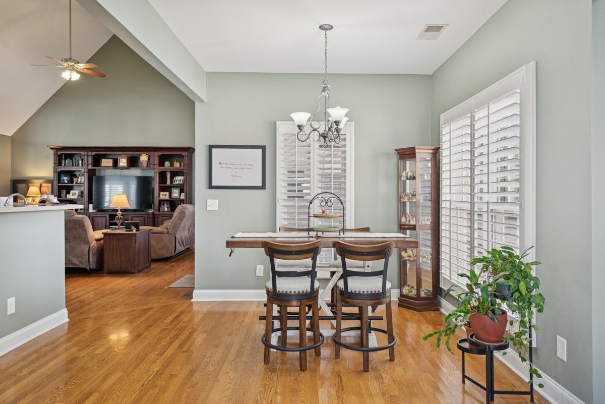 One Level lifestyle with an extra Large Bonus over 2 Car Garage-Open Floor Plan joins the Kitchen, extended Great Room and casual Dining all sporting Genuine Hardwoods, Formal Dining with Bay windows- Plantation Shutters throughout-4 Bedrms, with Private Owner's Suite-Half bath for Guests, Truly low maintenance Landscape and Yard