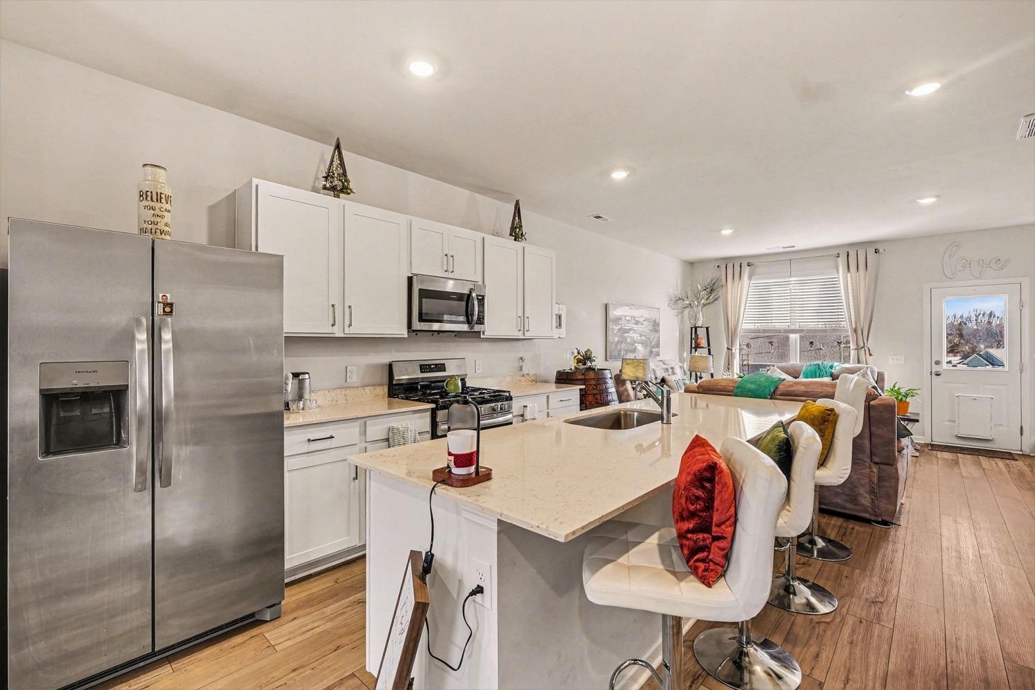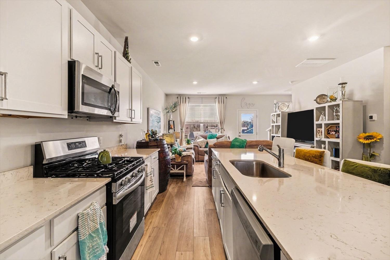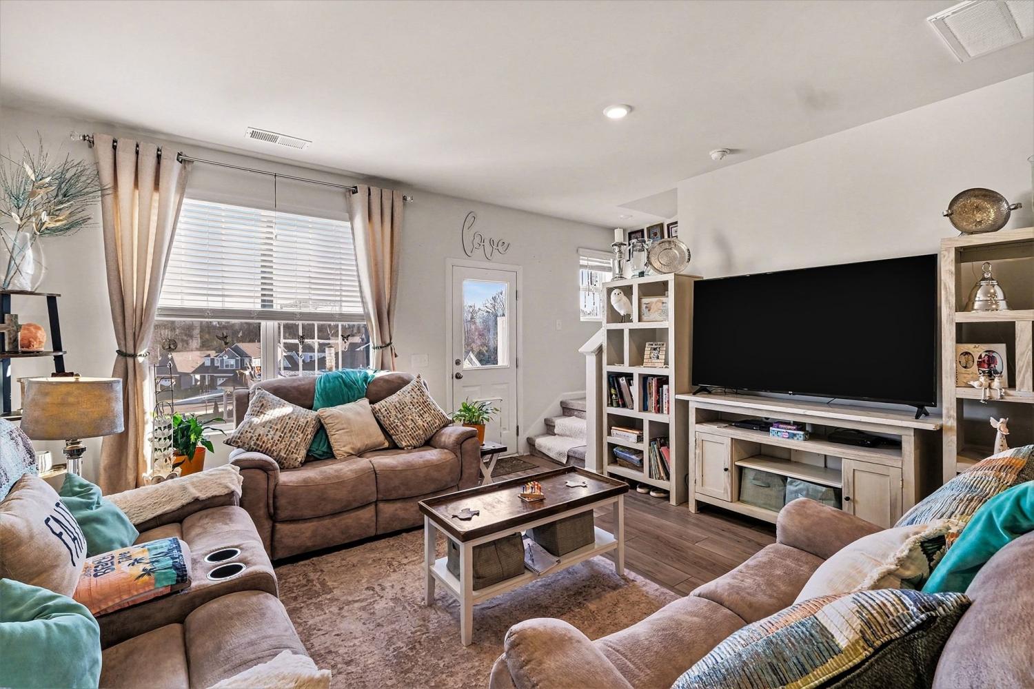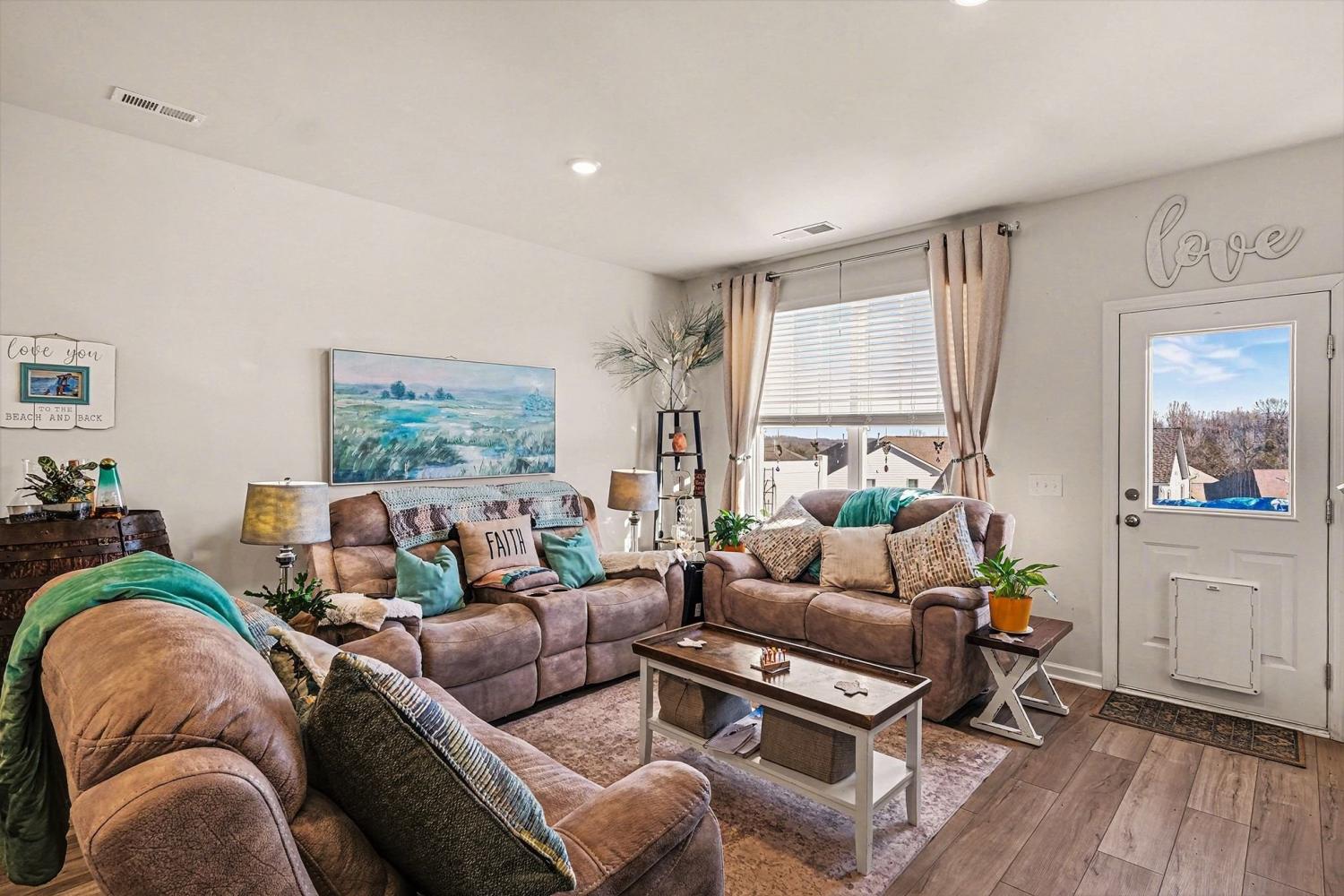 Like-new townhome just minutes from Spring Hill, offering modern style and a rare premium view. The open-concept layout features a chef-inspired kitchen with quartz countertops, oversized island seating, stainless steel appliances including a gas range, luxury vinyl plank flooring, 2-inch blinds, Ring doorbell, and smart thermostats. Upstairs, the primary suite includes dual vanities, a spa-like walk-in shower, and a walk-in closet, plus two additional bedrooms, a second full bath, and convenient upstairs laundry. Enjoy a spacious deck with a peaceful view—perfect for relaxing or entertaining. Community amenities include a newly built pool, two assigned parking spaces, guest parking, and a location close to schools, shopping, dining, and less than 10 minutes from downtown Spring Hill.