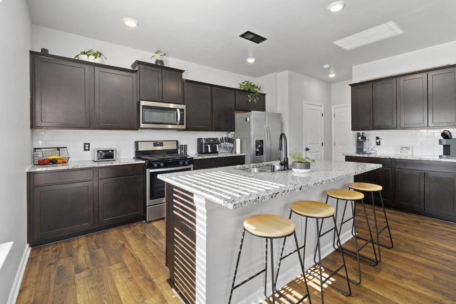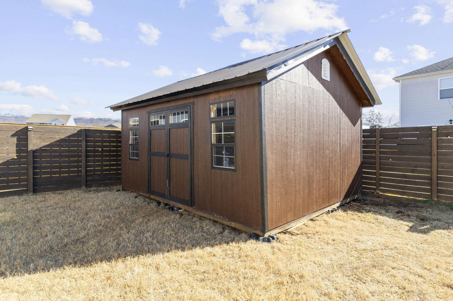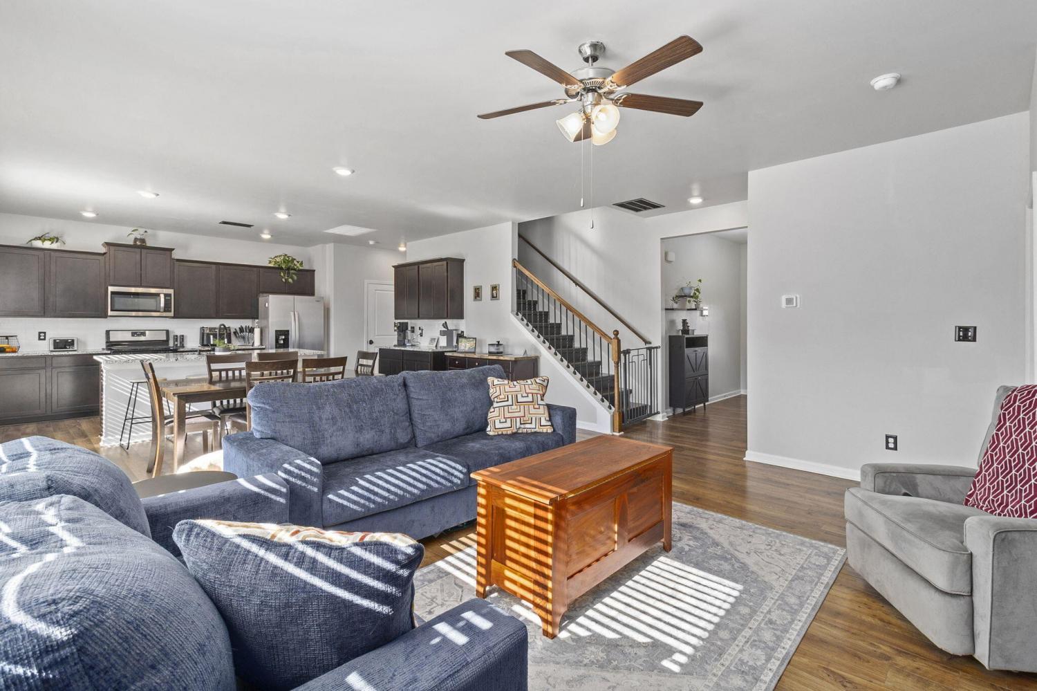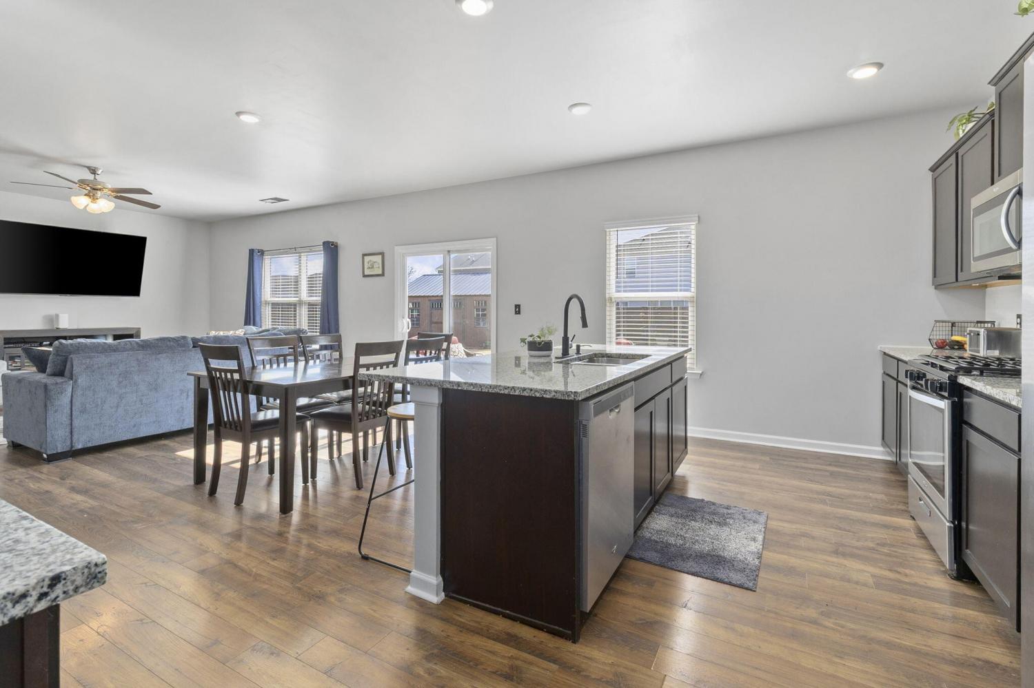 Step inside to a grand foyer with soaring ceilings that opens into a massive great room, designed with a seamless flow into the expansive kitchen and dining areas. The striking aesthetic features dark cabinetry providing a sophisticated contrast to light walls and gleaming granite countertops. The chef's kitchen boasts a massive island with bar seating, all-stainless appliances, and a premium gas cooktop. Storage is abundant with two pantries, including a walk-in with custom wood shelving. The large dining room offers picturesque views of the PRIVACY-FENCED BACKYARD and the majestic silhouette of White Oak Mountain. Step outside to the patio to enjoy the fresh air and mountain views; the owners have even added a dedicated gas line for easy grill hookups. The MAIN-LEVEL OWNER'S SUITE is tucked at the rear for maximum privacy and features a luxurious ensuite with double vanities, a large shower, and a huge walk-in closet with custom wood shelving. A well-appointed laundry room with custom cabinetry and a guest powder room are also conveniently located on the main floor. Newly added hardwood stairs lead to the second level, featuring a large, versatile loft perfect for a den or game room. This floor includes four additional spacious bedrooms and a full bath, providing ample room for family or guests. With over 2,600 sq ft of well-maintained living space, a two-car garage, and a BACKYARD OUTBUILDING for projects or storage, this home perfectly balances grand entertaining with functional, private escapes.