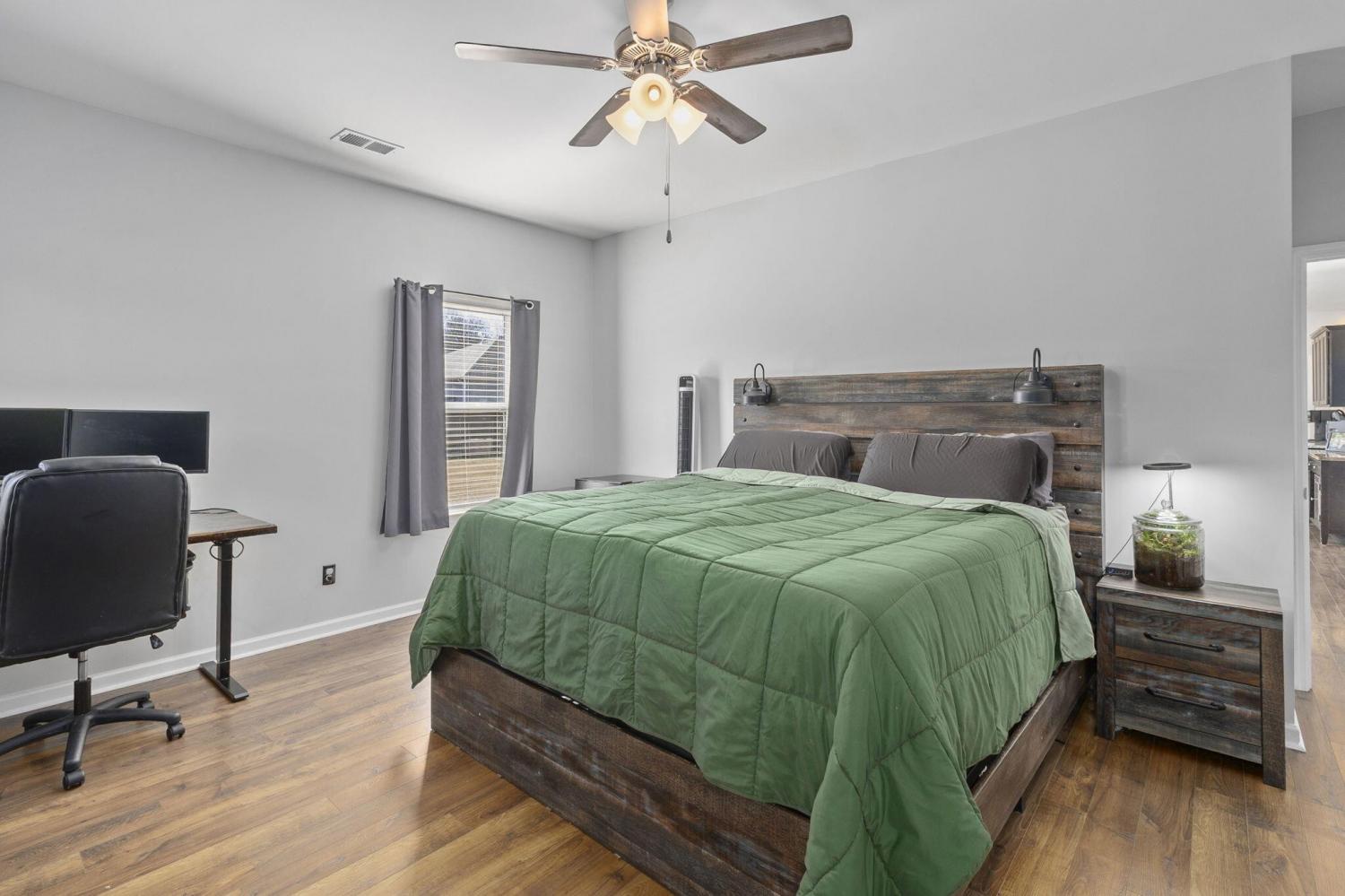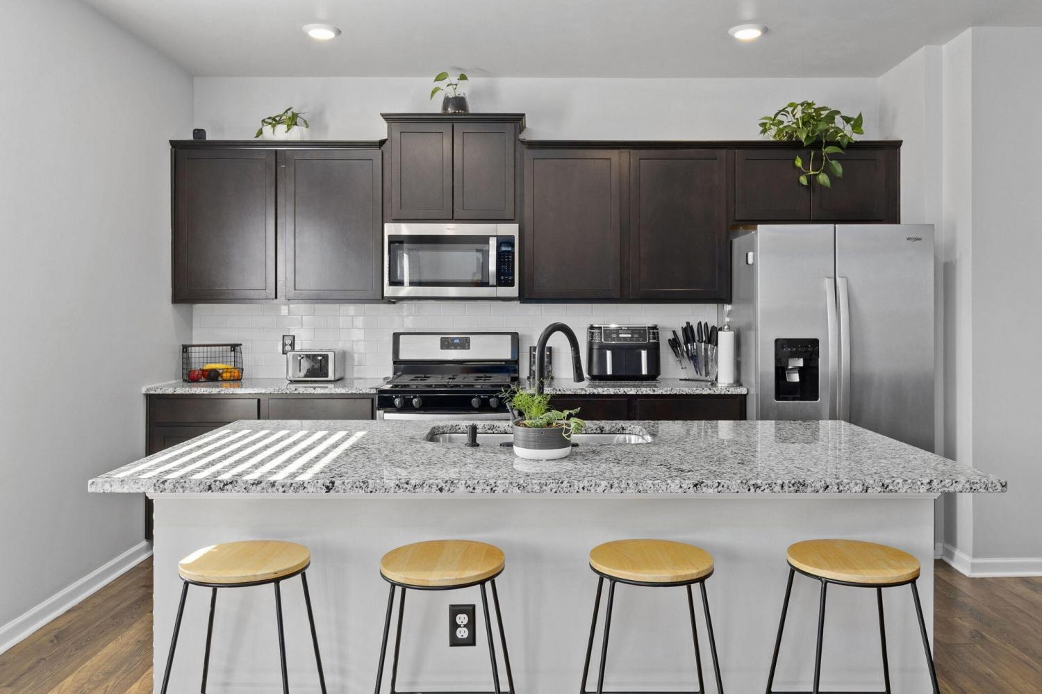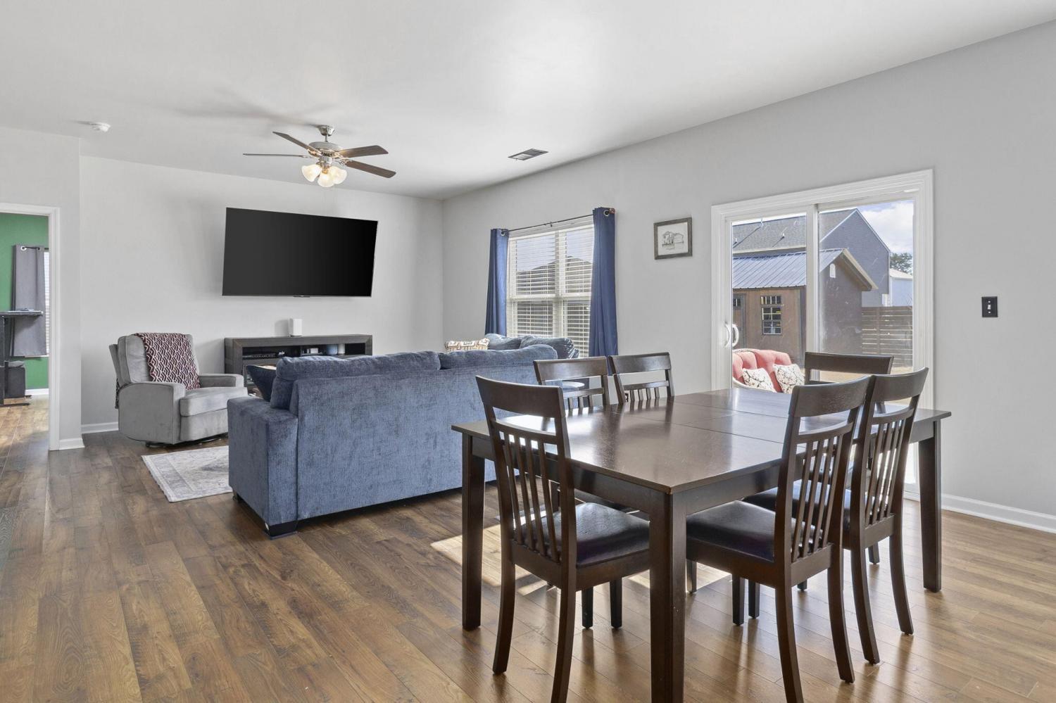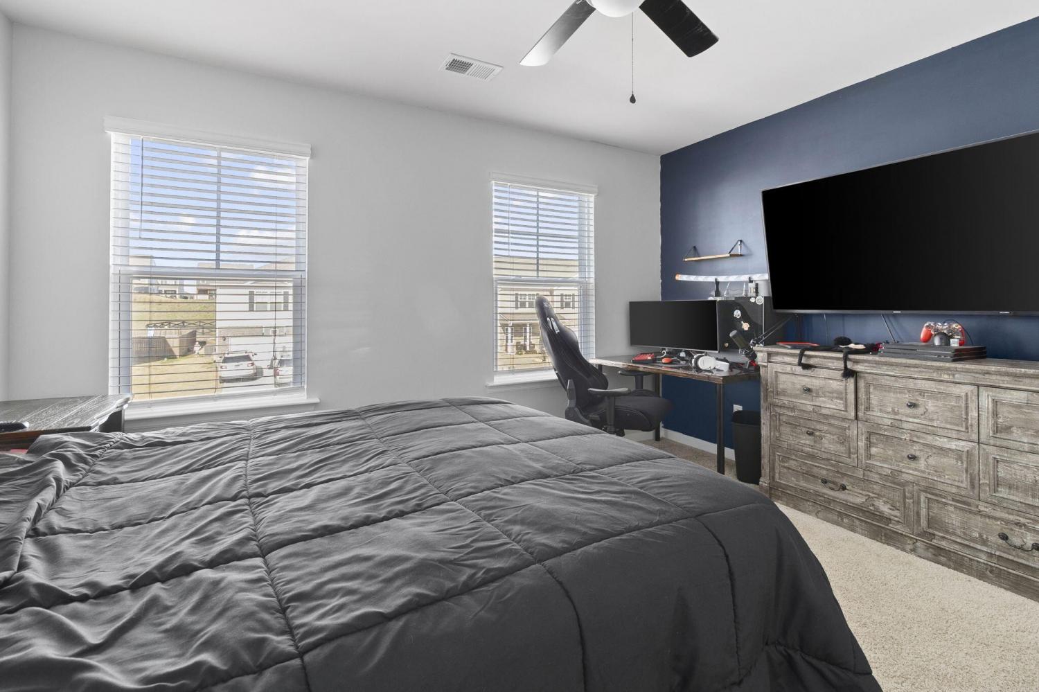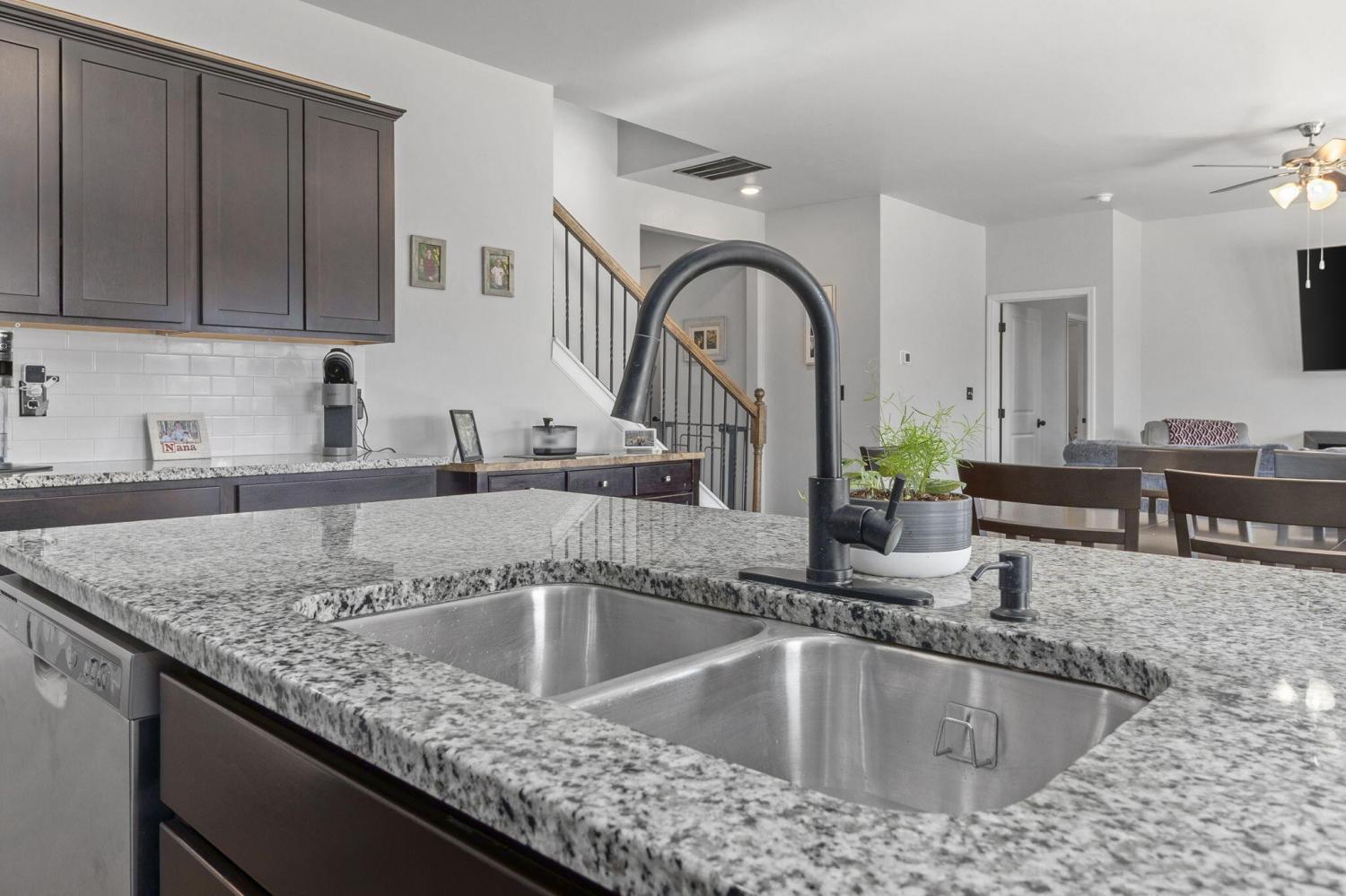 Step inside to a grand foyer with soaring ceilings that opens into a massive great room, designed with a seamless flow into the expansive kitchen and dining areas. The striking aesthetic features dark cabinetry providing a sophisticated contrast to light walls and gleaming granite countertops. The chef's kitchen boasts a massive island with bar seating, all-stainless appliances, and a premium gas cooktop. Storage is abundant with two pantries, including a walk-in with custom wood shelving. The large dining room offers picturesque views of the PRIVACY-FENCED BACKYARD and the majestic silhouette of White Oak Mountain. Step outside to the patio to enjoy the fresh air and mountain views; the owners have even added a dedicated gas line for easy grill hookups. The MAIN-LEVEL OWNER'S SUITE is tucked at the rear for maximum privacy and features a luxurious ensuite with double vanities, a large shower, and a huge walk-in closet with custom wood shelving. A well-appointed laundry room with custom cabinetry and a guest powder room are also conveniently located on the main floor. Newly added hardwood stairs lead to the second level, featuring a large, versatile loft perfect for a den or game room. This floor includes four additional spacious bedrooms and a full bath, providing ample room for family or guests. With over 2,600 sq ft of well-maintained living space, a two-car garage, and a BACKYARD OUTBUILDING for projects or storage, this home perfectly balances grand entertaining with functional, private escapes.