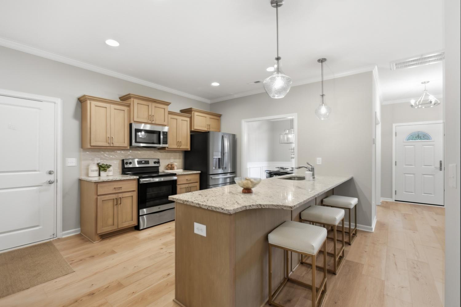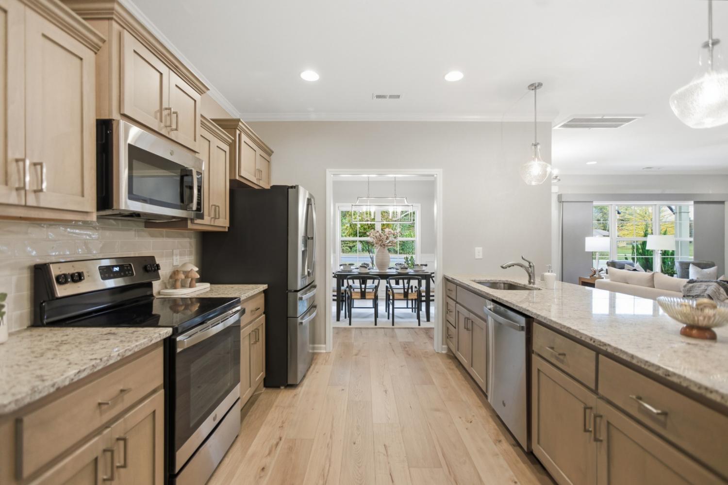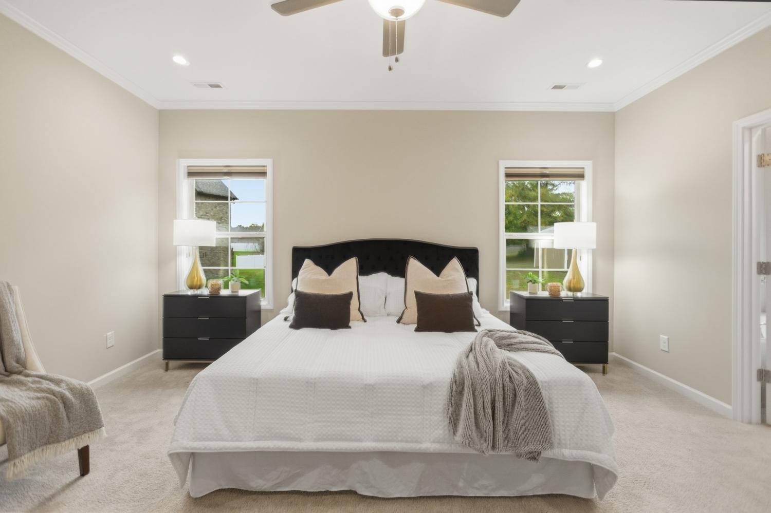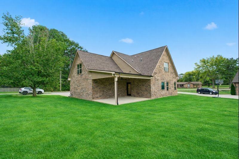 Welcome home to this exquisite 3-bedroom, 2.5-bath all-brick residence, where timeless craftsmanship meets elegant design. Step inside to discover a spacious open-concept layout that seamlessly connects the living room, kitchen, and dining areas—ideal for entertaining and everyday living. The gourmet kitchen boasts premium appliances (all of which remain), ample cabinetry, and a large island perfect for gatherings. The primary suite, conveniently located on the main level, features double vanities, a custom-tiled shower, and a relaxing soaker tub—your own private retreat. Throughout the home, you’ll find custom blinds, refined finishes, and thoughtful upgrades that elevate every detail. The oversized bonus room offers versatile space for a media room, home office, or playroom. Additional highlights include a Renewal by Andersen front door, an epoxy-coated garage floor, and a mini barn providing extra storage or workshop potential. Meticulously maintained and move-in ready, this home combines luxury, functionality, and comfort in every corner.